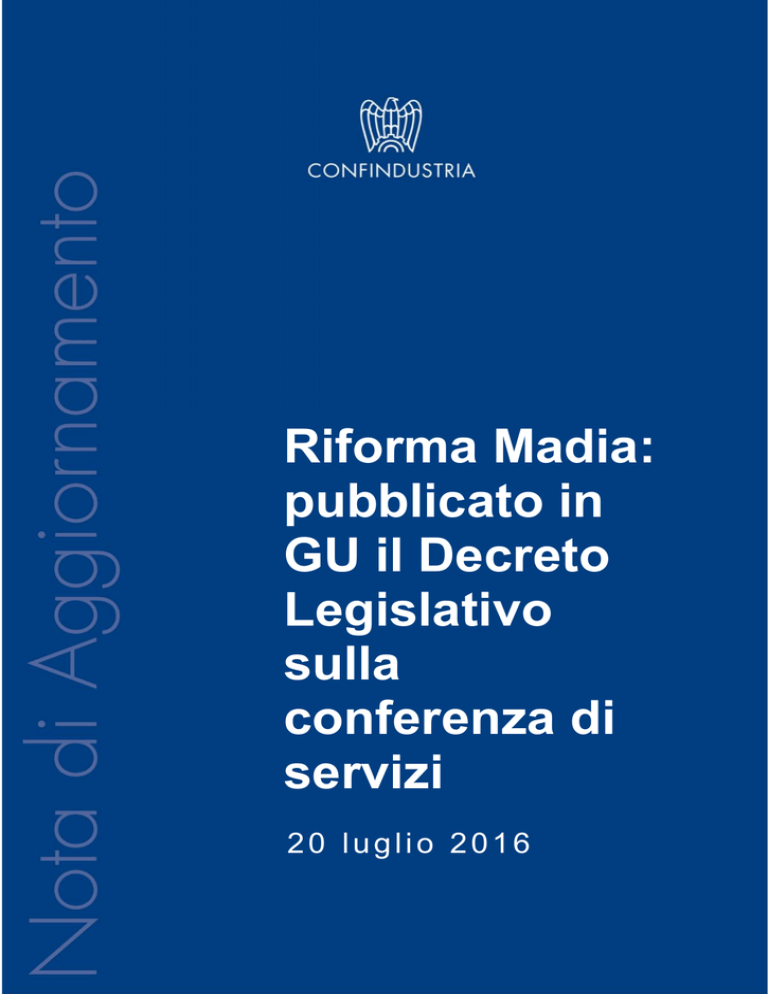 Riforma Madia: pubblicato in GU il Decreto Legislativo sulla conferenza di servizi 20 luglio 2016 Riforma Madia: pubblicato in GU il Decreto Legislativo sulla conferenza di servizi È stato pubblicato sulla Gazzetta Ufficiale (GU – Serie generale n. 162 del 13 luglio 2016), il Decreto Legislativo n. 127/2016, contenente la riforma organica della disciplina della conferenza di servizi (di seguito, anche decreto). Il D.Lgs, che dà attuazione all’art. 2 della Legge n. 124/2015, cd. Legge Madia, entrerà in vigore dal 28 luglio 2016 e si applicherà ai procedimenti amministrativi avviati successivamente a tale data. Il decreto riscrive la disciplina della conferenza di servizi contenuta nella legge n. 241/1990, puntando a: riordinare il quadro normativo, che dal 1990 è stato oggetto di ripetute e poco coordinate modifiche; semplificare l’istituto e risolvere le criticità riscontrate nella prassi (sul punto, v. “Iter autorizzativi e semplificazione: la Conferenza di servizi. Analisi empirica e indagine sul campo”1. Rispetto alla disciplina vigente, il D.Lgs delinea un modello di conferenza di servizi più efficace e più in linea con le esigenze di celerità del mondo imprenditoriale. In particolare, il decreto: ridefinisce i tipi di conferenza di servizi, disciplinando quella: i) istruttoria, che può essere indetta per l’esame contestuale di più interessi coinvolti in un procedimento o in più procedimenti connessi, riguardanti le stesse attività o risultati (art. 14, co. 1); ii) decisoria, che deve essere sempre indetta qualora la conclusione positiva del procedimento, o l’avvio di un’attività privata, sia subordinata all’acquisizione di più atti di assenso resi da diverse amministrazioni, inclusi i gestori di beni o servizi pubblici (art. 14, co. 2); iii) preliminare, che ha a oggetto progetti di particolare complessità o di insediamenti produttivi e può essere indetta per verificare le condizioni per ottenere - in un successivo procedimento - gli atti di assenso necessari alla loro realizzazione. La conferenza di servizi preliminare è indetta su motivata richiesta dell’interessato e si svolge sulla base della documentazione prodotta da quest’ultimo. Le determinazioni rese in tale sede possono essere motivatamente modificate o integrate solo in presenza di significativi elementi emersi nel corso del successivo procedimento (art. 14, co. 3); chiarisce i casi in cui la convocazione è obbligatoria, prevedendo che la conferenza di servizi decisoria è sempre indetta quando il rilascio del provvedimento richiesto è subordinato all’acquisizione di più atti di assenso di competenza di amministrazioni diverse (cd. atti endoprocedimentali) 1 Si tratta della prima indagine sul funzionamento della conferenza di servizi, condotta da Confindustria, Confindustria Toscana Sud e REF Ricerche. Lo studio, che ha coinvolto più di 200 amministratori locali e un gruppo di imprenditori, ha evidenziato una serie di problematiche legate all’operatività della conferenza di servizi: tempi lunghi di conclusione delle conferenze; scarso coordinamento fra i diversi uffici della Pubblica Amministrazione; numerose richieste di integrazioni documentali; ruolo meramente formale dell’amministrazione procedente. Al fine di superare tali criticità, lo studio proponeva una serie di interventi e correttivi, che il decreto ha recepito. 1 Riforma Madia: pubblicato in GU il Decreto Legislativo sulla conferenza di servizi ovvero quando l’attività del privato è subordinata al rilascio di distinti titoli abilitativi da parte di altre amministrazioni (cd. procedimenti connessi). In quest’ultimo caso, la conferenza di servizi è convocata anche su richiesta dell’interessato da una delle amministrazioni procedenti (art. 14, co. 2). L’indizione della conferenza di servizi istruttoria è, invece, rimessa alla discrezionalità dell’amministrazione procedente, che vi provvede, nel primo caso, anche su richiesta di altra amministrazione o del privato e nel secondo, su motivata richiesta dell’interessato; semplifica le modalità di lavoro (art. 14-bis), generalizzando lo svolgimento di conferenze telematiche (conferenza semplificata, in modalità asincrona) e limitando le conferenze in presenza, anche in via telematica (in modalità sincrona), ai casi più complessi ovvero alle ipotesi in cui il superamento di eventuali dissensi espressi nella conferenza asincrona richieda un confronto diretto tra le amministrazioni. In ogni caso, su istanza del privato o d’ufficio, in base alla complessità della determinazione da assumere, l’amministrazione procedente può procedere direttamente all’indizione della conferenza di servizi simultanea (conferenza simultanea diretta); riduce e scandisce i tempi della conferenza di servizi, prevedendo termini certi per l’indizione (entro 5 giorni lavorativi dall’avvio del procedimento d’ufficio o dal ricevimento dell’istanza), le richieste di integrazione documentale (entro il termine perentorio di 15 giorni dalla ricezione della pratica), la pronuncia delle determinazioni da parte delle amministrazioni coinvolte (entro il termine perentorio di 45 giorni o 90 giorni nel caso di amministrazioni preposte alla tutela di interessi sensibili - es. ambiente, salute, paesaggio), l’adozione della determinazione finale (entro 5 giorni dalla scadenza del termine per le determinazioni), la convocazione dell’eventuale riunione in presenza (entro 10 giorni dalla scadenza del termine per le determinazioni), la conclusione dei lavori (entro 45 giorni dalla prima riunione o 90 giorni nei casi di conferenza simultanea diretta, alla quale partecipino amministrazioni preposte alla tutela di interessi sensibili). In ogni caso, resta fermo l’obbligo di rispettare il termine finale del procedimento; rafforza e semplifica i meccanismi decisionali, prevedendo: i) un onere di chiarezza ed esaustività a carico delle amministrazioni nel rendere le proprie dete