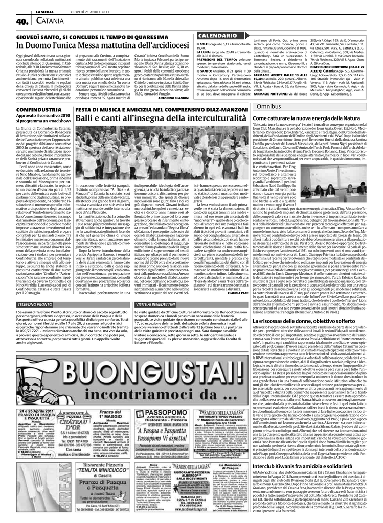 LA SICILIA 40. GIOVEDÌ 21 APRILE 2011 CATANIA GIOVEDÌ SANTO, SI CONCLUDE IL TEMPO DI QUARESIMA In Duomo l’unica Messa mattutina dell’arcidiocesi CALENDARIO IL SOLE: sorge alle 6,17 e tramonta alle 19,40. LA LUNA: sorge alle 23,48 e tramonta alle 9,36 di domani. PREVISIONI DEL TEMPO: velature sparse, temperature stazionarie, venti moderati, mare mosso. IL SANTO: Anselmo. Il 21 aprile 1109 moriva a Canterbury l’arcivescovo Anselmo dopo 16 anni di drammatico episcopato. Nato ad Aosta 76 anni prima, attratto dalla fama delle scuole di Francia, trova un approdo nell’abbazia normanna di Le Bec, dove insegnava il celebre Oggi giovedì della settimana santa, giornata sacerdotale, nella tarda mattinata si conclude il tempo di Quaresima. In Cattedrale, alle 9.30, l’arcivescovo Salvatore Gristina presiederà la messa crismale rituale - l’unica celebrazione eucaristica antimeridiana per tutta l’arcidiocesi con tutti i sacerdoti secolari e regolari della Chiesa di Catania. Il metropolita consacrerà il crisma e benedirà gli oli dei catecumeni e degli infermi, con la partecipazione dei ragazzi del catechismo che si preparano alla Cresima, a completamento dei sacramenti dell’Iniziazione cristiana. Nel tardo pomeriggio inizierà il triduo pasquale di Gesù morto, sepolto e risorto, centro dell’anno liturgico. In tutte le chiese cittadine aperte regolarmente al culto pubblico, sarà celebrata una sola messa con omelia detta "In coena Domini"; seguirà sino a mezzanotte l’adorazione personale e comunitaria. Sempre oggi, i fedeli della parrocchia ortodossa romena "S. Agata martire di CONFINDUSTRIA FESTA DI MUSICA E AMICIZIA NEL COMPRENSIVO DIAZ-MANZONI Approvato il consuntivo 2010 si programma un «road show» Balli e canti all’insegna della interculturalità La Giunta di Confindustria Catania, presieduta da Domenico Bonaccorsi di Reburdone, si è riunita ieri nella sede dell’associazione per l’approvazione del progetto di bilancio consuntivo 2010. In apertura dei lavori è stato osservato un minuto di silenzio in ricordo di Enzo Gibiino, storico imprenditore della Sanità privata catanese e proboviro di Confindustria Catania. Per il nono anno consecutivo, come evidenziato nella relazione del tesoriere Nino Mirabile, l’andamento gestionale dell’associazione, prima in Sicilia e seconda nel Mezzogiorno per numero di iscritti e fatturato, ha registrato un avanzo d’esercizio pari al 5,32 per cento delle entrate contributive. Il parlamentino degli industriali, su proposta del presidente, ha deliberato l’istituzione di un nuovo sportello informativo a disposizione degli associati relativo al “Fondo di investimento italiano”, uno strumento messo in campo dal ministero dell’Economia per la ricapitalizzazione delle piccole e medie imprese attraverso investimenti nel capitale di rischio, in grado di erogare contributi per 1,3 miliardi di euro. Tra le iniziative messe in programma dall’associazione, in partenza nelle prossime settimane, un road show tra i comuni della provincia etnea, in collaborazione con i sindaci, per presentare Confindustria alle imprese del territorio e attivare sinergie utili allo sviluppo. La Giunta ha anche stabilito la prossima costituzione di due nuove sezioni associative “Credito” e “Assicurazioni” che saranno coordinate rispettivamente da Saverio Continella e da Nino Mirabile. L’assemblea dei soci di Confindustria Catania è stata fissata per il 20 maggio. In occasione delle festività pasquali, l’Istituto comprensivo "A. Diaz - A. Manzoni" di Catania, ha salutato i suoi studenti, prima delle meritate vacanze, allestendo una grande festa di giochi, musica e amicizia che si è svolta ieri mattina nel grande cortile interno alla sede di Via Plebiscito. La manifestazione, cha ha coinvolto attivamente anche genitori, ha trovato il suo senso più profondo nel messaggio di solidarietà e integrazione che ne ha caratterizzato gli intenti facendo sì che nel generale clima di vivace spensieratezza, non mancassero momenti di riflessione e grande coinvolgimento emotivo. Dopo la breve introduzione della preside Agrippina Barone, i semplici versi e i brani cantati dai piccoli alunni delle classi elementari, hanno dato inizio a esibizioni, balli e canti raggiungendo il momento più emblematico nell’emozionata partecipazione dei giovani extracomunitari, coinvolti quest’anno nei programmi scolastici con cui l’istituto ha arricchito l’offerta formativa. Inserendosi perfettamente in una TELEFONO PRONTO I Salesiani di Telefono Pronto, il circuito cristiano di ascolto soprattutto per emarginati, infermi e depressi, in occasione della Pasqua e della Pasquetta offre a questa gente la possibilità di dialogo e conforto. Tutti i giorni, compresi i festivi e dalle 17 alle 20, ci saranno religiosi e laici esperti che risponderanno alle chiamate che verranno inoltrate tramite lo 090/717271. I volontari invitano anche chi sta bene, ma vive da solo, a provare questa esperienza di amicizia, di un contatto che potrà poi, attraverso la cornetta, perpetuarsi tutti i giorni. Un appello rivolto anche ai giovani. Catania" (chiesa Crocifisso della Buona Morte in piazza Falcone), parteciperanno alle 10 alla Divina Liturgia bizantinoslavonica di San Basilio; alle 17,30 vespro. I fedeli delle comunità ortodosse greco-costantinopolitana e russo-ucraina si riuniranno alle 10, nella chiesa San Cristoforo minore in piazza Spirito Santo, per la celebrazione della Divina Liturgia in rito greco-bizantino-slavo; alle 19.30, lettura del Vangelo. Lanfranco di Pavia. Qui, prima come scolaro, poi come monaco, priore e abate, rimane 33 anni, cioè fino al 1093, quando è nominato arcivescovo di Canterbury. Sarà un successore, S. Tommaso Becket, a chiederne la canonizzazione, e un re, Giacomo III, a chiedere al papa di proclamarlo Dottore della Chiesa. FARMACIE APERTE DALLE 13 ALLE 16,30: c.so Italia, 270; p.zza C. Alberto, 18; via Plebiscito, 224; via E. D’Angiò, 43; Vi