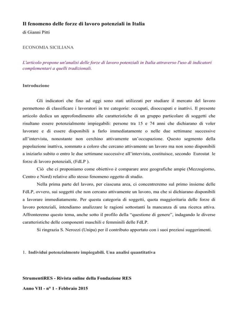 Il fenomeno delle forze di lavoro potenziali in Italia di Gianni Pitti ECONOMIA SICILIANA L'articolo propone un'analisi delle forze di lavoro potenziali in Italia attraverso l'uso di indicatori complementari a quelli tradizionali. Introduzione Gli indicatori che fino ad oggi sono stati utilizzati per studiare il mercato del lavoro permettono di classificare i lavoratori in tre categorie: occupati, disoccupati e inattivi. Il presente articolo dedica un approfondimento alle caratteristiche di un gruppo particolare di soggetti che risultano essere potenzialmente impiegabili: persone tra 15 e 74 anni che dichiarano di voler lavorare e di essere disponibili a farlo immediatamente o nelle due settimane successive all’intervista, nonostante non cerchino attivamente un’occupazione. Questo segmento della popolazione inattiva, sommato a coloro che cercano attivamente un lavoro ma non sono disponibili a iniziarlo subito o entro le due settimane successive all’intervista, costituisce, secondo Eurostat le forze di lavoro potenziali, (FdLP ). Ciò che ci proponiamo come obiettivo è comparare aree geografiche ampie (Mezzogiorno, Centro e Nord) relative allo stesso fenomeno oggetto di studio. Nella prima parte del lavoro, per ciascuna area, ci concentreremo sul primo insieme delle FdLP, ovvero, sui soggetti che non cercano attivamente un lavoro, ma che si dichiarano disponibili a lavorare immediatamente. Per questa categoria di soggetti, quota maggioritaria delle forze di lavoro potenziali, intendiamo analizzare le ragioni sottostanti la mancanza di una ricerca attiva. Affronteremo questo tema, anche sotto il profilo della “questione di genere”, indagando le diverse caratteristiche delle componenti maschili e femminili delle FdLP. Si ringrazia S. Nerozzi (Unipa) per il contributo apportato con i suoi preziosi suggerimenti. 1. Individui potenzialmente impiegabili. Una analisi quantitativa StrumentiRES - Rivista online della Fondazione RES Anno VII - n° 1 - Febbraio 2015 In Italia, nel primo trimestre 2014, i dati sulle forze di lavoro potenziali evidenziano circa 3,2 milioni di persone tra i 15 e 74 anni che, pur non cercando attivamente un lavoro, sarebbero state disponibili a lavorare [Tav.1 - (1)]. Questo è un dato in crescita di oltre 270 mila unità rispetto al primo trimestre del 2013. A questa categoria di soggetti, si aggiungono circa 91 mila persone inattive che pur cercando non sono disponibili immediatamente a lavorare, [Tav.1 - (2)] e comprendono le persone non occupate o disoccupate che: - hanno cercato attivamente un lavoro nelle quattro settimane che precedono quella di riferimento ma non sono disponibili a lavorare entro le due settimane successive; − hanno cercato un lavoro non attivamente ma passivamente (ad esempio, sono stati in attesa degli esiti di un colloquio di lavoro) nelle quattro settimane che precedono quella di riferimento e sono disponibili a lavorare entro le due settimane successive (Fonte: Istat). Esistono differenze territoriali importanti: per il Mezzogiorno il dato al primo trimestre 2014, nella classe di età 15-74 anni, ammonta a circa 2,1 milioni di persone potenzialmente occupabili, che rappresentano il 62% del totale nazionale, segue il Nord con 744 mila unità, circa il 23% sul totale, e il Centro con 451 mila unità (il 14% sul totale) (Tav. 1). La Tav. 2 segmenta l’intera popolazione di soggetti che non cercano lavoro, ma sarebbero disponibili a lavorare immediatamente [punto (1) della Tav. 1] in relazione alla condizione da questi dichiarata. Anche in questo caso i dati mostrano un significativo divario tra le regioni del CentroNord rispetto a quelle del Mezzogiorno. In Italia, il 50% degli inattivi potenzialmente impiegabili dichiara di essere “disoccupato e alla ricerca di nuova occupazione”, il 26% risulta “Casalinga/o”, il 16% si dichiara “In cerca di prima occupazione” e solo il 5% si trova nella condizione di “Studente”; in particolare, la categoria “Disoccupato e alla ricerca di nuova occupazione” è maggiormente concentrata nel Centro-Nord rispetto al Mezzogiorno, mentre la condizione di essere alla ricerca di prima occupazione, in termini StrumentiRES - Rivista online della Fondazione RES Anno VII - n° 1 - Febbraio 2015 percentuali, sembra prevalere nelle regioni del Sud (isole comprese)1. Per la categoria “Casalinga/o”, condizione dichiarata dai soggetti potenzialmente impiegabili, i dati, in valore percentuale, mostrano una incidenza omogenea sia per il Centro-Nord che per il Mezzogiorno. Gli inattivi potenzialmente impiegabili censiti in Italia nel primo trimestre 2014, presentano differenze rilevanti a seconda delle caratteristiche individuali, in particolare, il genere e il motivo della mancata ricerca di un lavoro. L’indicatore evidenzia una maggiore concentrazione nell’area del Mezzogiorno (il 64% circa) e la componente femminile ne rappresenta la porzione principale (Tav. 3), con circa 1,3 milioni di donne, pari al 63% rispetto al totale della popolazione italiana femminile inattiva ma potenzialmente impiegabile. E’ opportuno chiedersi quale sia il motivo della mancata ricerca di un lavoro. 1 L’area geografica del Mezzogiorno contiene informazioni relative al Sud (Isole comprese). La disaggregazione del dato FdLP, che ha riguardato una particolare categoria, quella dei soggetti potenzialmente impiegabili, non ha permesso di condurre una analisi distinta per la sola area geografica rappresentata dalla Sicilia. StrumentiRES - Rivista online della Fondazione RES Anno VII - n° 1 - Febbraio 2015 Analizzando il fenomeno a livello nazionale emerge che, per il 50% delle donne e per il 45 % dei loro coetanei maschi, il principale motivo della mancata ricerca di un lavoro è attribuibile allo scoraggiamento. Oltre allo scoraggiamento, la cura dei figli e/o dei familiari rappresenta per la componente femminile il motivo più significativo della mancata ricerca del lavoro (il 18%). Riguardo alla componen