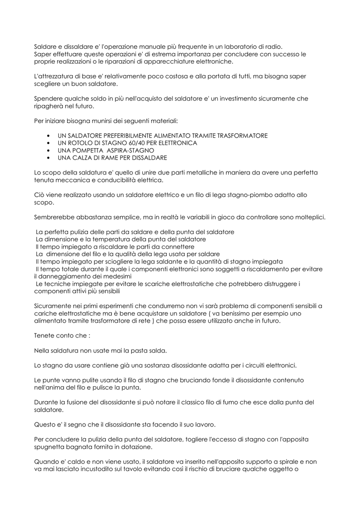 Saldare e dissaldare e' l'operazione manuale più frequente in un laboratorio di radio. Saper effettuare queste operazioni e' di estrema importanza per concludere con successo le proprie realizzazioni o le riparazioni di apparecchiature elettroniche. L'attrezzatura di base e' relativamente poco costosa e alla portata di tutti, ma bisogna saper scegliere un buon saldatore. Spendere qualche soldo in più nell'acquisto del saldatore e' un investimento sicuramente che ripagherà nel futuro. Per iniziare bisogna munirsi dei seguenti materiali: • • • • UN SALDATORE PREFERIBILMENTE ALIMENTATO TRAMITE TRASFORMATORE UN ROTOLO DI STAGNO 60/40 PER ELETTRONICA UNA POMPETTA ASPIRA-STAGNO UNA CALZA DI RAME PER DISSALDARE Lo scopo della saldatura e' quello di unire due parti metalliche in maniera da avere una perfetta tenuta meccanica e conducibilità elettrica. Ciò viene realizzato usando un saldatore elettrico e un filo di lega stagno-piombo adatto allo scopo. Sembrerebbe abbastanza semplice, ma in realtà le variabili in gioco da controllare sono molteplici. La perfetta pulizia delle parti da saldare e della punta del saldatore La dimensione e la temperatura della punta del saldatore ll tempo impiegato a riscaldare le parti da connettere La dimensione del filo e la qualità della lega usata per saldare Il tempo impiegato per sciogliere la lega saldante e la quantità di stagno impiegata Il tempo totale durante il quale i componenti elettronici sono soggetti a riscaldamento per evitare il danneggiamento dei medesimi Le tecniche impiegate per evitare le scariche elettrostatiche che potrebbero distruggere i componenti attivi più sensibili Sicuramente nei primi esperimenti che condurremo non vi sarà problema di componenti sensibili a cariche elettrostatiche ma è bene acquistare un saldatore ( va benissimo per esempio uno alimentato tramite trasformatore di rete ) che possa essere utilizzato anche in futuro. Tenete conto che : Nella saldatura non usate mai la pasta salda. Lo stagno da usare contiene già una sostanza disossidante adatta per i circuiti elettronici. Le punte vanno pulite usando il filo di stagno che bruciando fonde il disossidante contenuto nell'anima del filo e pulisce la punta. Durante la fusione del disossidante si può notare il classico filo di fumo che esce dalla punta del saldatore. Questo e' il segno che il disossidante sta facendo il suo lavoro. Per concludere la pulizia della punta del saldatore, togliere l'eccesso di stagno con l'apposita spugnetta bagnata fornita in dotazione. Quando e' caldo e non viene usato, il saldatore va inserito nell'apposito supporto a spirale e non va mai lasciato incustodito sul tavolo evitando così il rischio di bruciare qualche oggetto o procurarsi fastidiose ustioni. Precauzione indispensabile sempre e a maggior ragione se sono presenti bambini. Il filo di stagno per saldare e' un altro dei componenti fondamentali per ottenere un buon lavoro. Non acquistate lo stagno in ferramenta, ma soltanto nei negozi di componenti elettronici, poiché quello per uso elettronico e' speciale e anche abbastanza costoso. La lega usata e' composta dal 60% di stagno e 40% di piombo e l'anima contiene una sostanza disossidante che lascia sulla superficie dello stampato uno strato lucido che si sfalda come il vetro. Per l'uso normale usare un diametro da 0,8-1 mm. La temperatura di fusione di questa lega e' intorno ai 250 °C, mentre quella del disossidante intorno ai 300 °C. L'estremità della punta del saldatore deve essere sempre impregnata di stagno perché possa funzionare al meglio. Appena acquistato il saldatore o quando viene montata una punta nuova, bisogna subito ricoprirla di un sottile strato di stagno per una lunghezza di 2-3 mm tutta intorno. Una volta ripulita con la spugnetta bagnata, la punta deve risultare liscia e di un colore argento splendente. Ora il saldatore e' pronto all'uso. Con questi accorgimenti, tenendo sempre la punta pulita, la durata del saldatore e' praticamente eterna. Prima di tutto pulire perfettamente le parti da saldare dallo sporco, l'ossido e il grasso. Dopo aver portato la punta del saldatore alla corretta temperatura (350 °C circa), aggiungere un po' di stagno sulla punta affinché l'antiossidante contenuto nella lega di rame elimini le impurità. Attendere qualche secondo in maniera che il disossidante bruciando faccia il suo lavoro. Pulire la punta del saldatore sulla spugnetta inumidita togliendo lo stagno fuso in modo da renderla perfettamente liscia e lucida. Riscaldare le parti da saldare toccandole fermamente e contemporaneamente con la punta del saldatore per meno di un secondo. Senza togliere la punta del saldatore portare la lega di stagno a contatto del saldatore fino a scioglierne una quantità sufficiente a creare un'adeguata copertura. Aspettare due o tre secondi che lo stagno si sciolga ed espanda uniformemente. Togliere la punta del saldatore e riporla nell'apposito alloggiamento. Attendere per qualche secondo perché lo stagno condensi e si raffreddi. La goccia di stagno deve avere un bel colore brillante, essere completamente liscia ed aderire perfettamente sia ai bordi del componente.