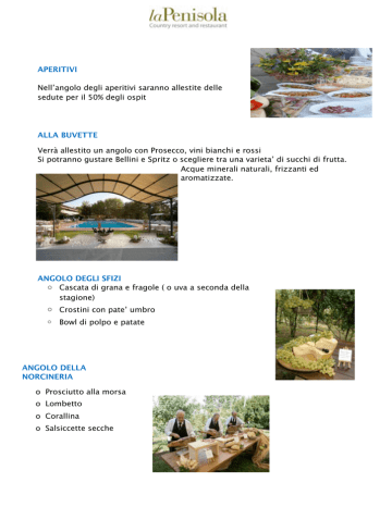 APERITIVI Nell’angolo degli aperitivi saranno allestite delle sedute per il 50% degli ospit ALLA BUVETTE Verrà allestito un angolo con Prosecco, vini bianchi e rossi Si potranno gustare Bellini e Spritz o scegliere tra una varieta’ di succhi di frutta. Acque minerali naturali, frizzanti ed aromatizzate. ANGOLO DEGLI SFIZI o Cascata di grana e fragole ( o uva a seconda della stagione) o Crostini con pate’ umbro o Bowl di polpo e patate ANGOLO DELLA NORCINERIA o Prosciutto alla morsa o Lombetto o Corallina o Salsiccette secche ANGOLO DEL FORMAGGIO Selezione di formaggi freschi e stagionati tra cui pecorino, caciottone Orvietano, mignon al tartufo, primo sale al pepe e alla vinaccia. DALLA PADELLA DELL’OLIO BOLLENTE o Sfoglie melanzane o di Fiori di zucca e bastoncini di zucchine o Foglie di salvia o Anellini di cipolla Il tutto in croccante pastella di riso e servirti con sali aromatizzati al rosmarino, al pepe, al limone….. LE PROPOSTE DEI NOSTRI CHEF DA GUSTARE A TAVOLA Proposta n.1 Carnaroli sfumato allo champagne, mantecato con caciottone d’Orvieto e profumato alla mentuccia Ravioli di magro in salsa di ciliegini con scaglie di primo sale e olio al basilico Filetto di vitella al pepe rosa saltato con vino frizzante Torretta di verdure gratinate Proposta n.2 Ravioli verdi di spinaci farciti con germano reale e padellati al burro con granelli di pistacchi Tagliatelle alla trifola umbra e nero di Norcia con germoglio di limoncino profumato Coscio di vitello scaloppato dallo chef in salsa madre Mazzetto di fagiolini al porro Proposta n.3 Gnocchi di patate con fonduta di taleggio e granella di nocciole Piccoli umbrichelli umbri con pomodorini ciliegini e guanciale croccante Ventaglio di lattonzolo farcito al tartufo con riduzione di rosso Sformatino di patate Proposta n. 4 Rigatoncini trafilati al bronzo con pesto e pomodorini pachino Pappardelle in cialda di grana saltate al ragout bianco di vitella e porro Filetto di vitella avvolto nel porro e scaloppato con riduzione di fichi. I NOSTRI PRIMI PIATTI I RISOTTI o Carnaroli allo champagne, mantecato con caciottone di Orvieto e aromatizzato alla mentuccia o Risotto ai fiori di zucca e lamelle di seppia brasata o Risotto alle erbe spontanee e germogli di radicchio bianco mantecato con burrata di bufala o Risotto con punte di asparagi e zafferano LE PASTE RIPIENE E COPPATE o Ravioli farciti al magro in salsa di pomodorini con scaglie di primo sale e olio al basilico o Ravioli con ricotta di pecora e fiori di zucca mantecati al burro profumato al salmone affumicato e croccante di grana o Ravioli al verde di spinaci farciti con germano reale e padellati al burro di fattoria con granella di pistacchi o Ravioli di patate e bufala filante in salsa di zucca gialla e guanciale croccante con julienne di zucchine dorate DALLE TRAFILE DI BRONZO o Tagliatelle alla trifola umbra e nero di Norcia con germoglio di limoncino profumato o Rigatoncini in cialda brick saltati al ragout di agnello e timo o Tagliolini di farro tenero al ragout di frutti di mare e pomodorini confit o Pappardelle in cialda di grana saltate al ragout bianco di vitella e porro brasato o Piccoli umbrichelli umbri con pomodorini ciliegino e guanciale croccante o Tagliatelle in salsa di astice flambati al brandy CHICCHE DI PATATE o Gnocchi all’ortica saltati con burro di fattoria e aromatizzati alla salvia o Gnocchi di patate con fonduta di taleggio e granella di nocciole o Gemme di patate al pesto e pomodorini pachino I NOSTRI SECONDI PIATTI o Filetto di maiale farcito al tartufo con riduzione al rosso di Corbara o Filetto di vitella in crosta di pepe rosa arrostito scaloppato e accompagnato da confettura di fichi al vino frizzante o Sella di vitella glassata al forno in bellavista con i quattro pepi al mulino o Coscio di vitella scaloppato dallo chef in salsa madre o Costolette di agnello alla provenzale o Suprema di branzino farcita agli asparagi su crema di fagioli cannellini e zafferano o Spiedino di mare gratinato al forno DAL BRACIERE o Grigliata mista di angus, agnello, fegatelli, punta di vitello e salsiccia o Spiedino di mare con cipolle e pomodori gratinati o Grigliata mista di orata, scampi, mazzancolle, totani e spada IL GRAN BUFFET DI DOLCI o Torta al cioccolato o Crostata alla frutta fresca o Mini cannoli siciliani con crema di ricotta o Bignè caramellati farciti con crema al limone o Bicchierini di cioccolato con mousse di caffè o Panna cotta con salsa ai frutti di bosco o Composta di frutta fresca intagliata BOUVETTE FINALE o Caffè o Digestivi o Amari o Grappe DALLA CANTINA o Vini bianchi e rossi DOC dell’Umbria o Moscato per il brindisi o Acqua minerale ANGOLI EXTRA Gran Buffet di confetti Angolo dei sigari e del Rhum Carrello dei gelati www.lapenisola.com Per Info e prenotazioni: [email protected] Luciano Bicchi tel 335396692 tel. 0744950521