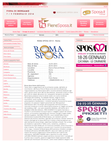 Sposa.it: le news del portale nazionale sulla sposa e sul matrimonio Iscrizione operatori del settore Home Iscrizione Wedding Planner Iscrizione Fiere Sposa Iscrizione Newsletter Home Page | Omaggi da sposa.it | Iscrizione Operatori e Fiere | Occasioni | Eventi Sposa 2012/2013 | Riviste | Newsletter Ricerca Fiere: - Tutte le regioni - Carica Fiera Gennaio 2014 ROMA SPOSA 2014 - Roma Cerca Pubblicità Caricamento Scheda Fiera Menù principale Home del Portale News Sposa Fiere Sposa Archivio geografico fiere Abruzzo Basilicata Calabria Campania Emilia-Romagna Friuli-Venezia Giulia Lazio Data di inizio Data di fine Location Località Provincia Nr. espositori Ingresso Organizzatore Telefono 16/01/2014 20/01/2014 Nuova Fiera di Roma Roma Roma 350 n.d. Fiere Roma +390685355454 int.3 Pubblicità Liguria Lombardia Marche Molise Piemonte Puglia Sardegna Sicilia Toscana Trentino-Alto Adige Umbria Valle d'Aosta Veneto Breve descrizione dell'evento: Tante idee e suggerimenti per la cerimonia nuziale, dall’abito al ricevimento: alla Nuova Fiera di Roma torna dal 16 al 20 gennaio l’appuntamento con Roma Sposa 2014, l’evento fieristico dedicato agli sposi, giunto quest’anno alla sua 26a edizione. Diventato ormai un must per tutte le coppie alle prese con i preparativi del giorno più bello, Roma Sposa propone tutte le ultime mode e le nuove tendenze all’insegna del wedding. Tra addobbi floreali, viaggi di nozze, ricevimenti, torte nuziali, liste di nozze, abiti per gli invitati, partecipazioni e bomboniere, i visitatori potranno conoscere le nuove proposte e le soluzioni migliori presentate dai 350 espositori dell’edizione 2014. Da sempre all’avanguardia nell’intercettare e catturare tendenze e novità, Roma Sposa propone un viaggio nel mondo del wedding a 360°, con aree tematiche dedicate, all’interno dei 2 padiglioni della 26a edizione. WED ACADEMY è lo spazio riservato a incontri e conversazioni tra futuri sposi e i maggiori esperti dei diversi settori, un’occasione imperdibile per ricevere consigli e fugare dubbi, dal look al galateo. Nell’AREA SFILATE, nuovi modelli della couture domineranno la passerella di Roma Sposa, con momenti specifici dedicati all’universo maschile e agli abiti da cerimonia. Grande varietà di forme e dettagli per la sposa 2014 ma è il pizzo a farla da padrone con abiti dal fascino senza tempo, dalle linee morbide e lineari. Per un look più moderno e giovanile è l’abito corto, romantico, semplice o sbarazzino la scelta ideale per chi ricerca la comodità, senza rinunciare a stile e charme. Per scoprire e provare tutti i trucchi e le acconciature più in voga, i visitatori di Roma Sposa 2014 potranno chiedere consigli e tendenze all’interno dell’AREA BEAUTY, dove noti make-up artist ed esperti del settore suggeriranno il look perfetto per il giorno del matrimonio. Nell’AREA LOUNGE relax e aperitivo no stop, mentre nell’AREA DESIGN le giovani coppie potranno ricevere tutti i consigli per la prima casa e scoprire, grazie ai suggerimenti degli esponenti delle aziende più interessanti del settore, come creare ambienti eleganti e di Pubblicità | Ricerca Aziende tendenza a costi contenuti. Appuntamento al 16 gennaio con Roma Sposa 2014, garanzia di professionalità ed efficienza per rendere il proprio matrimonio un giorno indimenticabile. Elenco espositori: ANNA TUMAS ANTONELLA SPOSE ATELIER CLARALUNA SPOSA ATELIER THE WOMAN IN WHITE BIBAN ATELIER C’ERA UNA VOLTA CARNEVALI SPOSE CELLI ALTA MODA CELLI CENTRO SPOSI PAVONA – ROMA CELLI SPOSE dal 1935 CENTRO MODA MAMPIERI OLEVANO ROMANO CENTRO SPOSI PERSONAL STYLE PERLA DI LUNA CRISTINA PACINI ATELIER D’AVINO SPOSE DORIAN’S SPOSA DREAM SPOSA ATELIER ELVIRA GRAMANO ENZO BERNARDINUCCI GERARDINA SPOSE GIANNI MOLARO LA SPOSA DI MARIA PIA LE SPOSE DI DATI LE SPOSE DI MICHELLE BY QUEEN EVENTI LINEA SPOSE di Elena Belardinelli MARSIL ALTA MODA SPOSA MIRYAM PIERALISI ALTA MODA SPOSA MISS BRIDE TESSIER by Antonio Riva PAOLA D’ONOFRIO ATELIER PROTAGONISTI RADIOSA RS COUTURE DESIGN RENATO SAVI SALEM SPOSE SARTORIA ROSSI SORELLE FRANCESCHI SPOSE SPOSISSIMI & CO ROMA STELLA MAZZOTTA ATELIER STILE DI SARA TILU’ URBANO DELLA SCALA ADDOBBI FLOREALI ALBERTO MANZONE ADDOBBI GORI DANIELE ADDOBBI FLOREALI – LA CORBEILLE ADDOBBI MOMENTO MAGICO HORIOS CENTRO SPOSI CASILINA AGENZIA VIAGGI SAM & SAB TRAVEL AGENZIA VIAGGI TOUR OPERATOR PUNTO NEL MONDO AGENZIE DI VIAGGIO GRUPPO J TEAM ANKIROA VIAGGI AURATOURS TOUR OPERATOR B & G VIAGGI CARTORANGE – CONSULENTI PER VIAGGIARE CLUB VIAGGI CTS MONTEVERDE – MARCONI DESTINATION SPECIALISTS DUE PINI VIAGGI FRANSIMAR VIAGGI HP VACANZE IL VIAGGIO DI NOZZE DI ORIGINAL TOUR MARA PARRAVICINI PARADISE77 VIAGGI PRESTIGE ITALY GOLD VIAGGI DA NUMERO UNO WORLD TRAVEL CENTER AUTONOLEGGI VENEZIA 1 CANESTRI AUTONOLEGGI FIANI AUTONOLEGGIO F.LLI GHISU L’AUTONOLEGGIO DELLA SPOSA PARTY ON THE ROAD BOMBONIERE COLOR COTTO C’ERA UNA VOLTA CARILLON CASAREX LISTE DI NOZZE – BOMBONIERE CENTRO SPOSI PERSONAL STYLE CONTI CONFETTERIA MILANO DOLCI PROMESSE La Faldacchea DONIDEE DI DONATA SARDONE HORIOS CENTRO SPOSI CASILINA IL CIGNO BOMBONIERE LA TUA IDEA – BOMBONIERE LE PICCOLE COSE MAGIE DI RASO SAMAU CREAZIONI VP PALMIERI BOMBONIERE-LISTE DI NOZZE SINFONIA ALESSANDRO IANNACCONE HAIR & MAKE-UP FENICE GROUP – MAKE UP ARTISTS GLENDA FALCONI LETIZIA MANNOCCHI MAKE UP MICHELA MELE RIFE MAKE UP di Rita Feliziani TRUCCO E ACCONCIATURA SPOSA Look Maker Antonella VIVIMAKEUP S.r.l. ALTER’ IMAGO FOTO E FOTO ATTALO FOTOGRAFO AZETA di Fabio Fralleoni BLACK AND LIGHT CHELLINI FOTOGRAFO CLAUDIO FOTOGRAFO COLIZZI FOTOGRAFI FOTO IN ’94 FOTO LIDO SANTONI FOTO SILVA FOTOFLASH TEAM LA FOTO di Blasotta Pasquale FOTOSHOPSTUDIO LORETIFOTO DI Fabiola e Jaber MATTEO DIMIZIANI MD FOTO CHIRIANO NABIS STUDIO FOTOGRAFICO OBIETTIVO FOTO di fabrizio Marini PALIOTTA FOTO E VIDEO PHOTOPOINT STUDIO CLIC FOTOGRAFIA STUDIO F4 BY FIGA STUDIO FOTOGRAFICO OBIETTIVO SPOSI GANDHARA GIOIELLI MICRI GIOIELLI ROMA