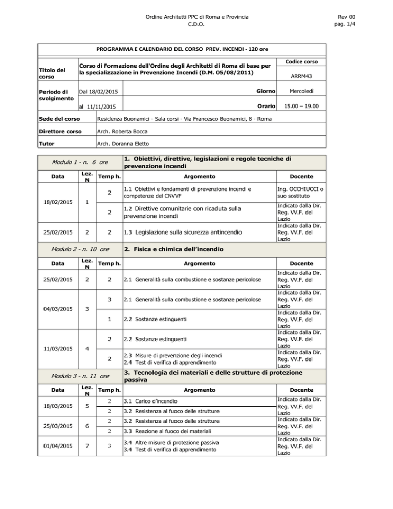 Ordine Architetti PPC di Roma e Provincia C.D.O. Rev 00 pag. 1/4 PROGRAMMA E CALENDARIO DEL CORSO PREV. INCENDI - 120 ore Titolo del corso Corso di Formazione dell'Ordine degli Architetti di Roma di base per la specializzazione in Prevenzione Incendi (D.M. 05/08/2011) Dal 18/02/2015 Periodo di svolgimento al 11/11/2015 Mercoledì Orario 15.00 – 19.00 Residenza Buonamici - Sala corsi - Via Francesco Buonamici, 8 - Roma Direttore corso Arch. Roberta Bocca Tutor Arch. Doranna Eletto 1. Obiettivi, direttive, legislazioni e regole tecniche di prevenzione incendi Modulo 1 - n. 6 ore Lez. Temp h. N 2 18/02/2015 2 2 Modulo 2 - n. 10 ore Data 25/02/2015 04/03/2015 11/03/2015 Lez. Temp h. N 2 18/03/2015 25/03/2015 01/04/2015 1.1 Obiettivi e fondamenti di prevenzione incendi e competenze del CNVVF 1.2 Direttive comunitarie con ricaduta sulla prevenzione incendi 1.3 Legislazione sulla sicurezza antincendio Argomento 2.1 Generalità sulla combustione e sostanze pericolose 3 2.1 Generalità sulla combustione e sostanze pericolose 1 2.2 Sostanze estinguenti 2 2.2 Sostanze estinguenti 2 2.3 Misure di prevenzione degli incendi 2.4 Test di verifica di apprendimento 3 4 7 Ing. OCCHIUCCI o suo sostituto Indicato dalla Dir. Reg. VV.F. del Lazio Indicato dalla Dir. Reg. VV.F. del Lazio Docente Indicato dalla Dir. Reg. VV.F. del Lazio Indicato dalla Dir. Reg. VV.F. del Lazio Indicato dalla Dir. Reg. VV.F. del Lazio Indicato dalla Dir. Reg. VV.F. del Lazio Indicato dalla Dir. Reg. VV.F. del Lazio 3. Tecnologia dei materiali e delle strutture di protezione passiva Lez. Temp h. Argomento N 2 3.1 Carico d’incendio 5 2 3.2 Resistenza al fuoco delle strutture 6 Docente 2. Fisica e chimica dell’incendio 2 Modulo 3 - n. 11 ore Data Argomento 1 2 25/02/2015 ARRM43 Giorno Sede del corso Data Codice corso 2 3.2 Resistenza al fuoco delle strutture 2 3.3 Reazione al fuoco dei materiali 3 3.4 Altre misure di protezione passiva 3.4 Test di verifica di apprendimento Docente Indicato dalla Dir. Reg. VV.F. del Lazio Indicato dalla Dir. Reg. VV.F. del Lazio Indicato dalla Dir. Reg. VV.F. del Lazio Ordine Architetti PPC di Roma e Provincia C.D.O. Rev 00 pag. 2/4 PROGRAMMA E CALENDARIO DEL CORSO PREV. INCENDI - 120 ore Modulo 4 - n. 9 ore Data 01/04/2015 08/04/2015 15/04/2015 4. Tecnologia dei sistemi e degli impianti di protezione attiva Lez. Temp h. N 7 8 1 4.1 Sistemi di rilevazione automatica di incendio, allarme e sistemi di alimentazione di sicurezza 1 4.1 Sistemi di rilevazione automatica di incendio, allarme e sistemi di alimentazione di sicurezza 1 4.2 Estintori di incendio portatili e carrellati 2 4.3 Impianti di estinzione incendi di tipo automatico e/o manuale 2 4.3 Impianti di estinzione incendi di tipo automatico e/o manuale 2 4.4 Impianti di controllo fumi e calore di tipo meccanico e naturale e sistemi di ventilazione 4.5 Test di verifica di apprendimento 9 Modulo 5 - n. 11 ore Data 22/04/2015 29/04/2015 06/05/2015 Lez. Temp h. N 10 06/05/2015 13/05/2015 Argomento 5.1 Termini definizioni generali, simboli grafici di prevenzione incendi e segnaletica di sicurezza 2 5.2 Procedimenti di prevenzione incendi 1 5.2 Procedimenti di prevenzione incendi 3 5.3 Analisi di rischio e individuazione delle misure di sicurezza equivalenti 3 5.4 Gestione della sicurezza 5.5 Test di verifica di apprendimento 11 12 13 Indicato dalla Dir. Reg. VV.F. del Lazio Indicato dalla Dir. Reg. VV.F. del Lazio Indicato dalla Dir. Reg. VV.F. del Lazio Indicato dalla Dir. Reg. VV.F. del Lazio Indicato dalla Dir. Reg. VV.F. del Lazio Docente Indicato dalla Dir. Reg. VV.F. del Lazio Indicato dalla Dir. Reg. VV.F. del Lazio Indicato dalla Dir. Reg. VV.F. del Lazio Indicato dalla Dir. Reg. VV.F. del Lazio 6. Approccio ingegneristico e sistema di gestione di sicurezza Lez. Temp h. N 12 Docente 5. Procedure di prevenzione incendi e sicurezza equivalente 2 Modulo 6 - n. 5 ore Data Argomento Argomento 1 6.1 Riferimenti normativi sull’approccio ingegneristico 1 6.1 Riferimenti normativi sull’approccio ingegneristico 2 6.2 Metodologia su cui si basa l’approccio ingegneristico 1 6.3 Il sistema di gestione della sicurezza Docente Indicato dalla Dir. Reg. VV.F. del Lazio Indicato dalla Dir. Reg. VV.F. del Lazio Ordine Architetti PPC di Roma e Provincia C.D.O. Rev 00 pag. 3/4 PROGRAMMA E CALENDARIO DEL CORSO PREV. INCENDI - 120 ore Modulo 7 - n. 4 ore Data 7. Sicurezza antincendio nei luoghi di lavoro Lez. Temp h. N 1 20/05/2015 14 2 1 Modulo 8 - n. 4 ore Data 27/05/2015 24/06/2015 01/07/2015 Argomento 8.1 Riferimenti normativi 2 8.2 Rapporto di sicurezza 16 17 Argomento 9.1 Schema tipo della regola tecnica 9.2 Attività a rischio specifico (impianti produzione calore, gruppi elettrogeni e di cogenerazione, autorimesse, ascensori) 9.2 Attività a rischio specifico (impianti produzione calore, gruppi elettrogeni e di cogenerazione, autorimesse, ascensori) 3 9.3 Attività con notevole affollamento (scuole, uffici) 3 9.4 Attività ricettive e sanitarie (alberghi, ospedali) 1 9.5 Attività di pubblico spettacolo e intrattenimento (cinema, teatri, impianti sportivi) 2 9.5 Attività di pubblico spettacolo e intrattenimento (cinema, teatri, impianti sportivi) 2 9.6 Edifici commerciali 1 9.6 Edifici commerciali 2 9.7 Edifici pregevoli (musei e archivi) 18 19 20 21 Indicato dalla Dir. Reg. VV.F. del Lazio 4 Docente Indicato dalla Dir. Reg. VV.F. del Lazio 9. Attività di tipo civile Lez. Temp h. N 1 08/07/2015 7.3 Apparato sanzionatorio 2 1 17/06/2015 7.2 Valutazione del rischio di incendio nei luoghi di lavoro 15 2 10/06/2015 7.1 Riferimenti normativi Lez. Temp h. N 2 03/06/2015 Docente 8. Attività a rischio di incidente rilevante Modulo 9 - n. 24 ore Data Argomento 9.8 Edifici civili abitazione 9.9 Test di verifica di apprendimento 9.10 Esercitazioni (predisposizioni di un progetto antincendio per conformità finalizzata alla valutazione ai sensi dell’art.3 del D.P.R. 151/2011 PAUSA ESTIVA Docente Indicato dalla Dir. Reg. VV.F. del Lazio Indicato dalla 