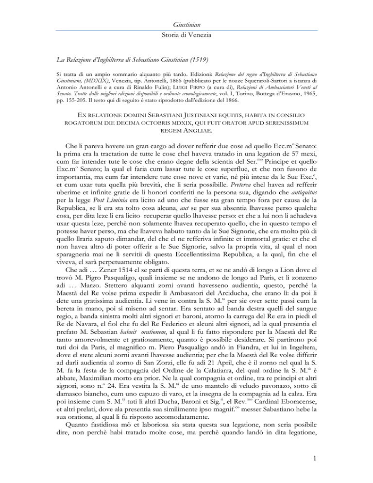 Giustinian Storia di Venezia La Relazione d’Inghilterra di Sebastiano Giustinian (1519) Si tratta di un ampio sommario alquanto più tardo. Edizioni: Relazione del regno d’Inghilterra di Sebastiano Giustiniani, (MDXIX), Venezia, tip. Antonelli, 1866 (pubblicato per le nozze Squeraroli-Sartori a istanza di Antonio Antonelli e a cura di Rinaldo Fulin); LUIGI FIRPO (a cura di), Relazioni di Ambasciatori Veneti al Senato. Tratte dalle migliori edizioni disponibili e ordinate cronologicamente, vol. I, Torino, Bottega d’Erasmo, 1965, pp. 155-205. Il testo qui di seguito è stato riprodotto dall’edizione del 1866. EX RELATIONE DOMINI SEBASTIANI JUSTINIANI EQUITIS, HABITA IN CONSILIO ROGATORUM DIE DECIMA OCTOBRIS MDXIX, QUI FUIT ORATOR APUD SERENISSIMUM REGEM ANGLIAE. Che li pareva havere un gran cargo ad dover refferir due cose ad quello Ecc.mo Senato: la prima era la tractation de tutte le cose chel haveva tratado in una legation de 57 mexi, cum far intender tute le cose che erano degne della scientia del Ser.mo Principe et quello Exc.mo Senato; la qual el faria cum lassar tute le cose superflue, et che non fusono de importantia, ma cum far intendere tute cose nove et varie, né più intexe da le Sue Exe.e, et cum uxar tuta quella più brevità, che li seria possibille. Preterea chel havea ad refferir uberime et infinite gratie de li honori conferiti ne la persona sua, digando che antiquitus per la legge Post Liminia era licito ad uno che fusse sta gran tempo fora per causa de la Republica, se li era sta tolto cosa alcuna, aut se per sua absentia lhavesse perso qualche cosa, per dita leze li era licito recuperar quello lhavesse perso: et che a lui non li achadeva uxar questa leze, perchè non solamente lhavea recuperato quello, che in questo tempo el potesse haver perso, ma che lhaveva habuto tanto da le Sue Signorie, che era molto più di quello llraria saputo dimandar, del che el ne refferiva infinite et immortal gratie: et che el non havea altro di poter offerir a le Sue Signorie, salvo la propria vita, al qual el non sparagneria mai ne li servitii di questa Eccellentissima Republica, a la qual, fin che el viveva, el sarà perpetuamente obligato. Che adi … Zener 1514 el se partì di questa terra, et se ne andò di longo a Lion dove el trovò M. Pigro Pasqualigo, quali insieme se ne andono de longo ad Paris, et li zonzeno adi … Marzo. Stettero alquanti zorni avanti havesseno audientia, questo, perché la Maestà del Re volse prima expedir li Ambasatori del Arciducha, che erano lì: da poi li dete una gratissima audientia. Li vene in contra la S. M.ta per sie over sette passi cum la bereta in mano, poi si miseno ad sentar. Era sentato ad banda destra quelli del sangue regio, a banda sinistra molti altri signori et baroni, atorno la carrega del Re era in piedi el Re de Navara, el fiol che fu del Re Federico et alcuni altri signori, ad la qual presentia el prefato M. Sebastian habuit orationem, al qual li fu fatto rispondere per la Maestà del Re tanto amorevolmente et gratiosamente, quanto è possibile desiderare. Si partirono poi tuti doi da Paris, el magnifico m. Piero Pasqualigo andò in Fiandra, et lui in Ingeltera, dove el stete alcuni zorni avanti lhavesse audientia; per che la Maestà del Re volse differir ad darli audientia al zorno di San Zorzi, elle fu adi 21 April, che è il zorno nel qual la S. M. fa la festa de la compagnia del Ordine de la Calatiarra, del qual ordine la S. M.tà è abbate, Maximilian morto era prior. Ne la qual compagnia et ordine, tra re principi et altri signori, sono n.o 24. Era vestita la S. M.tà de uno mantelo di veludo pavonazo, sotto di damasco biancho, cum uno capuzo di varo, et la insegna de la compagnia ad la calza. Era poi insieme cum S. M.tà tuti li altri Ducha, Baroni et Sig.ri, el Rev.mo Cardinal Eboracense, et altri prelati, dove ala presentia sua similimente ipso magnif.co messer Sabastiano hebe la sua oratione, al qual li fu risposto accomodatamente. Quanto fastidiosa mò et laboriosa sia stata questa sua legatione, non seria posibile dire, non perchè habi tratado molte cose, ma perchè quando landò in dita legatione, 1 Giustinian Storia di Venezia respeto la inimicitia, che era tra Ingeltera et Franza, et la unione, ch’era tra el stato nostro et Franza, la Maestà del Re et Cardinal et alii havevano tanto cativa impressione de nui, che non era possibile haverla pezore: vocabant nos piscatores, raptores, sine fide, et hoc per la liga rota cum Spana, tirannos, et tute le ignominiose parole che è possibile dire, come se fossamo tanti furfanti. La soa laboriosa faticha adunche esta in justificar tute le cose nostre, et monstrar a cadauno esser tuto il contrario di quello havevano impressione di nui, per modo che al presente restano assai ben satisfati. Un altra grandissima faticha lha habuto in questa sua legatione, che desiderando la M.tà del Re et il Cardinal far far la pace tra questa Signoria et Maximiano et desunirne dal Re di Franza, ad questo li ha bixognado uxar una certa dexterità cum non li cavar di speranza del tuto, et non li dar etiam speranza alcuna, per modo che li conveniva negotiar molto cautamente, et questo esta lino ai far de la pace tra il Re de Ingeltera et il Re de Franza, de la qual molti hanno per opinione che lui ne sia sta principio: imperho che un zorno essendo in una salla la Maestà del Re, li monstrò la principessa, la qual era in brazo de una dona, et poteva esser di età de mexi …, al presente la dita pol haver cercha anni tre: feze venir ipso M. Sebastian lì appresso, el qual se inzenochiò, et li bassò la mano, imperho che non è ducha, o signor alcuno che la veda, che non si cavi la bereta et li fazi reverentia, nè alcuno che li basasse, altro che la mano. Hor la M.tà del Re li disse: Domine oratur, per Deum, immortalem, ista puella numquam plorat. Lui le respoxe: Sacra Maestà, la sua fortuna non la inclina al pianzer, et questa è la causa: lei serà anchora Regina di Franza; le qual 