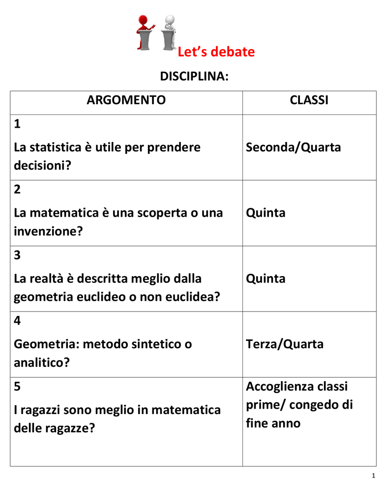 Let’s debate DISCIPLINA: ARGOMENTO CLASSI 1 La statistica è utile per prendere decisioni? Seconda/Quarta 2 La matematica è una scoperta o una invenzione? Quinta 3 La realtà è descritta meglio dalla geometria euclideo o non euclidea? Quinta 4 Geometria: metodo sintetico o analitico? Terza/Quarta 5 Accoglienza classi prime/ congedo di fine anno I ragazzi sono meglio in matematica delle ragazze? 1 6 Per essere bravi in matematica serve una capacità logica innata? Tutte le classi 7 2+2?=?4 Prima 8 La classe si confronta sulla risoluzione Tutte le classi di un problema in due modi diversi 9 I numeri irrazionali hanno senso? Seconda 2 Let’s debate. Argomentazioni: I ragazzi sono meglio in matematica delle ragazze? “Affermazione, Ragionamento, Prove, e Conclusione” “Affermazione” Dire con una frase chiaramente Noi pensiamo che le ragazze siano migliori dei ragazzi in matematica, la propria posizione + Perche hanno un atteggiamento più riflessivo Enucleazione dei punti da Perché sono più ordinate e metodiche discutere. (es. “Noi pensiamo che….. Il nostro primo punto è…..”) “Ragionamento” Spiegazione circa la validità delle Le ragazze sono più testarde, portano a termine un obiettivo Le ragazze sono più mature dei ragazzi della stessa età proprie argomentazioni (perchè è rilevante, perché è giusto, perché è vero) “Prove” Cita 1-2 esempi, dati oggettivi a supporto delle tue affermazioni (esempio, dati statistici, opinioni Si citano i risultati conseguiti nelle verifiche di matematica Si citano alcuni esempi di donne matematiche nella storia (Ipazia, Agnesi, …) Medaglia Fields 2014 … di esperti 3 “Conclusione” Riassunto dei punti illustrati in relazione all’argomento assegnato Pertanto ne deriva che dall’analisi fatta a livello: Di classe (vedi risultati prove scritte/orali) Di modalità di approccio nei confronti della disciplina Di esempi storici Di premi/gare internazionali le ragazze riescono meglio nello studio della matematica 4 Controargomentazioni Quattro fasi “Loro dicono . . .” • Riformulare l’argomentazione degli avversari “Ma noi non siamo d’accordo . . .” I grandi matematici sono uomini Nella nostra scuola le Olimpiadi matematica sono vinte dai maschi Perché storicamente solo gli uomini avevano accesso all’istruzione Perché la maggior parte degli studenti è maschio • Affermare il proprio punto di vista “Perchè . . .” • Dare prove per supportare la controargomentazione Esempi di donna matematiche che hanno potuto studiare solo perché supportate da istruzione privata Esempi di statistiche di gare matematiche in cui vincono le donne Cita 1-2 esempi, dati oggettivi a supporto delle tue affermazioni (esempio, dati statistici, opinioni di esperti) “Quindi . . .” • Confronta la tua argomentazione a quella degli avversari • Mostra che I tuoi argomenti sono migliori Esempi di donne matematiche che nonostante tutto (provenienti da contesti socio-culturali poco favorevoli) hanno raggiunto risultati apprezzabili. 5