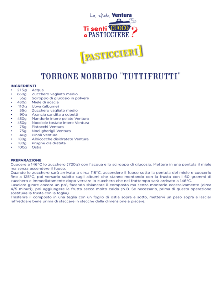 La sfida TORRONE MORBIDO "TUTTIFRUTTI" INGREDIENTI • 2 1 5 g Acqua • 650g Zucchero vagliato medio • 55g Sciroppo di glucosio in polvere • 430g Miele di acacia • 110g Uova (albume) • 55g Zucchero vagliato medio • 90g Arancia candita a cubetti • 450g Mandorle intere pelate Ventura • 450g Nocciole tostate intere Ventura • 75g Pistacchi Ventura • 75g Noci gherigli Ventura • 40g Pinoli Ventura • 180g Albicocche disidratate Ventura • 180g Prugne disidratate • 100g Ostia PREPARAZIONE Cuocere a 146°C lo zucchero (720g) con l'acqua e lo sciroppo di glucosio. Mettere in una pentola il miele ma senza accendere il fuoco. Quando lo zucchero sarà arrivato a circa 118°C, accendere il fuoco sotto la pentola del miele e cuocerlo fino a 125°C, poi versarlo subito sugli albumi che stanno montando con la frusta con i 60 grammi di zucchero e immediatamente dopo versare lo zucchero che nel frattempo sarà arrivato a 146°C. Lasciare girare ancora un po’, facendo sbiancare il composto ma senza montarlo eccessivamente (circa 4/5 minuti), poi aggiungere la frutta secca molto calda (N.B. Se necessario, prima di questa operazione sostituire la frusta con la foglia). Trasferire il composto in una teglia con un foglio di ostia sopra e sotto, mettervi un peso sopra e lasciar raffreddare bene prima di staccare in stecche della dimensione a piacere. La sfida DACQUOISE ALLE NOCI VENTURA E GORGONZOLA INGREDIENTI PER LA DACQUOISE ALLE NOCI • 200g Uova (albume) • 70g Maltitolo • 70g Inulina • 100g Mandorle in farina • 100g Noci in farina • 50g Farina 180 w • 50g Inulina • 8g Sale PER LA CREMA DI GORGONZOLA • 250g Panna al 35% di materia grassa • 120g Burro • 250g Formaggio gorgonzola • 8g Gelatina in polvere • 50g Porri • Q.B. Sale e pepe PER LA DECORAZIONE • 50g Noci Ventura trasformate in granella • 100g Sedano • 10g Maggiorana PREPARAZIONE PER LA DACQUOISE Montare gli albumi con il maltitolo e l’inulina fino ad ottenere una massa soffice e stabile. Miscelate tutte le farine e dopo averle setacciate unitele delicatamente, dal basso verso l’alto, alla massa di albumi. Stendete l’impasto sulla carta da forno allo spessore di 1cm. Spolverizzate con la granella di noci ed infornate a 180°C con valvola aperta per 10 minuti circa. A fine cottura abbattete immediatamente in modo da mantenere la giusta umidità. PER LA CREMA DI GORGONZOLA Fate soffriggere il porro tritato con una parte di burro della ricetta, quindi bagnate con un bicchiere di acqua e lasciate cuocere a fuoco basso fino a far evaporare del tutto l’acqua. Unite a questo punto la panna, il resto del burro e il gorgonzola. Pastorizzate il tutto fino a 85°C quindi frullate unendo la gelatina reidratata in 5 volte il suo peso d’acqua. Aggiustate di sale e pepe, se necessario. PER LA COMPOSIZIONE FINALE Mettete sul fondo di un quadro d’acciaio la dacquoise, versatevi sopra la crema di gorgonzola, mettete un altro foglio di dacquoise e ancora crema di gorgonzola. Terminate con la dacquoise. Abbattere negativamente. Tagliare il prodotto ancora congelato a quadratini, gelatinare con gelatina kappa e decorare con un ricciolo di sedano e una fogliolina di maggiorana. La sfida PISTACHE ABSOLUE INGREDIENTI • 1.000g Pasta choux per éclairs * PER LA CREMA AL PISTACCHIO ASSOLUTO • 5 6 0 g Latte intero • 5 6 0 g Uova intere • 2 5 0 g Zucchero semola to • 3 0 g G e latina in polvere • 1 4 0 g P istacchi in pasta • 4 0 0 g Burro PER LA SPUGNA VERDE AL PISTACCHIO • 5 0 g Pistacchi in farina • 1 5 g Farina 180 w • 5 0 g Zucchero semolato • 8 0 g Uova (albume) • 5 0 g Uova (tuorlo) • 5 g Olio di riso • 1 g Colorante giallo • 1 g Colorante verde pistacchio PER LA PASTA SIGARETTA • 5 0 g Burro • 5 0 g Zucchero a velo • 5 0 g Uova (albume) • 5 0 g Farina 180 w • 1 g Colorante giallo • 1 g Colorante verde pistacchio PER IL MONTAGGIO • 1 0 0 g Gelatina neutra a freddo • 5 0 g Pistacchi interi Ventura • 1 0 0 g Cioccolato bianco * la preparazione della pasta choux verrà spiegata nel dettaglio sul retro del foglio PREPARAZIONE PER LA PASTA SIGARETTA VERDE Lavorare il burro morbido con lo zucchero a velo, unire a filo l’albume liquido, quindi la farina e per ultimo colorare a piacere, in questo caso verde. PER LA COTTURA DELLA PASTA CHOUX* Dressare l’impasto ancora tiepido utilizzando un sac à poche munito di bocchetta n. 13 rigata fitta, su teglie leggermente unte oppure allestite con l’apposito tappetino microforato, formando dei bastoncini di 11cm di lunghezza. Con la pasta sigaretta preparata in precedenza colorata di verde, formare con l’aiuto di un sac à poche senza bocchetta, una riga centrale quanto tutta la lunghezza dell’éclair. Preriscaldare il forno ventilato a 250°C; una volta raggiunta la temperatura infornare la teglia di choux, chiudere la porta del forno e aspettare 20 secondi circa, quindi spegnere il forno. Lasciar gonfiare così la pasta a forno spento per circa 15 minuti, trascorso tale tempo accendere nuovamente il forno ma stavolta alla temperatura di 170° e lasciar cuocere per altri 20/25 minuti, fino a doratura e asciugatura degli éclairs. PER LA CREMA AL PISTACCHIO ASSOLUTO Miscelare uova intere e zucchero semolato, unire il latte intero bollente e cuocere come una crema inglese. Unire la gelatina idratata fuori dal fuoco, quando la crema arriva a circa 45°C mixare unendo il burro e la pasta pistacchio. Raffreddare completamente. PER LA SPUGNA VERDE AL PISTACCHIO Miscelare la farina di pistacchi con lo zucchero, la farina di frumento e i colori. Unire i tuorli e gli albumi, quindi montare in planetaria. A fine montatura unire l’olio di riso. Mettere questo composto negli stampini di silicone e infornare per 30 secondi a microonde. Una volta cotta, capovolgere sottosopra e far raffereddare. PER IL MONTAGGIO Lucidare gli éclairs con la gelatina neutra. Riempire dall’alto gli éclairs facendo fuoriuscire uno spunton