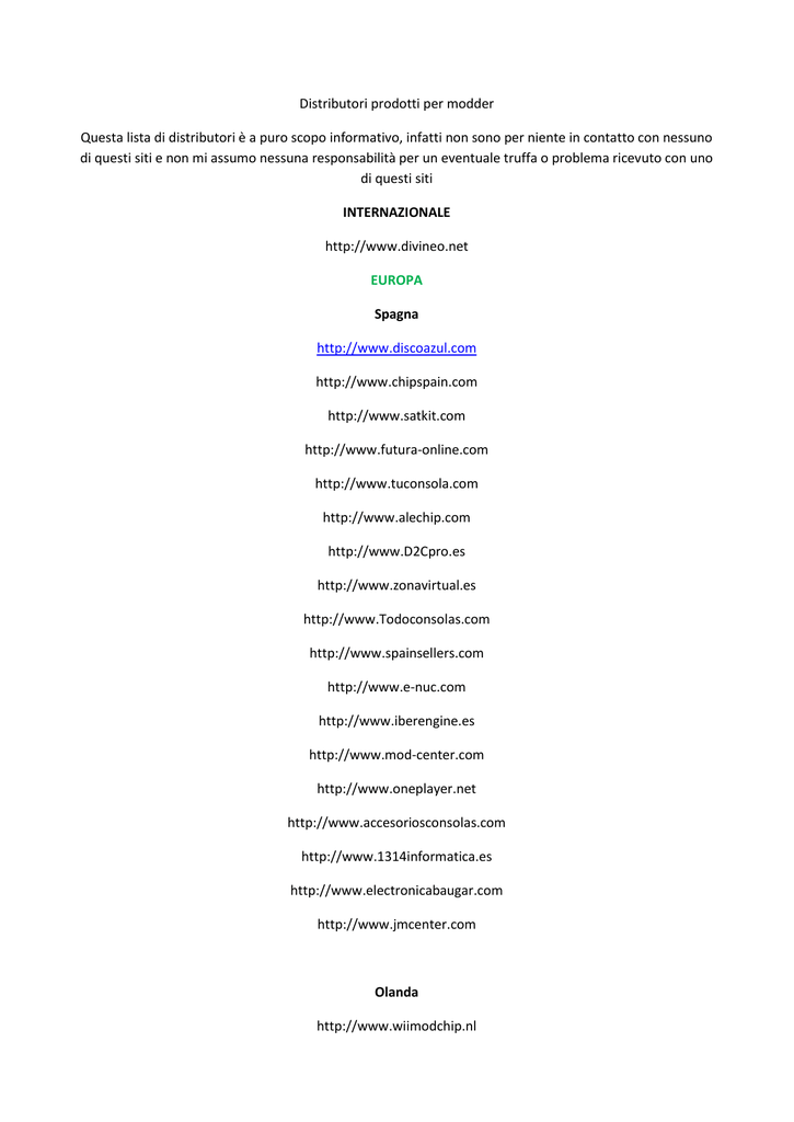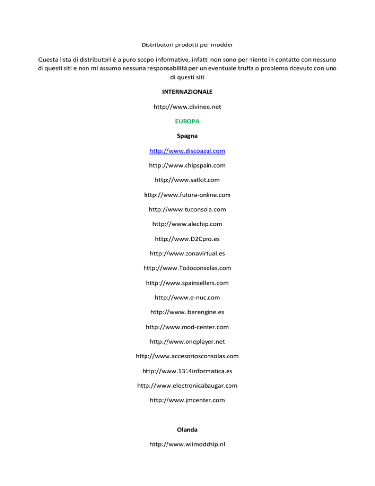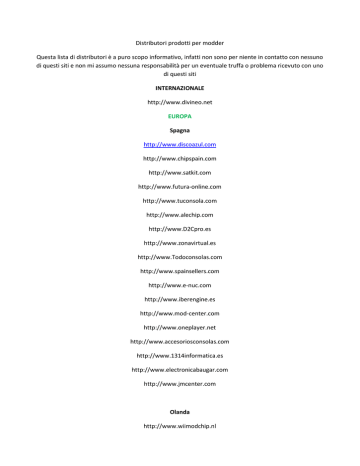 Distributori prodotti per modder Questa lista di distributori è a puro scopo informativo, infatti non sono per niente in contatto con nessuno di questi siti e non mi assumo nessuna responsabilità per un eventuale truffa o problema ricevuto con uno di questi siti INTERNAZIONALE http://www.divineo.net EUROPA Spagna http://www.discoazul.com http://www.chipspain.com http://www.satkit.com http://www.futura-online.com http://www.tuconsola.com http://www.alechip.com http://www.D2Cpro.es http://www.zonavirtual.es http://www.Todoconsolas.com http://www.spainsellers.com http://www.e-nuc.com http://www.iberengine.es http://www.mod-center.com http://www.oneplayer.net http://www.accesoriosconsolas.com http://www.1314informatica.es http://www.electronicabaugar.com http://www.jmcenter.com Olanda http://www.wiimodchip.nl http://www.consolepro.nl http://www.ConsoleModchip.com http://www.jemico.nl http://consolemodchip.com http://www.kamben.com http://www.360mods.nl http://www.ConsoleService.nl http://www.detopshop.nl/ http://www.free-box.nl http://www.gamecomputer.nl http://www.consolepro.nl http://www.quickplay.nl http://www.ombouwwinkel.nl http://www.dynamodz.com Gran Bretagna http://www.wii-chip.co.uk http://www.mxconsoles.co.uk http://xbox-entertainment.co.uk http://www.pinpointgames.com http://www.modchip-store.co.uk http://www.360upgrades.co.uk http://www.umodfo.com http://www.hanger.org.uk http://www.consolextreme.com http://www.consolebits.co.uk http://shopneo.co.uk http://mrmodchips.com http://kanection.co.uk http://www.modchip.com Italia http://www.hardstore.com http://www.dvdmod.it http://www.modchip.it http://www.bubz.it http://www.masterixweb.com http://www.lgagroup.it/it/dept_27.html Francia http://www.foxchip.com http://www.ominfo.com/ http://www.nextgenchip.com http://www.consolemod.net http://www.siliteo.com http://www.consolepuce.fr http://www.ctdteam.fr http://www.metashop-fr.com Germania http://www.mod-chip.bz http://www.console24.com http://www.gamefreax.de http://www.hjconsoletuning.eu Svezia http://manzzon.com http://www.rejoy.se http://www.modchip.nu http://wwww.konsolfaktor.se http://www.chipper.se http://www.console.se http://www.psxcare.com/ Portogallo http://www.chip-pt.com Austria http://www.console.at http://www.consolendesign.at http://www.jacksonmods.at http://www.konsolenmodding.at Svizzera http://www.site.ch http://www.goodboost.com http://www.videogame.ch Danimarca http://www.mm-konsol.dk http://www.chip-kolding.dk Norvegia http://www.digistore.no http://www.modnet.no Altri http://SHOP.01media.com http://www.mod-chip.com http://www.pegaxy.com AMERICA Canada http://www.modchipcentral.com http://www.modchip.ca http://www.canadamods.ca http://www.gmodz.ca http://www.consolesource.com http://www.mad-mods.com http://www.canadamods.ca http://www.gamersection.ca http://www.cellexmods.com http://www.modchip-depot.com Stati Uniti http://www.foundmy.com http://www.modchip.org http://www.consolesource.com http://www.mygamingmart.com http://www.dubsoutlet.com http://www.modchipstore.com Messico http://www.hackerspc.net http://www.elocalx.com http://www.maximusgames.net http://www.demerida.com http://modchipgt.info Brasile http://www.lojadohardware.net http://www.gametronic.com.br http://www.neogames.com.br Cile http://www.h2zone.cl/ ASIA Tailandia http://www.eurasia.nu Hong Kong http://www.hardstore.hk http://www.rambogames.com http://www.topmodders.com http://www.vsutech.com Cina http://www.icboss.com Korea http://www.plus-game.com TaiWan http://www.pianko.net Altri http://www.neoasic.com OCEANIA Australia http://www.techsick.com http://www.ozmodchips.com http://www.quantronics.com.au http://www.modsupplier.com http://www.xecuter.com.au http://www.promods.com.au http://www.redboxmodds.com http://www.modariffic.com http://www.quantronics.com.au http://www.acegamestore.com.au http://www.modchip-wizard.com AFRICA ... Se volete comprare prodotti in grandi quantità rivolgetevi ad aziende cinesi che troverete su http://www.alibaba.com