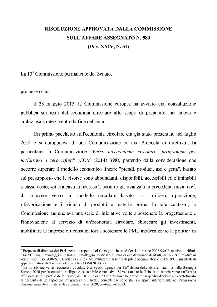 RISOLUZIONE APPROVATA DALLA COMMISSIONE SULL'AFFARE ASSEGNATO N. 580 (Doc. XXIV, N. 51) La 13a Commissione permanente del Senato, premesso che: il 28 maggio 2015, la Commissione europea ha avviato una consultazione pubblica sui temi dell'economia circolare allo scopo di preparare una nuova e ambiziosa strategia entro la fine dell'anno. Un primo pacchetto sull'economia circolare era già stato presentato nel luglio 2014 e si componeva di una Comunicazione ed una Proposta di direttiva 1. In particolare, la Comunicazione "Verso un'economia circolare: programma per un'Europa a zero rifiuti" (COM (2014) 398), partendo dalla considerazione che occorre superare il modello economico lineare "prendi, produci, usa e getta", basato sul presupposto che le risorse sono abbondanti, disponibili, accessibili ed eliminabili a basso costo, sottolineava la necessità, peraltro già avanzata in precedenti iniziative 2, di muovere verso un modello circolare basato su riutilizzo, riparazione, rifabbricazione e il riciclo di prodotti e materie prime. In tale contesto, la Commissione annunciava una serie di iniziative volte a sostenere la progettazione e l'innovazione al servizio di un'economia circolare, sbloccare gli investimenti, mobilitare le imprese e i consumatori e sostenere le PMI, modernizzare la politica in 1 Proposta di direttiva del Parlamento europeo e del Consiglio che modifica le direttive 2008/98/CE relativa ai rifiuti, 94/62/CE sugli imballaggi e i rifiuti di imballaggio, 1999/31/CE relativa alle discariche di rifiuti, 2000/53/CE relativa ai veicoli fuori uso, 2006/66/CE relativa a pile e accumulatori e ai rifiuti di pile e accumulatori e 2012/19/UE sui rifiuti di apparecchiature elettriche ed elettroniche (COM(2014)397). 2 La transizione verso l'economia circolare è al centro agenda per l'efficienza delle risorse stabilita nella Strategia Europa 2020 per la crescita intelligente, sostenibile e inclusiva. Si veda anche la Tabella di marcia verso un'Europa efficiente sotto il profilo delle risorse, del 2011, in cui la Commissione ha proposto un quadro d'azione e ha sottolineato la necessità di un approccio integrato su più livelli, concetti che sono stati sviluppati ulteriormente nel Programma d'azione generale in materia di ambiente fino al 2020, adottato nel 2013. materia di rifiuti, affrontare le problematiche specifiche e stabilire un obiettivo in termini di uso efficiente delle risorse. La proposta di direttiva sui rifiuti, rispondendo all’obbligo giuridico di riesame degli obiettivi inerenti alla gestione dei rifiuti contenuti in tre direttive precedenti, introduceva alcune modifiche che riguardavano, tra l'altro, l'allineamento delle definizioni e la soppressione di obblighi giuridici obsoleti, la semplificazione e la razionalizzazione degli obblighi di rendicontazione, l'introduzione di un sistema di segnalazione preventiva per il controllo della conformità agli obiettivi di riciclaggio, l'introduzione di condizioni minime per il regime della responsabilità estesa del produttore (EPR), l'aumento al 70 per cento dell’obiettivo di preparazione per il riutilizzo e di riciclaggio dei rifiuti urbani entro il 2030, l'aumento degli obiettivi di riutilizzo e riciclaggio dei rifiuti di imballaggio e le restrizioni al collocamento in discarica dei rifiuti urbani non residui entro il 2030. Il pacchetto si componeva di altre tre comunicazioni: una sull'efficienza delle risorse nell'edilizia3; una sull'occupazione verde4 e una relativa a un piano d'azione verde per le imprese5. Sulla Proposta di direttiva sui rifiuti e sulla Comunicazione "Verso un'economia circolare: programma per un'Europa a zero rifiuti", la Commissione ambiente, territorio, beni ambientali del Senato della Repubblica ha approvato due distinte risoluzioni il 7 ottobre 2014 e il 19 novembre 2014. Con la prima risoluzione (DOCXVIII, n. 74) sulla proposta di direttiva sui rifiuti, la Commissione si è espressa in senso favorevole auspicando l'aggiornamento delle misure riguardanti il mantenimento e l'eventuale realizzazione di impianti di termovalorizzazione sul territorio nazionale e raccomandando la gradualità necessaria 3 Comunicazione della Commissione al Parlamento europeo, al Consiglio, al Comitato economico e sociale europeo e al Comitato delle Regioni - Opportunità per migliorare l'efficienza delle risorse nell'edilizia. (COM(2014)445) 4 Comunicazione della Commissione al Parlamento europeo, al Consiglio, al Comitato economico e sociale europeo e al Comitato delle Regioni - Iniziativa per favorire l'occupazione verde:Sfruttare le potenzialità dell'economia verde di creare posti di lavoro (COM(2014)446). 5 Comunicazione della Commissione al Parlamento europeo, al Consiglio, al Comitato economico e sociale europeo e al Comitato delle Regioni - Piano d'azione verde per le PMI: aiutare le PMI a trasformare le sfide ambientali in opportunità di business (COM(2014) 440). per non compromettere la competitività del tessuto produttivo. Sono state altresì sollecitate azioni mirate a ridurre lo spreco alimentare, che prendano in considerazione le cause di tale fenomeno, definiscano una gerarchia per l'uso degli alimenti e prevedano una semplificazione amministrativa e fiscale per agevolare progetti di recupero, nonché l'avvio di iniziative di sensibilizzazione verso i consumatori italiani e stranieri. La Commissione europea ha risposto con lettera dell'11 maggio 2015, informando di aver provveduto al ritiro della proposta il 25 febbraio scorso, e annunciando la presentazione di nuovo e più ambizioso pacchetto che terrà conto del contributo del Senato italiano. Nella seconda risoluzione (DOC XVIII, n. 80), relativa alla Comunicazione "Verso un'economia circolare: programma per un'Europa a zero rifiuti", la Commissione ambiente del Senato si è espressa favorevolmente ponendo l'accento sulla necessità di proseguire il percorso, già avviato con la direttiva quadro rifiuti, verso una società del riciclo, ripensando i pr