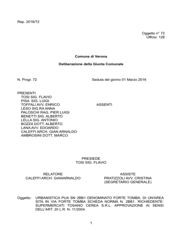 Rep. 2016/72 Oggetto n° 72 Ufficio: 128 Comune di Verona Deliberazione della Giunta Comunale N. Progr. 72 Seduta del giorno 01 Marzo 2016 PRESENTI TOSI SIG. FLAVIO PISA SIG. LUIGI TOFFALI AVV. ENRICO LESO SIG.RA ANNA PALOSCHI RAG. PIER LUIGI BENETTI SIG. ALBERTO LELLA SIG. ANTONIO BOZZA DOTT. ALBERTO LANA AVV. EDOARDO CALEFFI ARCH. GIAN ARNALDO AMBROSINI DOTT. MARCO ASSENTI PRESIEDE TOSI SIG. FLAVIO RELATORE CALEFFI ARCH. GIANARNALDO Oggetto: ASSISTE PRATIZZOLI AVV. CRISTINA (SEGRETARIO GENERALE) URBANISTICA PUA SN 2BB1 DENOMINATO FORTE TOMBA, DI UN'AREA SITA IN VIA FORTE TOMBA SCHEDA NORMA N. 2BB1. RICHIEDENTE: SUPERMERCATI TOSANO CEREA S.R.L. APPROVAZIONE AI SENSI DELL'ART. 20 L.R. N. 11/2004. 1 LA GIUNTA COMUNALE Premesso che: • il Comune di Verona è dotato di PAT, approvato con deliberazione della Giunta Regionale per il Veneto n. 4148 del 18 dicembre 2007 e di Piano degli Interventi (P.I.) approvato con deliberazione di Consiglio Comunale n. 91 del 23 dicembre 2011; • in data 31 dicembre 2014 con P.G. 364,624, la Ditta Supermercati Tosano S.r.l. ha presentato richiesta di approvazione del Piano Urbanistico Attuativo (PUA) dell’ambito di trasformazione oggetto di accordo di pianificazione ai sensi dell’art. 6 L.R. n. 11/2004, sottoscritto in forma pubblica in data 26 giugno 2012, con atto del notaio Laura Curzel da Verona rep. n. 39620 racc. n. 11296, registrato e trascritto; • in data 8 gennaio 2015, con nota P.G. 3663 è stato comunicata l'improcedibilità dovuta alla mancanza di documenti inerenti i titoli di proprietà; • in data 13 gennaio 2015 con P.G. 8359, la Ditta Supermercati Tosano S.r.l. ha presentato nuova richiesta di approvazione del Piano Urbanistico Attuativo (PUA) dell’ambito di trasformazione oggetto di accordo di pianificazione ai sensi dell’art. 6 L.R. n. 11/2004, allegando i titoli di proprietà; • contestualmente agli elaborati del PUA venivano depositati anche gli elaborati del progetto preliminare dell'opera pubblica da realizzare a scomputo del contributo di sostenibilità, come previsto nel citato accordo ai sensi dell'art. 6 della L.R. n. 11/2004; • in data 6 febbraio 2015 P.G. n. 39523 è stato richiesto il parere di competenza alla 5^ Circoscrizione; • in data 24 febbraio 2015 si è tenuta la Conferenza dei Servizi convocata con nota 5 febbraio 2015 P.G. n. 39336, per l'esame contestuale degli interessi pubblici coinvolti. La conferenza si è conclusa con esito favorevole condizionato alle modifiche/integrazioni espresse in tale sede; • in data 4 marzo 2015 P.G. n. 67564 la 5^ Circoscrizione ha fatto pervenire il suo parere favorevole; • in data 6 marzo 2015, P.G. n. 69627 sono state inviate alla Ditta Attuatrice ed al professionista incaricato le risultanze della Conferenza dei Servizi e la conseguente richiesta di integrazioni/modifiche, con sospensione dei termini; • quanto richiesto è stato depositato, dal professionista incaricato, con nota P. G. n. 154487 in data 27 maggio 2015; • in data 4 giugno 2015 P.G. n. 161073 è stato nuovamente richiesto il parere di competenza alla 5^ Circoscrizione; • in data 16 giugno 2015 si è tenuta la seconda seduta della Conferenza dei Servizi convocata con nota 5 giugno 2015 P.G. n. 162662, per l'esame contestuale degli interessi pubblici coinvolti. La conferenza si è conclusa con esito favorevole condizionato ad ulteriori modifiche/integrazioni espresse in tale sede; • in data 10 luglio 2015 P.G. n. 202.783 la 5^ Circoscrizione ha fatto pervenire il suo parere favorevole con le seguenti osservazioni: “l'intervento appare pragmaticamente la miglior possibilità di recupero del sedime storico, proteggendo il forte come preesistenza storica e valorizzandone la conoscenza grazie ad un opportuno intervento di conservazione. Si auspica che all'interno della struttura si possa ricavare un piccolo spazio per presentare la storia del luogo e del manufatto. Riguardo alle opere stradali, si richiede che in prossimità degli svincoli di uscita ed entrata in S.S. siano posizionati degli opportuni dissuasori al fine di impedire immissioni pericolose. Si raccomanda, inoltre, una particolare attenzione per quanto riguarda il braccio di uscita nella rotatoria su via Pasteur con direzione via Fleming poiché appare poco fluida per il tipo di traffico presente”; • in data 22 giugno 2015, P.G. n. 179533 sono state inviate alla Ditta Attuatrice ed al professionista incaricato le risultanze della seconda seduta della Conferenza dei Servizi e la conseguente 2 • • • • richiesta di integrazioni/modifiche, con mantenimento della sospensione dei termini, di cui alla precedente nota del 6 marzo 2015, P.G. n. 69627; quanto richiesto è stato depositato, dal professionista incaricato, con nota P. G. n. 279641 in data 29 settembre 2015 secondo le risultanze della Conferenza dei Servizi del 16 giugno 2015; in data 28 ottobre 2015, con Delibera di Giunta Comunale n. 330 il PUA “Forte Tomba” è stato adottato e contestualmente è stato approvato il progetto il progetto preliminare dell'opera pubblica; con nota PG.320559 del 3 novembre 2015 è stata comunicata alla Ditta l'avvenuta adozione e l'invito ad attivare la procedura V.A.S. presso la Regione; in data 17 febbraio 2016 prot. 62888 Class. C101 (ns. protocollo 53566 del 18 febbraio 2016), la Regione ha comunicato l'avviso di pubblicazione del parere espresso della Commissione V.A.S. il 01 febbraio 2016 relativamente a “Verifica di Assoggettabilità per il PUA di iniziativa privata ambito ATO4 area ex Forte Tomba Via Golino Comune di Verona”; Richiamato che: • l'ambito di intervento si trova in località Forte Tomba (Via Forte Tomba), ricade in Circoscrizione 5^. Ha una superficie territoriale di mq. 44.255 tutti di proprietà della Ditta Proponente il PUA. La proposta di PUA riguarda la realizzazione di una grande struttura di vendita, avente SUL massima di 10.000 mq., e contestualmente la realizzazione di aree standard a parcheggi