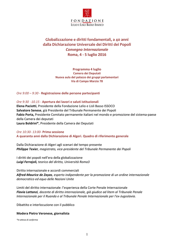 Globalizzazione e diritti fondamentali, a 40 anni dalla Dichiarazione Universale dei Diritti dei Popoli Convegno Internazionale Roma, 4 - 5 luglio 2016 Programma 4 luglio Camera dei Deputati Nuova aula del palazzo dei gruppi parlamentari Via di Campo Marzio 78 Ore 9:00 – 9:30 - Registrazione delle persone partecipanti Ore 9:30 -10.15 - Apertura dei lavori e saluti istituzionali Elena Paciotti, Presidente della Fondazione Lelio e Lisli Basso ISSOCO Salvatore Senese, già Presidente del Tribunale Permanente dei Popoli Fabio Porta, Presidente Comitato permanente italiani nel mondo e promozione del sistema-paese della Camera dei deputati Laura Boldrini*, Presidente della Camera dei Deputati Ore 10:30- 13:00- Prima sessione A quaranta anni dalla Dichiarazione di Algeri. Quadro di riferimento generale Dalla Dichiarazione di Algeri agli scenari del tempo presente Philippe Texier, magistrato, vice-presidente del Tribunale Permanente dei Popoli I diritti dei popoli nell’era della globalizzazione Luigi Ferrajoli, teorico del diritto, Università Roma3 Diritto internazionale e accordi commerciali Alfred-Maurice de Zayas, esperto indipendente per la promozione di un ordine internazionale democratico ed equo delle Nazioni Unite Limiti del diritto internazionale: l’esperienza della Corte Penale Internazionale Flavia Lattanzi, docente di diritto internazionale, già giudice ad litem al Tribunale Penale Internazionale per il Ruanda e al Tribunale Penale Internazionale per l'ex-Jugoslavia. Dibattito e interlocuzione con il pubblico Modera Pietro Veronese, giornalista *In attesa di conferma 1 ore 14:30 – 17:30 - Seconda Sessione I popoli come soggetti di diritto Impunità, giustizia transizionale e diritto dal basso Javier Giraldo Moreno, gesuita, componente del Centro de Investigación y Educación Popular (Cinep), Colombia Memorie resistenti e diritto dei popoli alla parola Carlos Beristain, medico, esperto di violenza e diritti umani, Università Pedro Arrupe, Bilbao I migranti, nuovo popolo della globalizzazione Fulvio Vassallo Paleologo, giurista, Università di Palermo Diritti di genere: la negazione del salario vitale come violenza Mary E. John, Centre for Women Development Studies, India La lotta per la dignità delle minoranze e dei popoli indigeni Mrinal Kanti Tripura, direttore Maleya Foundation, Bangladesh Interventi dal pubblico e dibattito Modera Anna Maria Giordano, Radio 3 Mondo, RAI Programma 5 luglio LUMSA - Sala convegni Giubileo Via di Porta Castello, 44 Ore 9:00 - 9:30 - Registrazione delle persone partecipanti Ore 9:30 – 11:30 - Terza Sessione Le sfide per i diritti dei popoli Finanziarizzazione dell’economia: quale spazio per la democrazia? Roberto Schiattarella, economista, Università di Camerino Diritti dei popoli e ambiente Antoni Pigrau Solé, professore di Diritto all’Università Rovira y Virgili di Tarragona Crimini contro i popoli nel diritto penale internazionale Daniel Feierstein, sociologo, Università Tres de Febrero e Università di Buenos Aires Europa dei diritti: retorica o futuro? Luciana Castellina, giornalista e scrittrice Interventi dal pubblico e dibattito 2 11:30 – 12:00 Coffee break ore 12:00 – 13:30 - Quarta sessione Strategie e azioni di promozione dei diritti dei popoli La sovranità dei popoli: piattaforme e reti sociali come resistenza e promozione dei diritti Brid Brennan, Transnational Institute, Amsterdam I media e i diritti: alto tasso d'informazione, basso tasso di verità Luis Badilla, giornalista e direttore de Il sismografo Il ruolo del Tribunale Permanente dei Popoli Gianni Tognoni, segretario generale del Tribunale Permanente dei Popoli Interventi dal pubblico e dibattito Modera Nicoletta Dentico, Fondazione Lelio e Lisli Basso ISSOCO Ore 13:30 – 14:00 - Sessione finale Il futuro dei diritti dei popoli Franco Ippolito, presidente del Tribunale Permanente dei Popoli È necessario confermare alla mail della segreteria la presenza entro il 24 giugno. Per disposizioni della Camera dei Deputati, è obbligatorio un documento d’identità valido e per gli uomini indossare la giacca. Sarà a disposizione del pubblico in sala la traduzione simultanea nelle seguenti lingue: inglese e spagnolo. Segreteria organizzativa: Fondazione Basso Tel. 06 6879953 – email: [email protected] 3 La Dichiarazione di Algeri: genesi, evoluzione e attualità Il 4 luglio 1976 ad Algeri, per iniziativa di Lelio Basso, veniva proclamata la Dichiarazione universale dei diritti dei popoli. Si è trattato dell’esito di un complesso percorso, in coincidenza con il compimento - salvo poche eccezioni – del trentennale processo di decolonizzazione avviato nel secondo dopoguerra. Con la creazione dell’Organizzazione delle Nazioni Unite nel 1945, la riaffermazione dei “principi di Norimberga” da parte dell’Assemblea dell’ONU nel 1946, la Dichiarazione universale dei diritti umani approvata nel 1948, si era verificata una sorta di rivoluzione nell’ordinamento internazionale: venivano a far parte del diritto internazionale vigente i principi della pace, dei diritti umani e dell’autodeterminazione dei popoli. In assenza di un’effettiva giurisdizione internazionale che garantisse il rispetto di questo ordinamento profondamente rinnovato, si costituì, nel 1966, per opera di Bertrand Russell e di Jean Paul Sartre, e con la partecipazione di illustri intellettuali e giuristi dell’epoca, fra i quali Lelio Basso, il “Tribunale Internazionale Contro i Crimini di Guerra”, un tribunale d’opinione conosciuto anche come Tribunale Russell. Un’analoga istituzione fu creata per impulso di Lelio Basso, il “Tribunale Russell II sull’America Latina”, che operò dal marzo 1974 al gennaio 1976. Esso ebbe una vasta eco e suscitò una vasta mobilitazione. Dall’esperienza di queste due originali iniziative nacque la convinzione che fosse necessario porre mano alla stesura di un testo che raccogliesse le norme e i principi, tratti dall’interpretazion
