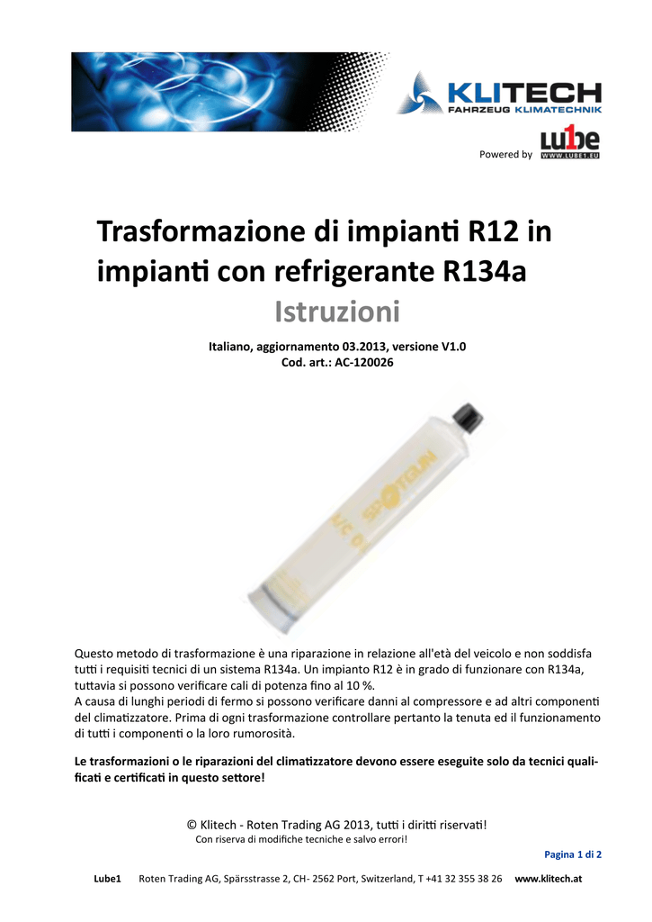 Powered by Trasformazione di impianti R12 in impianti con refrigerante R134a Istruzioni Italiano, aggiornamento 03.2013, versione V1.0 Cod. art.: AC-120026 Questo metodo di trasformazione è una riparazione in relazione all'età del veicolo e non soddisfa tutti i requisiti tecnici di un sistema R134a. Un impianto R12 è in grado di funzionare con R134a, tuttavia si possono verificare cali di potenza fino al 10 %. A causa di lunghi periodi di fermo si possono verificare danni al compressore e ad altri componenti del climatizzatore. Prima di ogni trasformazione controllare pertanto la tenuta ed il funzionamento di tutti i componenti o la loro rumorosità. Le trasformazioni o le riparazioni del climatizzatore devono essere eseguite solo da tecnici qualificati e certificati in questo settore! © Klitech - Roten Trading AG 2013, tutti i diritti riservati! Con riserva di modifiche tecniche e salvo errori! Pagina 1 di 2 Lube1 Roten Trading AG, Spärsstrasse 2, CH- 2562 Port, Switzerland, T +41 32 355 38 26 www.klitech.at Attrezzi necessari 1 Per il rifornimento con olio retrofit sono necessari i seguenti attrezzi ed adattatori: 1 pressa Spotgun: AC-471539 (1) 1 tubo flessibile adattatore Spotgun LP – R134a: AC-471535 (2) A seconda del veicolo i due adattatori di collegamento 3 del set Flan14all4 - R134a: AC-120003 (3) 2 Procedimento Utilizzare sempre guanti di sicurezza ed occhiali di protezione quando di lavora sui climatizzatori di veicoli. Il climatizzatore deve essere trasformato solo da tecnici esperti nel settore dei climatizzatori. 1. 2. 3. 4. 5. 6. 7. 8. 9. 10. 11. 12. Aspirare il refrigerante dall'impianto mediante il compressore di aspirazione a parte e smaltirlo in modo corretto (recipiente di raccolta di refrigerante esausto). Eseguire sempre una prova di tenuta dell'impianto evacuato mediante azoto al fine di individuare eventuali perdite. Si raccomanda di sostituire sempre il deumidificatore (esistono granulati deumidificatori non adatti per l'impiego con R134a). Rimuovere dal veicolo le valvole Schrader (inserti) degli attacchi per R12. Applicare gli adattatori in dotazione e serrarli a fondo (bassa pressione = diametro piccolo). Questi adattatori rimangono sul veicolo! Generare un vuoto spinto per almeno 45 minuti (processo di evacuazione minimo 45 minuti). Riempire l'impianto mediante la pressa Spotgun con massimo 60 ml di olio 488108E. Nella maggior parte dei casi gli impianti con R12 sono dimensionati per 180-300 ml di olio, la quantità supplementare di olio deve essere ben compatibile nel sistema R12, perché il nuovo deumidificatore è in grado di assorbire olio. È consigliabile di ruotare poi a mano il compressore del climatizzatore per far distribuire meglio l'olio all'interno del compressore. Rifornire l'impianto di una quantità di refrigerante R134a ridotta del 15-20 % rispetto alla quantità originaria di R12. Accendere 10 volte il climatizzatore e spegnerlo subito dopo per far distribuire i materiali di esercizio nel sistema. Misurare le pressioni sui due attacchi di manutenzione. Eseguire un test ordinario della potenza e rifornire l'impianto di soluzione di contrasto per poter individuare più tardi le eventuali perdite. Se la potenza di raffreddamento e le pressioni sono troppo basse, aumentare il volume di refrigerante aggiungendo il 5% di refrigerante. Incollare un'etichetta di manutenzione sul climatizzatore e riportarvi chiaramente la trasformazione del sistema sul refrigerante R134a. Pagina 2 di 2 Lube1 Roten Trading AG, Spärsstrasse 2, CH- 2562 Port, Switzerland, T +41 32 355 38 26 www.klitech.at