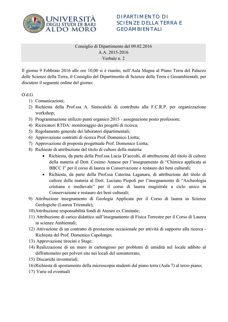 Verbale n. 2 del Consiglio di Dipartimento del 09.02.2016
