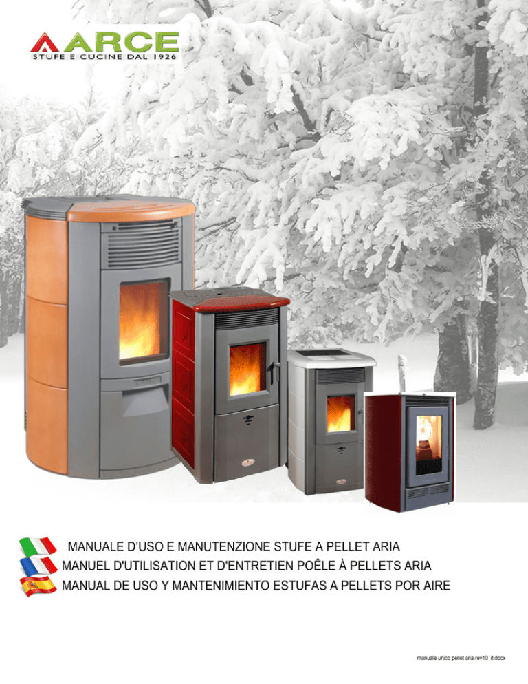 MANUALE D’USO E MANUTENZIONE STUFE A PELLET ARIA MANUEL D'UTILISATION ET D'ENTRETIEN POÊLE À PELLETS ARIA MANUAL DE USO Y MANTENIMIENTO ESTUFAS A PELLETS POR AIRE manuale unico pellet aria rev10 it.docx ARCE STUFE S.r.l. si riserva il diritto di variare le caratteristiche e i dati riportati nel presente fascicolo in qualunque momento e senza preavviso alcuno col fine di miglioramento dei prodotti. QUESTO MANUALE NON PUO’ ESSERE QUINDI CONSIDERATO COME CONTRATTO NEI CONFRONTI DI TERZI. ARCE STUFE S.r.l. se réserve le droit de modifier les caractéristiques et les données contenues dans le présent document à tout moment et sans préavis en vue d'améliorer les produits. CE MANUEL NE PEUT 'ETRE CONSIDERE COMME UN CONTRAT POUR UN TIERS. ARCE STUFE S.r.l. se reserva el derecho de modificar las características y datos contenidos en este documento en cualquier momento sin previo aviso con el fin de mejorar los productos. ESTE MANUAL NO PUEDE 'SER CONSIDERADOS COMO CONTRATO DE TERCEROS. ARCE STUFE S.r.l. reserves the right to change features and data contained in this document at any time without prior notice with a view to improving products. THIS MANUAL MAY NOT 'BE BE CONSIDERED AS CONTRACT TO ANY THIRD PARTY. Le informazioni contenute in questo manuale sono di proprietà della ARCE STUFE SRL E’ vietata la riproduzione, anche parziale, senza preventiva autorizzazione scritta della ARCE STUFE SRL La ARCE STUFE SRL si riserva il diritto di modificare, senza preavviso, le caratteristiche dell’impianto presentato in questo manuale. Les informations contenues dans ce document sont la propriété de ARCE STUFE SRL Et interdites la reproduction, même partielle, sans l'autorisation écrite préalable de ARCE STUFE SRL ARCE STUFE SRL se réserve le droit de modifier, sans préavis, les caractéristiques du système présenté dans ce manuel. La información contenida en este documento son propiedad de ARCE STUFE SRL La reproducción, incluso parcial, sin la previa autorización por escrito de ARCE STUFE SRL ARCE STUFE SRL se reserva el derecho de modificar, sin previo aviso, las características del sistema se presentan en este manual. The information contained in this document are the property of ARCE STUFE SRL The reproduction, even partial, without the prior written permission of ARCE STUFE SRL ARCE STUFE SRL reserves the right to change, without notice, the characteristics of the system presented in this manual. Sommario 2 INDICE ITALIANO ....................................................................................................................................................................................................................................................... 6 IL PELLET: UNO SCARTO CHE DIVENTA UNA RISORSA. ...................................................................................................................................................................... 6 INFORMAZIONI PRELIMINARI..................................................................................................................................................................................................................... 6 AVVERTENZE GENERALI E DI SICUREZZA ................................................................................................................................................ 6 DISIMBALLAGGIO ........................................................................................................................................................................................................................................ 6 INSTALLAZIONE ........................................................................................................................................................................................................................................... 6 SCELTA DEL LOCALE ............................................................................................................................................................................ 6 POSIZIONAMENTO ................................................................................................................................................................................ 6 IMPIANTO EVACUAZIONE FUMI ................................................................................................................................................................................................................. 7 CANALE DA FUMO ................................................................................................................................................................................ 7 CANNA FUMARIA (CAMINO) ................................................................................................................................................................... 7 COMIGNOLO ........................................................................................................................................................................................ 7 ASPIRAZIONE ARIA COMBURENTE .......................................................................................................................................................... 8 FUNZIONI DI AUTOPROTEZIONE ............................................................................................................................................................................................................... 8 PROTEZIONE ELETTRICA....................................................................................................................................................................... 8 Fusibile di protezione da sovraccarichi. ....................................................................................................................................... 8 FUNZIONI DI SICUREZZA ED ALLARMI .............................................................................................