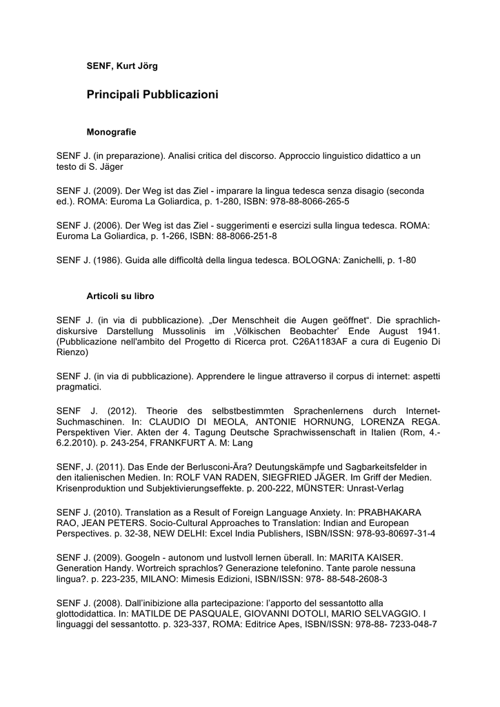 SENF, Kurt Jörg Principali Pubblicazioni Monografie SENF J. (in preparazione). Analisi critica del discorso. Approccio linguistico didattico a un testo di S. Jäger SENF J. (2009). Der Weg ist das Ziel - imparare la lingua tedesca senza disagio (seconda ed.). ROMA: Euroma La Goliardica, p. 1-280, ISBN: 978-88-8066-265-5 SENF J. (2006). Der Weg ist das Ziel - suggerimenti e esercizi sulla lingua tedesca. ROMA: Euroma La Goliardica, p. 1-266, ISBN: 88-8066-251-8 SENF J. (1986). Guida alle difficoltà della lingua tedesca. BOLOGNA: Zanichelli, p. 1-80 Articoli su libro SENF J. (in via di pubblicazione). „Der Menschheit die Augen geöffnet“. Die sprachlichdiskursive Darstellung Mussolinis im ‚Völkischen Beobachter’ Ende August 1941. (Pubblicazione nell'ambito del Progetto di Ricerca prot. C26A1183AF a cura di Eugenio Di Rienzo) SENF J. (in via di pubblicazione). Apprendere le lingue attraverso il corpus di internet: aspetti pragmatici. SENF J. (2012). Theorie des selbstbestimmten Sprachenlernens durch InternetSuchmaschinen. In: CLAUDIO DI MEOLA, ANTONIE HORNUNG, LORENZA REGA. Perspektiven Vier. Akten der 4. Tagung Deutsche Sprachwissenschaft in Italien (Rom, 4.6.2.2010). p. 243-254, FRANKFURT A. M: Lang SENF, J. (2011). Das Ende der Berlusconi-Ära? Deutungskämpfe und Sagbarkeitsfelder in den italienischen Medien. In: ROLF VAN RADEN, SIEGFRIED JÄGER. Im Griff der Medien. Krisenproduktion und Subjektivierungseffekte. p. 200-222, MÜNSTER: Unrast-Verlag SENF J. (2010). Translation as a Result of Foreign Language Anxiety. In: PRABHAKARA RAO, JEAN PETERS. Socio-Cultural Approaches to Translation: Indian and European Perspectives. p. 32-38, NEW DELHI: Excel India Publishers, ISBN/ISSN: 978-93-80697-31-4 SENF J. (2009). Googeln - autonom und lustvoll lernen überall. In: MARITA KAISER. Generation Handy. Wortreich sprachlos? Generazione telefonino. Tante parole nessuna lingua?. p. 223-235, MILANO: Mimesis Edizioni, ISBN/ISSN: 978- 88-548-2608-3 SENF J. (2008). Dall’inibizione alla partecipazione: l’apporto del sessantotto alla glottodidattica. In: MATILDE DE PASQUALE, GIOVANNI DOTOLI, MARIO SELVAGGIO. I linguaggi del sessantotto. p. 323-337, ROMA: Editrice Apes, ISBN/ISSN: 978-88- 7233-048-7 SENF J. (2006). Das Vorkommen lernhemmender Sprachangst bei italienischen Studierenden. In: ULRIKE REEG. Interkultureller Fremdsprachenunterricht: Grundlagen und Perspektiven. p. 121-133, BARI: Edizioni di pagina, ISBN/ISSN: 88- 7470-026-1 SENF J. (2006). Lingua straniera uguale paura?. In: FRANCESCA CABASINO. La “nuova Europa” tra identità culturale e comunità politica. p. 151-166, ROMA: Aracne, ISBN/ISSN: 88548-0621-8 SENF J. (2005). Die Angst beim Sprachenlernen: Empirische Ergebnisse zum hinzugefügten Fehler. In: CLAUDIO DI MEOLA, ANTONIE HORNUNG, LORENZA REGA. Perspektiven Eins. Akten der 1. Tagung Deutsche Sprachwissenschaft in Italien (Roma, 06-07/02/2004). p. 515-534, ROMA: Istituto Italiano di Studi Germanici SENF J. (2004). Sprachen lernen und lehren: Überschreiten der selbstverschuldeten Unmündigkeit. In: MARLIES KRAINZ- DRR, HILDEGARD ENZINGER, MICHAELA SCHMOCZER. Grenzen überschreiten in Bildung und Schule. p. 16-22, KLAGENFURT: Drava, 2004, ISBN/ISSN: 3-85435-427-4 SENF J. (1994). Approcci pratici al Computer Assisted Language Learning. In: GIUSEPPE G. CASTORINA. Università, formazione linguistica, tecnologie didattiche avanzate. p. 131-139, ROMA: Monduzzi Articoli su rivista SENF J. (in via di pubblicazione). Imparare le lingue ovunque, con piacere. Googlando. Riflessioni e proposte sull’uso dei motori di ricerca in internet. LIST. QUADERNI DI STUDI LINGUISTICI, (10-22, 14) SENF, J. (2011). „Unser Schutzschild ist das Buch!“ Stimmen aus dem Studentenkollektiv. DISS-JOURNAL Zeitschrift des Duisburger Instituts für Sprach- und Sozialforschung 22, 1820 SENF J. (2007). Denglisch e l’utilità dell’inglese per l’insegnamento del tedesco. LIST. QUADERNI DI STUDI LINGUISTICI, vol. 12/13; p. 145-156 SENF J. (2004). Lernhemmungen in der Unterrichtspraxis: Untersuchung zum hinzugefügten Fehler im Diktat. DAF WERKSTATT, vol. 3; p. 27-45 SENF J. (2003). „Stato di minorità” e ansia nell’apprendimento della lingua straniera: indagine sull’errore aggiunto. LIST. QUADERNI DI STUDI LINGUISTICI, vol. 10/11; p. 163-194 SENF J. (2003). Il discorso tedesco di Giovanni Trapattoni, “estasi della critica linguistica”. IL TRADUTTORE NUOVO, vol. LVIII; p. 63-84 SENF J. (2001). „Na, wie fühlen Sie sich...?“ - Plakatwerbung der Grünen und der FDP zur Europawahl. LIST. QUADERNI DI STUDI LINGUISTICI, vol. 8/9; p. 67-88 SENF J. (1999). Lingua tedesca fra disciplina e evasione: L'Ausländerdeutsch di Giovanni Trapattoni. LIST. QUADERNI DI STUDI LINGUISTICI, vol. 6/7; p. 287-309 SENF J. (1997). L'analisi della 'notizia’ politica in televisione. LIST. QUADERNI DI STUDI LINGUISTICI, vol. 4/5; p. 203-221 SENF J. (1995). Riflessioni sulla "ricerca" dell'identità culturale e personale come principio glottodidattico. LIST. QUADERNI DI STUDI LINGUISTICI, vol. 3; p. 113-127 SENF J. (1994). Sprache des Marktes als Modell'? Überlegungen zur Entwicklung der deutschen Umgangssprache. LIST. QUADERNI DI STUDI LINGUISTICI, vol. 2; p. 101-114 SENF J. (1993). “Ossis” e “Wessis”: osservazioni linguistiche su due neologismi usati per i tedeschi dell’est e dell’ovest. LIST. QUADERNI DI STUDI LINGUISTICI, vol. 1; p. 173-180