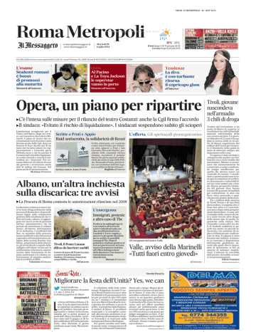 -MSGR - 11 METROPOLIT - 45 - 29/07/14-N: Roma Metropoli (C) Il Messaggero S.p.A. | ID: 00169197 | IP: 94.95.115.228 Martedì 29 Luglio 2014 [email protected] www.ilmessaggero.it 26ºC 20ºC Il Sole Sorge 5.59 Tramonta 20.33 La Luna Sorge 8.24 Cala 21.13 Gli uffici della Cronaca sono aperti dalle 11 alle 20, via del Tritone, 152, 00187 Roma T 06/4720224 - 06/4720228 F 06/4720446 L’esame Studenti romani è boom di promossi alla maturità Ostia Al Pacino e La Toya Jackson le superstar vanno in porto Tendenze La diva è con-turbante ritorna il copricapo glam Mozzetti all’interno Mancini all’interno all’interno Opera, un piano per ripartire C’è l’intesa sulle misure per il rilancio del teatro Costanzi: anche la Cgil firma l’accordo `Il sindaco: «Evitato il rischio di liquidazione». I sindacati sospendono subito gli scioperi ` Liquidazione scongiurata per il Teatro dell’Opera. Dopo un vertice con l’assessore alla Cultura Marinelli, il piano di rientro del sovrintentende Carlo Fuortes è stato firmato anche dalla Cgil, dopo un braccio di ferro durato più di un mese che ha fatto saltare tre rappresentazioni a Caracalla (persi 500mila euro) e che ha portato il Costanzi sull’orlo della liquidazione coatta. Giovedì e venerdì il referendum tra i lavoratori. Poi verranno sbloccati 20 milioni di euro dal governo e arriveranno anche altri 16 milioni dal Comune. Nel piano anche 65 pensionamenti. De Cicco all’interno Scritte a Prati e Appio L’offerta. Gli spettacoli proseguiranno Raid antisemita, la solidarietà di Renzi Scritta contro Anna Frank Scritte antisemite con svastiche contro Anna Frank e pro Palestina sono apparse a Prati e San Giovanni. Riccardo Pacifici, presidente della comunità ebraica romana, incontrerà il premier Renzi (che gli ha espresso solidarietà) ma anche il capo della Polizia, Alessandro Pansa, perché teme «un'escalation dell'odio legata al conflitto in Medio Oriente». Bogliolo all’interno Albano, un’altra inchiesta sulla discarica: tre avvisi `La Procura di Roma contesta le autorizzazioni rilasciate nel 2008 La discarica continua a essere sotto la lente d’ingrandimento della procura di Roma dove al procedimento legale sulla complessiva gestione dello smaltimento dei rifiuti nel Lazio, adesso, si aggiungono tre nuovi avvisi di garanzia sull’iter amministrativo che ha portato ad autorizzare il settimo invaso all’interno dell’impianto di via Ardeatina. I carabinieri del Noe, su mandato dalla procura, hanno notificato a due funzionari regionali e all’amministratore delegato della società Pontina Ambiente, proprietaria della discarica, gli avvisi dovuti a seguito delle indagini sull’ultimo invaso per la realizzazione ci furono le autorizzazioni della Valutazione di impatto ambientale e la relativa autorizzazione di impatto ambientale tra il 2008 e il 2009. Valentini all’interno L’emergenza Immigrati, proteste e altro caso di Tbc Tivoli, il Ponte Lucano difeso da barriere mobili Contro il muro di Ponte Lucano e contro la lottizzazione Nathan, il Comune chiama in causa Mibac e Ardis. All’interno Periferie in subbuglio per le voci relative all’arrivo di nuovi richiedenti asilo con due manifestazioni ieri a Casalotti e Torre Angela, e paura tra gli agenti di polizia per le notizie su possibili contagi di Tbc. Dopo il poliziotto risultato positivo al test nei giorni scorsi, ieri una nuova emergenza è scattata all'Ufficio Immigrazione della Questura. Una donna si è presentata con la mascherina. Marani all’interno Gli occupanti del teatro Valle Valle, avviso della Marinelli «Tutti fuori entro giovedì» all’interno Davide Desario Migliorare la festa dell’Unità? Yes, we can FestaUnitàRoma: na fettina panata, du patate e 3, dico 3, birre 0.2 la bellezza popolare di 30euri @mypeople2 a Festa dell’Unità di Roma è finita. E anche quest’anno ha fatto registrare un ottimo successo di pubblico. Secondo gli organizzatori a visitare la kermesse, allestita per la prima proprio ai piedi delle Mura Aureliane, sarebbero state (dal 15 giugno al 26 luglio) addirittura 450 mila persone. Certo, oltre diecimila al giorno sembrano un po’ tante. Ma non importa. L Il calendario della festa (ribattezzata Happydays facendo il verso al Renzi-Fonzie) era ricco: oltre 90 dibattiti e 62 presentazione di libri per un totale di oltre 500 ospiti tra cui 7 ministri e 8 viceministri (con una Maria Elena Boschi ricercatissima dai militanti a caccia di selfie), il presidente della Regione, il sindaco di Roma, 15 presidenti municipali e 21 consiglieri comunali. Ma non solo: proiezioni, le serate dedicate all’amatissimo sindaco Petroselli e ai trent’anni dalla scomparsa di Enrico Berlinguer. Per questo sarebbe stato bello, in questa estate romana povera di eventi, che la Festa dell’Unità fosse durata più a lungo. Magari gli organizzatori ci faranno un pensierino in futuro. E visto che ci sono, potrebbero allestirla, invece che in centro, in un quartiere periferico (uno diverso ogni anno). Potrebbero promettere fin d’ora che non saranno mai più affissi manifesti abusivi per pubblicizzarla come avvenuto anche quest’anno. E che tra i 100 stand non ci sia spazio per gadget inneggianti al Duce. E potrebbero abbassare i prezzi di fettine panate e birre. Perché come dice Fonzie: «Errare è umano, perdonare è divino». [email protected] © RIPRODUZIONE RISERVATA Tivoli, giovane nascondeva nell’armadio 3 chili di droga Tradito dal nervosismo a un posto di blocco fa scoprire ai carabinieri tre chili di hashish nascosti nell’armadio della sua camera da letto. Un giovane tiburtino di 22 anni è incappato la scorsa notte in un posto di blocco organizzato dai militari dell’Arma per stroncare il fenomeno della guida in stato di ebbrezza sempre più importante nella zona. Il ragazzo è stato invitato a sottoporsi alle analisi con l’etilometro ma è stato tradito dal nervosismo. Mentre si avvicinava alla strumentazione ha cominciato a sudare 