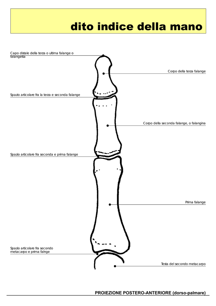 dito indice della mano Capo distale della terza o ultima falange o falangetta Corpo della terza falange Spazio articolare fra la terza e seconda falange Corpo della seconda falange, o falangina Spazio articolare fra seconda e prima falange Prima falange Spazio articolare fra secondo metacarpo e prima falnge Testa del secondo metacarpo PROIEZIONE POSTERO-ANTERIORE (dorso-palmare) dito indice della mano Profilo palmare della falangetta Bordo dorsale della seconda falange Profilo palmare della prima falange Prima falange del secondo dito Bordo dorsale della prima falange Articolazione metacarpo-falangea PROIEZIONE LATERO-LATERALE