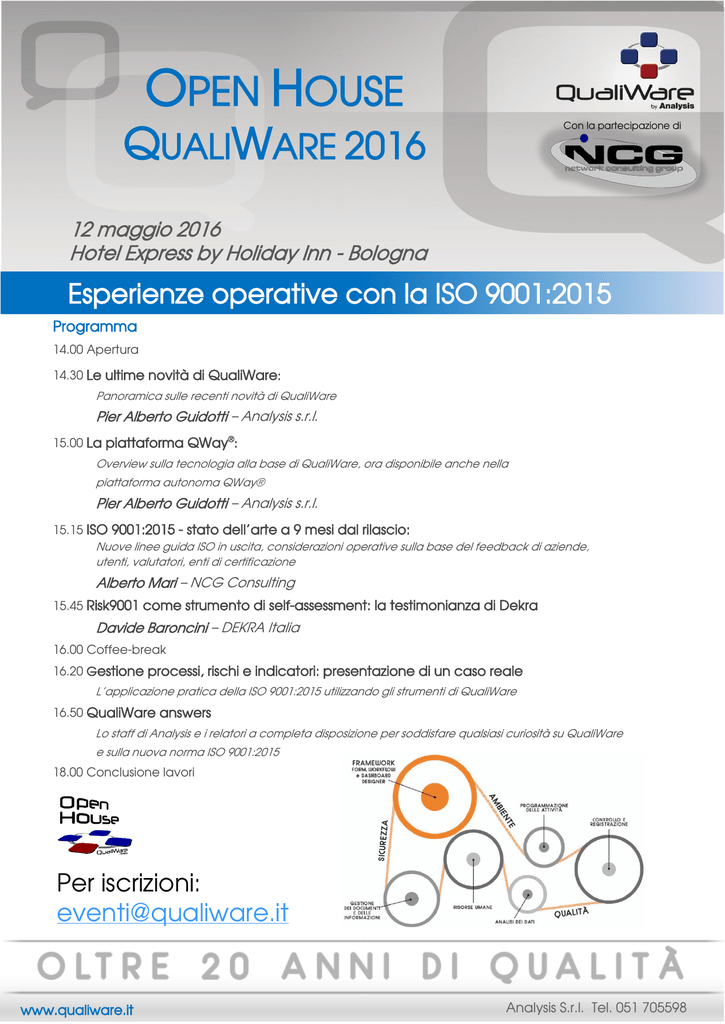 OPEN HOUSE Con la partecipazione di QUALIWARE 2016 12 maggio 2016 Hotel Express by Holiday Inn - Bologna Esperienze operative con la ISO 9001:2015 Programma 14.00 Apertura 14.30 Le ultime novità di QualiWare: Panoramica sulle recenti novità di QualiWare Pier Alberto Guidotti – Analysis s.r.l. 15.00 La piattaforma QWay®: Overview sulla tecnologia alla base di QualiWare, ora disponibile anche nella piattaforma autonoma QWay® Pier Alberto Guidotti – Analysis s.r.l. 15.15 ISO 9001:2015 - stato dell’arte a 9 mesi dal rilascio: Nuove linee guida ISO in uscita, considerazioni operative sulla base del feedback di aziende, utenti, valutatori, enti di certificazione Alberto Mari – NCG Consulting 15.45 Risk9001 come strumento di self-assessment: la testimonianza di Dekra Davide Baroncini – DEKRA Italia 16.00 Coffee-break 16.20 Gestione processi, rischi e indicatori: presentazione di un caso reale L’applicazione pratica della ISO 9001:2015 utilizzando gli strumenti di QualiWare 16.50 QualiWare answers Lo staff di Analysis e i relatori a completa disposizione per soddisfare qualsiasi curiosità su QualiWare e sulla nuova norma ISO 9001:2015 18.00 Conclusione lavori Per iscrizioni: [email protected] www.qualiware.it Analysis S.r.l. Tel. 051 705598