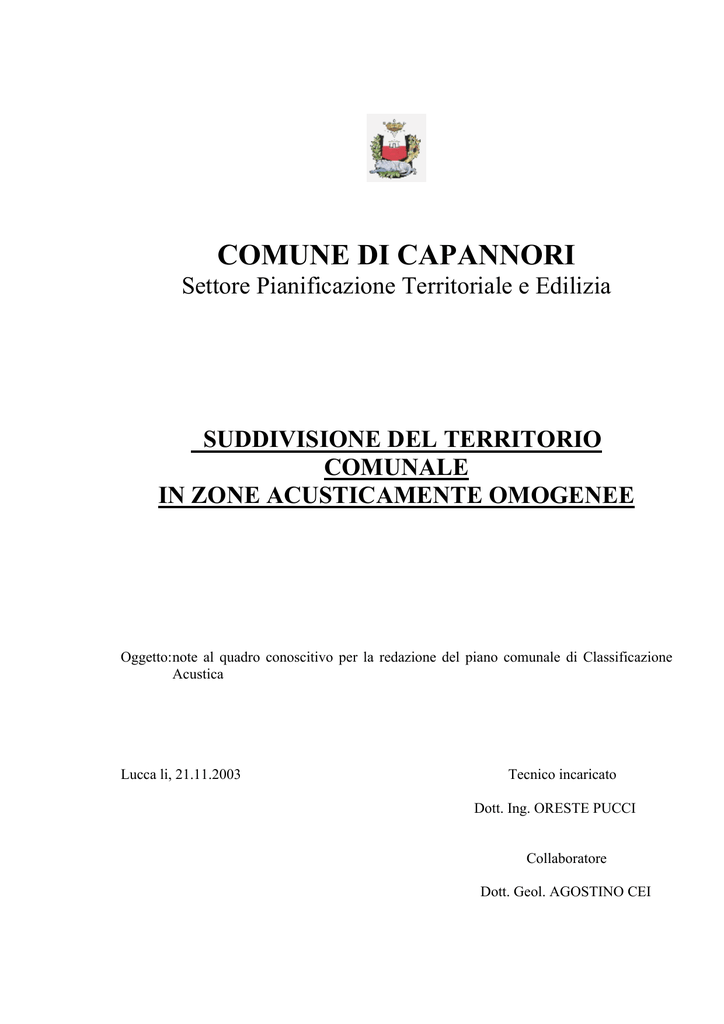COMUNE DI CAPANNORI Settore Pianificazione Territoriale e Edilizia SUDDIVISIONE DEL TERRITORIO COMUNALE IN ZONE ACUSTICAMENTE OMOGENEE Oggetto: note al quadro conoscitivo per la redazione del piano comunale di Classificazione Acustica Lucca li, 21.11.2003 Tecnico incaricato Dott. Ing. ORESTE PUCCI Collaboratore Dott. Geol. AGOSTINO CEI INDICE 1) Generalità........................................................................................................pag. 3 2) Illustrazione della mappa acustica della situazione attuale.............................pag. 4 3) Note sulla ipotesi di piano di Classificazione Acustica..................................pag. 5 4) Metodologia adottata.......................................................................................pag. 7 5) Strumenti utilizzati...........................................................................................pag. 8 Allegato 1 Disposizione prescrittive..................................................................................pag. 9 2 1) GENERALITÀ L’incarico affidato è stato suddiviso in due tempi. 1) Una prima fase in cui è stato eseguito uno studio acustico del territorio individuato dalle tavolette del rilievo aereofotogrammetrico in scala 1:5.000 di: S. CASSIANO DI MORIANO MARLIA LAMMARI RUGHI CAPANNORI PORCARI S. LEONARDO IN TREPONZIO Queste, associate al territorio individuato dalla tavoletta di SEGROMIGNO andavano a completare lo studio per la zona Centro Nord del Comune di Capannori più densamente abitata. 2) Una seconda fase in cui l’indagine è stata estesa su tutto il territorio comunale con l’incarico professionale per il completamento dello studio acustico. In totale sono stati eseguiti circa 400 rilievi fonometrici in punti individuati con l’ausilio della carta degli insediamenti produttivi, predisposta dal gruppo degli Architetti incaricati per la redazione del Piano Strutturale, e con i sopralluoghi. Dai rilievi è stato possibile redigere la mappa delle zone acusticamente omogenee in scala 1:10.000 individuate con le tavole M1, M2 ed M3 della “SITUAZIONE ATTUALE”. Questa mappa è stata realizzata tenendo conto, sia delle direttive della Regione Toscana che dei rilievi effettuati, e dei sopralluoghi avvenuti durante il lavoro di campionamento. Sulla base di quanto emerso nella fase di rilevamento verrà redatta un’ipotesi di zonizzazione dell’intero territorio comunale che completerà le tavole 1,2 e 3 già presentate al termine della prima fase. 3 2) ILLUSTRAZIONE DELLA MAPPA ACUSTICA DELLA SITUAZIONE ATTUALE Osservando la mappa è possibile individuare le seguenti situazioni: a) Classe VI, zona esclusivamente industriale, (70/70 dBA). Sono alcune aree occupate da industrie della produzione della carta (cartiere). Inoltre risultano comprese in classe VI anche aree in cui il rumore è di origine veicolare (Autostrada FI-MARE, Via Provinciale Romana in corrispondenza dell’incrocio con la variante di Porcari, strada statale Sarzanese-Valdera nel tratto compreso tra l’Autostrada e S. Andrea di Compito, Via Pesciatina nel tratto compreso tra Zone e Pescia, Via Provinciale di Sottomonte per tutto il tratto compreso entro il territorio comunale e il tratto iniziale della Via di Vorno). Queste aree sono circondate da zone di classe V (70/60 dBA) in cui si individuano anche nuclei residenziali; tale situazione genera certamente problemi perchè, nelle aree di classe V vale il criterio differenziale e male si concilia la presenza di fabbricati residenziali non attinenti alla produzione aziendale ( vedi la zona Nord – Ovest di Marlia ed alcune “isole” di classe VI ancora dislocate in questa frazione). b) Classe V (70/60dBA). Principalmente aree adiacenti alle vie principali di attraversamento, come la Via Pesciatina, il Viale Europa, il Brennero, Via Provinciale Romana, e le aree di rispetto confinanti con le zone di classe VI dell’Autostrada, della strada statale Sarzanese- Valdera, ecc. Anche lo stradone di Segromigno, con parte delle vie che si snodano nel centro calzaturiero, presentano aree ricadenti in questa classificazione. Sono aree in cui il rumore è generato principalmente dal traffico veicolare. c) Classe IV (65/55 dBA). È presente principalmente come fascia di rispetto della classe V e raramente come zona a se stante in cui si trovano sorgenti come attività industriali che la caratterizzano. Così per la Classe III (60/50 dBA). Tali zone sono tipiche delle aree intensamente abitate con presenza di attività artigianali e commerciali. In genere senza problematiche particolari anche se è sempre auspicabile, per le aree residenziali, limitare al massimo il rumore ambientale. d) Nelle aree studiate, si notano anche ampie zone di Classe II (55/45 dBA) che potrebbero anche racchiudere zone di Classe I (50/40 dBA). Abbiamo ritenuto però classificare come aree particolarmente protette, cioè di classe I, sia quelle che presentano una morfologia che ne garantisce la collocazione in tale classe (muri di cinta, barriere naturali, ecc.), sia quelle aree caratterizzate da una destinazione o da un uso in cui la quiete si può ritenere un elemento essenziale. 4 3) NOTE SULLA IPOTESI DI PIANO DI CLASSIFICAZIONE ACUSTICA Osservando la mappa è possibile individuare le seguenti situazioni: Classe VI, zona esclusivamente industriale, (70/70 dBA). Le aree inserite in questa classe sono: a) le attività estrattive localizzate nella zona Nord (Matraia) e nella zona Sud (Guamo). Queste presentano livelli di emissione sonora estremamente variabili in ragione delle fasi di lavorazione e dei macchinari utilizzati. b) Parte dell’area industriale del PIP di Carraia e la fascia coincidente con il tracciato dell’autostrada Fi-Mare La scelta è giustificata sia dal tipo di industrie che occupano l’area, sia dalla lontananza dai primi insediamenti residenziali e consente l’introduzione delle zone omogenee contigue di passaggio tra la classe VI e la classe IV Classe V (70/60