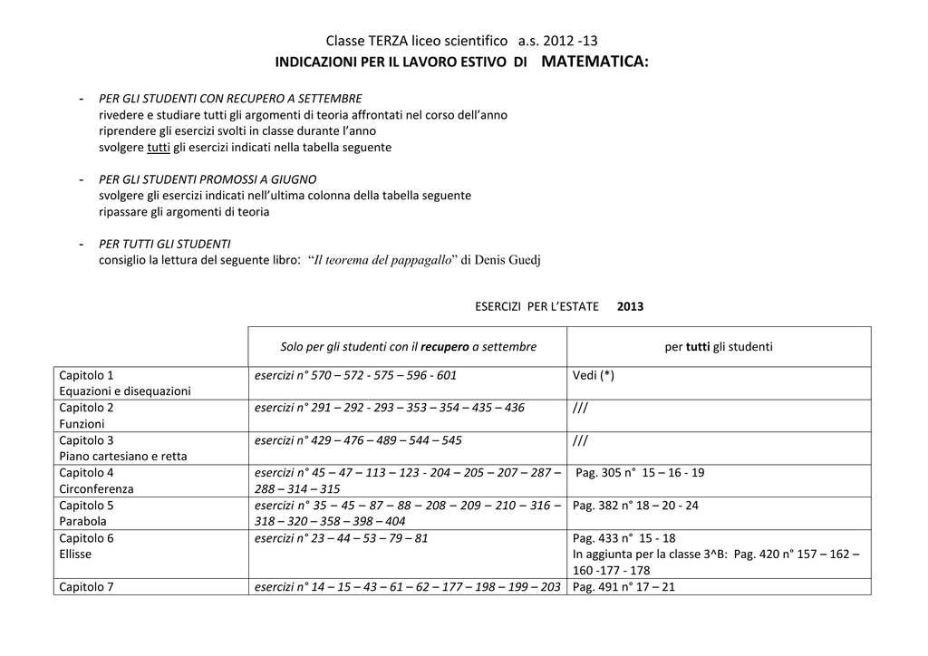 Classe TERZA liceo scientifico a.s. 2012 -13 INDICAZIONI PER IL LAVORO ESTIVO DI MATEMATICA: - PER GLI STUDENTI CON RECUPERO A SETTEMBRE rivedere e studiare tutti gli argomenti di teoria affrontati nel corso dell’anno riprendere gli esercizi svolti in classe durante l’anno svolgere tutti gli esercizi indicati nella tabella seguente - PER GLI STUDENTI PROMOSSI A GIUGNO svolgere gli esercizi indicati nell’ultima colonna della tabella seguente ripassare gli argomenti di teoria - PER TUTTI GLI STUDENTI consiglio la lettura del seguente libro: “Il teorema del pappagallo” di Denis Guedj ESERCIZI PER L’ESTATE Solo per gli studenti con il recupero a settembre Capitolo 1 Equazioni e disequazioni Capitolo 2 Funzioni Capitolo 3 Piano cartesiano e retta Capitolo 4 Circonferenza Capitolo 5 Parabola Capitolo 6 Ellisse Capitolo 7 2013 per tutti gli studenti esercizi n° 570 – 572 - 575 – 596 - 601 Vedi (*) esercizi n° 291 – 292 - 293 – 353 – 354 – 435 – 436 /// esercizi n° 429 – 476 – 489 – 544 – 545 /// esercizi n° 45 – 47 – 113 – 123 - 204 – 205 – 207 – 287 – Pag. 305 n° 15 – 16 - 19 288 – 314 – 315 esercizi n° 35 – 45 – 87 – 88 – 208 – 209 – 210 – 316 – Pag. 382 n° 18 – 20 - 24 318 – 320 – 358 – 398 – 404 esercizi n° 23 – 44 – 53 – 79 – 81 Pag. 433 n° 15 - 18 In aggiunta per la classe 3^B: Pag. 420 n° 157 – 162 – 160 -177 - 178 esercizi n° 14 – 15 – 43 – 61 – 62 – 177 – 198 – 199 – 203 Pag. 491 n° 17 – 21 Iperbole – 206 – 207 Capitolo 8 Coniche Capitolo 9 Esponenziali e logaritmi /// In aggiunta per la classe 3^B : pag. 474 n° 138 – 140 – 153 – 154 - 163 – 165 – 217 – 218 – 219 Pag. 493 n° 29 – 34 – 48 - 55 esercizi n° 115 – 119 – 133 – 150 – 154 216 – 222 – 237 – Pag. 588 n° 191 – 195 – 247 – 253 – 538 -565 – 669 287 – 299 – 311 – 495 – 497 – 503 - 555 679 -687 In aggiunta per le classi 3^A – C – D: pag.626 n. 890, 894, 898 (*) disequazioni irrazionali: 1) 2) 3) 4) Buone vacanze e arrivederci a settembre ! La vostra insegnante