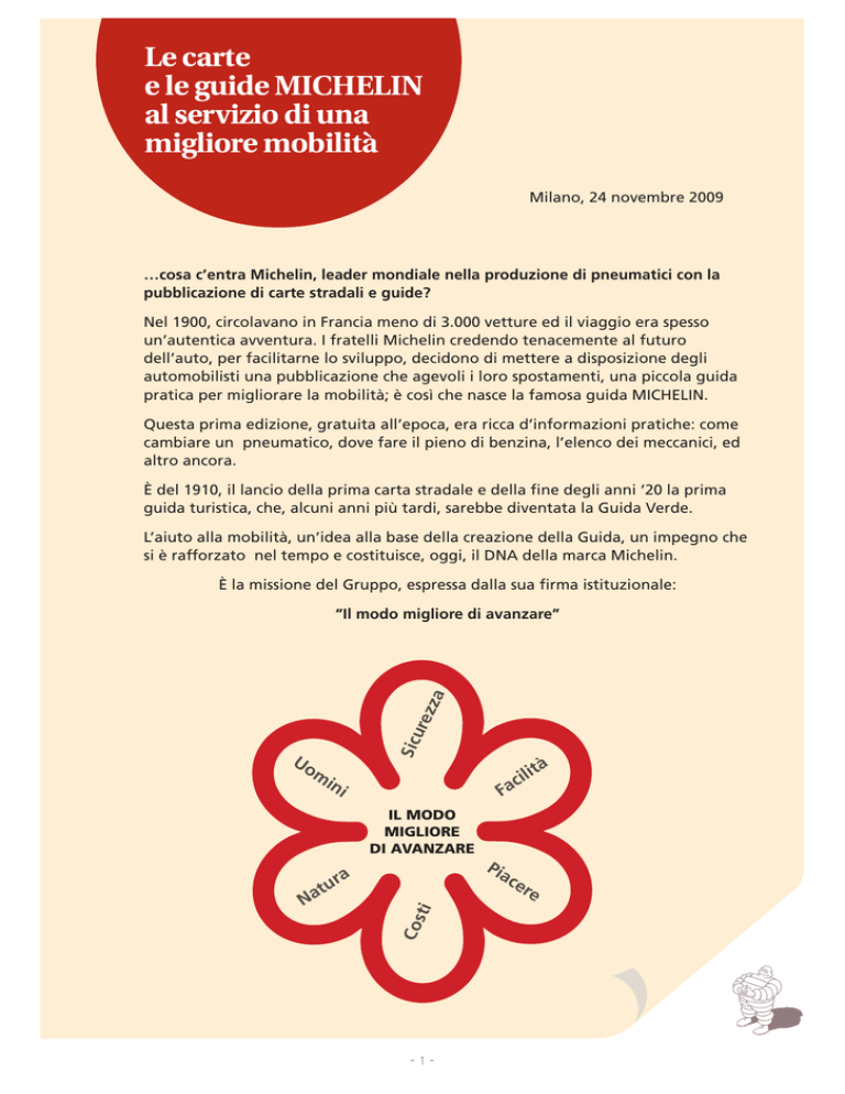 Le carte e le guide MICHELIN al servizio di una migliore mobilità Milano, 24 novembre 2009 …cosa c’entra Michelin, leader mondiale nella produzione di pneumatici con la pubblicazione di carte stradali e guide? Nel 1900, circolavano in Francia meno di 3.000 vetture ed il viaggio era spesso un’autentica avventura. I fratelli Michelin credendo tenacemente al futuro dell’auto, per facilitarne lo sviluppo, decidono di mettere a disposizione degli automobilisti una pubblicazione che agevoli i loro spostamenti, una piccola guida pratica per migliorare la mobilità; è così che nasce la famosa guida MICHELIN. Questa prima edizione, gratuita all’epoca, era ricca d’informazioni pratiche: come cambiare un pneumatico, dove fare il pieno di benzina, l’elenco dei meccanici, ed altro ancora. È del 1910, il lancio della prima carta stradale e della fine degli anni ‘20 la prima guida turistica, che, alcuni anni più tardi, sarebbe diventata la Guida Verde. L’aiuto alla mobilità, un’idea alla base della creazione della Guida, un impegno che si è rafforzato nel tempo e costituisce, oggi, il DNA della marca Michelin. È la missione del Gruppo, espressa dalla sua firma istituzionale: Uo Sic ure zz a “Il modo migliore di avanzare” m i F IL MODO MIGLIORE DI AVANZARE a ur Pia sti ce Co t Na ità il ac in -1- re La Guida MICHELIN festeggia l’edizione 2010 con un nuovo La Guida MICHELIN festeggia l’edizione 2010 con un nuovo In un anno difficile come quello trascorso, l’attenzione ai nuovi talenti nella ristorazione, è stata coronata anche dall’assegnazione di 7 nuove n e di 23 nuove m. Realtà e percorsi diversi, accomunati dalla passione di chef dotati di professionalità, gusto della ricerca tenacia e fantasia. Si conferma anche la valorizzazione della ristorazione d’albergo che si è lasciata definitivamente alle spalle la fama di Cenerentola della gastronomia. Per meglio qualificare la selezione la Guida ha ulteriormente ridotto il numero di esercizi che quest’anno sono 460 in meno, rispetto alla scorsa edizione. La Guida Michelin Italia 2010 è in vendita dal 26 novembre a 23 €. Comunicato e foto su: www.michelin.it 2004 186 20 4 2005 197 23 4 2006 198 23 5 2007 204 28 5 2008 217 29 5 2009 237 34 5 2010 229 37 6 -2- Variazioni stelle 2010 nuovo Brusaporto BG Da Vittorio stelle aggiunte (7) Alba CN Piazza Duomo Cervere CN Antica Corona Reale- da Renzo Ischia-Casamicciola Terme NA Il Mosaico (Terme Manzi Hotel) Licata AG La Madia Porto Ercole GR Il Pellicano Tirolo BZ Trenkerstube (H Castel) Venezia VE Met (H Metropole) stella aggiunta (24) Alghero SS Andreini Bedizzole BS Ortica Bergamo BG Roof Garden (H San Marco) Cattolica RN Vicolo Santa Lucia (H Carducci 76) Genova/Sestri Ponente GE Baldin Grumello del Monte BG Al Vigneto Merano BZ Sissi Merano/Freiberg BZ Castel Fragsburg Montescano PV Le Robinie Modena MO Hostaria del Mare Noli SV La Fornace di Barbablù (R. Palazzo Vescovile) Nusco AV La Locanda di Bu Pennabilli PU Il Piastrino Pescara PE Cafè les Paillotes Piove di Sacco PD Meridiana Ragusa RG La Fenice (H Villa Carlotta) Roma RM Glass Hostaria Roma RM Antonello Colonna Santa Vittoria d’Alba CN Savino Mongelli Seregno MI Osteria del Pomiroeu Vercelli VC Cinzia da Christian e Manuel Vico Equense NA L’Accanto ( GD H Angiolieri) Vico Equense NA Maxi (H Capo la Gala) Vipiteno BZ Kleine Flamme -3- Variazioni Stelle 2010 perde una Quistello MN Ambasciata stelle soppresse Abbiategrasso MI Antica Osteria del Ponte (prev. cambio gestione) San Vincenzo LI Gambero Rosso (chiuso) stella soppressa Barbaresco CN Al Vecchio Tre Stelle Barile PZ Locanda del Palazzo chiuso Bordighera IM La Via Romana chiuso Capolona AR Acquamatta chiuso Castelguelfo di Bologna BO Locanda Solarola Castellina in Chianti SI Gallopapa chiuso Cattolica RN Locanda Liuzzi Cavenago d’Adda LO L’Arsenale chiuso Cusago MI Da Orlando Genova GE La Bitta nella Pergola chiuso Labico RM Antonello Colonna trasferito a Roma Manerba del Garda BS L’Ortica trasferito a Bedizzole Modena MO Fini chiuso Montalcino SI Castello Banfi chiuso Montecchio di Crosara VR La Terrazza chiuso Monticello d’Alba CN Conti Roero chiuso Siena SI Il Canto (H. Certosa di Maggiano) Siena SI Antica Trattoria Botteganuova Tivoli RM Vesta chiuso Torino TO Locanda Mongreno in trasferimento Trento – Ravina TN Locanda Margon Vado Ligure SV La Fornace di Barbablù trasferito a Noli Varese VA 4 Mori chiuso Vendoies BZ Tillia chiuso Zagarolo RM Il Tordo Matto -4- Variazioni Stelle 2010 trasferimenti Labico RM Antonello Colonna trasferito a: Roma RM Antonello Colonna Manerba del Garda BS L’Ortica trasferito a: Bedizzole BS L’Ortica Vado Ligure SV La Fornace di Barbablù trasferito a: Noli SV La Fornace di Barbablù promesse Chiusa BZ Jasmin Oderzo TV Gellius Rivodutri RI La Trota Taormina ME Principe Cerami promesse Benevello CN Villa d’Amelia Bologna BO I Portici Firenze FI Onice Lounge e Rest. (Villa la Vedetta) Massa Lubrense NA Relais Blu Milano MI Nicola Cavallaro al San Cristoforo Roma RM Iolanda Vodo di Cadore BL Capriolo -5- I numeri della Guida MICHELIN Italia 2010 3.914 Alberghi 394 Agriturismo/B&B 35 6.306 Esercizi 238 nuovi ritenuti - 708 soppressi 2.076 località 2.392 Ristoranti l gran lusso e tradizione òòòòò 2 221 k gran comfort òòòò 38 1.023 j molto confortevole l 307 1.531 i di buon comfort òò 1.232 710 h abbastanza confortevole ò 813 394 I agriturismo, locande, B&B Alberghi e ristoranti ameni I…l - i...m Alberghi, agriturismo, locande, B&B - 561 Ristoranti - 157 Le stelle della guida Michelin Italia 2010 6 o 37 n 229 m I locali a buon prezzo | = * Menu entro i 22 euro 654 Bib Gourmand 234 Bib Hotel 82 -6- Qualche parola sulla Guida La collezione delle guide MICHELIN conta 26 guide che coprono 23 paesi, dagli Stati Uniti al Giappone ed alla Cina, passando per l’Europa. Novità della raccolta è la guida dedicata a Kyoto ed Osaka, lanciata ad ottobre e disponibile in Italia da gennaio 2010