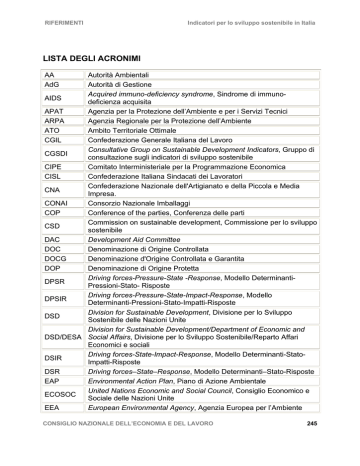 RIFERIMENTI Indicatori per lo sviluppo sostenibile in Italia LISTA DEGLI ACRONIMI AA AdG Autorità Ambientali Autorità di Gestione Acquired immuno-deficiency syndrome, Sindrome di immunoAIDS deficienza acquisita APAT Agenzia per la Protezione dell’Ambiente e per i Servizi Tecnici ARPA Agenzia Regionale per la Protezione dell’Ambiente ATO Ambito Territoriale Ottimale CGIL Confederazione Generale Italiana del Lavoro Consultative Group on Sustainable Development Indicators, Gruppo di CGSDI consultazione sugli indicatori di sviluppo sostenibile CIPE Comitato Interministeriale per la Programmazione Economica CISL Confederazione Italiana Sindacati dei Lavoratori Confederazione Nazionale dell'Artigianato e della Piccola e Media CNA Impresa. CONAI Consorzio Nazionale Imballaggi COP Conference of the parties, Conferenza delle parti Commission on sustainable development, Commissione per lo sviluppo CSD sostenibile DAC Development Aid Committee DOC Denominazione di Origine Controllata DOCG Denominazione d'Origine Controllata e Garantita DOP Denominazione di Origine Protetta Driving forces-Pressure-State -Response, Modello DeterminantiDPSR Pressioni-Stato- Risposte Driving forces-Pressure-State-Impact-Response, Modello DPSIR Determinanti-Pressioni-Stato-Impatti-Risposte Division for Sustainable Development, Divisione per lo Sviluppo DSD Sostenibile delle Nazioni Unite Division for Sustainable Development/Department of Economic and DSD/DESA Social Affairs, Divisione per lo Sviluppo Sostenibile/Reparto Affari Economici e sociali Driving forces-State-Impact-Response, Modello Determinanti-StatoDSIR Impatti-Risposte DSR Driving forces–State–Response, Modello Determinanti–Stato-Risposte EAP Environmental Action Plan, Piano di Azione Ambientale United Nations Economic and Social Council, Consiglio Economico e ECOSOC Sociale delle Nazioni Unite EEA European Environmental Agency, Agenzia Europea per l’Ambiente CONSIGLIO NAZIONALE DELL’ECONOMIA E DEL LAVORO 245 RIFERIMENTI ENEA EMAS EPI EPO ESI EU Eurostat EU SDI EU SDS FfD FIL GDP GEO-3 GHG GNP GPI GWP HDI ICRAM ICSs ICT IGP IGT IISD IMF INAIL INPS IPP IPPC ISEW ISFORT Indicatori per lo sviluppo sostenibile in Italia Ente per le Nuove tecnologie, l’Energia e l’Ambiente Eco-Management and Audit Scheme, Schema di audit e gestione Ambientale Environmental Pressure Indicators, Indicatori di pressione ambientale European Patent Office, Ufficio europeo Brevetti Environmental Sustinability Index, Indice di sostenibilità ambientale European Union, Unione Europea Agenzia statistica dell’Unione Europea European Union Sustainable Development Indicators, Indicatori di sviluppo sostenibile dell’Unione Europea European Union Sustainable Development Strategy, Strategia di sviluppo sostenibile dell’Unione Europea Conference on Financing for Development, Conferenza sul finanziamento per lo sviluppo Felicità Interna Lorda Gross Domestic Product, Prodotto Interno Lordo Global Envornment Outlook, Stato dell’ambiente globale-terzo aggiornamento Greenhouse gas, Gas ad effetto serra Gross National Product , Prodotto Nazionale Lordo Genuine Progress Indicator, Indicatore di progresso genuino Global Warming Potential, Potenziale di riscaldamento globale Human Development Index, Indice di sviluppo umano Istituto Centrale per la Ricerca scientifica e tecnologica Applicata al Mare Indice CNEL per lo Sviluppo sostenibile Information & Communication Technologies, Tecnologie di Comunicazione e Informazione Indicazione Geografica Protetta Indicazione Geografica Tipica International Institute for Sustainable Development, Istituto Internazionale per lo Sviluppo Sostenibile International Monetary Fund, Fondo Monetario Internazionale Istituto Nazionale per l’Assicurazione contro gli Infortuni sul Lavoro Istituto Nazionale della Previdenza Sociale Integrated Product Policy, Politica Integrata di Prodotto International Panel on Climate Change, Accordo internazionale sul cambiamento climatico Index of Sustainable Economic Welfare, Indice di benessere economico sostenibile Istituto Superiore di Formazione e Ricerca per i Trasporti CONSIGLIO NAZIONALE DELL’ECONOMIA E DEL LAVORO 246 RIFERIMENTI ISO ISSI ISTAT IUCN LDC LIPU MATT MDG MEF MEA MIPS MIT Mtep MWe NOE OECD ODA OGM ONG ONR ONU PAC PGT PIL PPP PSR PVS PTV REACH RD R&D RIBES RIVM SCOPE SD Indicatori per lo sviluppo sostenibile in Italia International Organization for Standardization, Organizzazione internazionale per la standardizzazione Istituto Sviluppo Sostenibile Italia Istituto Nazionale di Statistica International Union for Conservation of Nature and Natural Resources, Unione Internazionale per la conservazione della Natura Least Developed Country, Paesi a minor livello di sviluppo Lega Italiana Protezione Uccelli Ministero dell’Ambiente e della Tutela del Territorio Millennium Development Goals, Obiettivi di Sviluppo del Millennio Ministero dell' Economia e delle Finanze Multilateral Environmental Agreements, Accordi Ambientali Multilaterali Material Input per Unit of Service, Input di materia per unità di servizio Massachussets Institute of Technology Milioni di tonnellate equivalenti di petrolio Megawatt elettrici Nucleo Operativo Ecologico dei Carabinieri Organisation for Economic Co-operation and Development, Organizzazione per la cooperazione e lo sviluppo economico Official Development Assistance, Aiuti ufficiali allo sviluppo Organismi Geneticamente Modificati Organizzazioni non Governative Osservatorio Nazionale sui Rifiuti Organizzazione delle Nazioni Unite Politica Agricola Comune Piano Generale dei Trasporti Prodotto Interno Lordo Purchising Power Parity, Parità di potere d’acquisto Pressure-State -Response, Modello Pressioni-Stato-Risposte Paesi in Via di Sviluppo Policy Target Values, Valori connessi ad obiettivi politici Registration, Evaluation and Authorisation of Chemicals, Registrazione, valutazione e autorizzazione dei prodotti chimici Raccolta Differnziata Research and Developm
