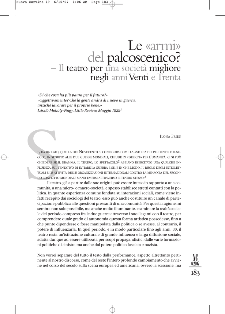 Nuova Corvina 19 6/15/07 1:06 AM Page 183 Le «armi» del palcoscenico? – Il teatro per una società migliore negli anniVenti e Trenta «Di che cosa ha più paura per il futuro?» «Oggettivamente? Che la gente andrà di nuovo in guerra, anziché lavorare per il proprio bene.» László Moholy-Nagy, Little Review, Maggio 19291 S ILONA FRIED E, DA UN LATO, QUELLA DEL NOVECENTO SI CONFIGURA COME LA «STORIA DEI PERDENTI» E IL SECOLO, IN SEGUITO ALLE DUE GUERRE MONDIALI, CHIUDE IN «DEFICIT» PER L’UMANITÀ, CI SI PUÒ CHIEDERE SE IL DRAMMA, IL TEATRO, LO SPETTACOLO2 ABBIANO ESERCITATO UNA QUALCHE INFLUENZA SUL TENTATIVO DI EVITARE LA GUERRA E SE, E IN CHE MODO, IL RUOLO DEGLI INTELLETTUALI E LE ATTIVITÀ DELLE ORGANIZZAZIONI INTERNAZIONALI CONTRO LA MINACCIA DEL SECONDO CONFLITTO MONDIALE SIANO EMERSI ATTRAVERSO IL TEATRO STESSO.3 Il teatro, già a partire dalle sue origini, può essere inteso in rapporto a una comunità, a una micro- o macro-società, e spesso stabilisce stretti contatti con la politica. In quanto esperienza comune fondata su interazioni sociali, come viene infatti recepito dai sociologi del teatro, esso può anche costituire un canale di partecipazione pubblica alle questioni pressanti di una comunità. Per questa ragione mi sembra non solo possibile, ma anche molto illuminante, esaminare la realtà sociale del periodo compreso fra le due guerre attraverso i suoi legami con il teatro, per comprendere quale grado di autonomia questa forma artistica possedesse, fino a che punto dipendesse o fosse manipolata dalla politica o se avesse, al contrario, il potere di influenzarla. In quel periodo, e in modo particolare fino agli anni ’30, il teatro resta un’istituzione culturale di grande influenza e larga diffusione sociale, adatta dunque ad essere utilizzata per scopi propagandistici dalle varie formazioni politiche di sinistra ma anche dal potere politico fascista e nazista. Non vorrei separare del tutto il testo dalla performance, aspetto altrettanto pertinente al nostro discorso, come del resto l’intero profondo cambiamento che avviene nel corso del secolo sulla scena europea ed americana, ovvero la scissione, ma NC 6.2007 183 Nuova Corvina 19 6/15/07 1:06 AM Page 184 [ILONA FRIED] NC 6.2007 184 anche l’amalgamazione, tra testualità e performatività.4 Per collegare i due discorsi ci serviamo in modo particolare della Mitteleuropa del cabaret,5 che presenta anche particolari risvolti politici, legami con i problemi quotidiani della gente e del pubblico. Non si tratta solamente di una forma di divertimento popolare, ma rimane una «istituzione» fra i divertimenti di larga diffusione, una possibilità di sfogo, e lo specchio di una Weltanschaung dei diversi strati della società, con una forte influenza artistica sullo stesso spettacolo teatrale, in quanto alcuni fra i maggiori autori e registi dell’epoca frequentano o addirittura si mettono alla prova nel cabaret (dal regista Reinhardt, all’autore Wedekind, dalle avanguardie al giovane Brecht: non a caso i più recenti studi sulla performance puntano molto sul cabaret o sulle sue varianti: forme di varietà o di avanspettacolo). «Emerging from bohemian haungts, the cabaret was the earliest forum for experiments in shadowgraphy, puppetry, freeform skits, jazz rhythms, literary parody, ‘naturalistic’ songs, ‘bruitistic’ litanies, agitprop, dance-pantomime, and political satire», afferma Marvin Carlson.6 Il caratteristico senso dell’umorismo del cabaret si basa spesso su soluzioni linguistiche ed intellettuali di alto livello, con una spiccata ironia liberatoria, atta a rafforzare l’identità di un gruppo, l’appartenenza ad una specifica realtà sociale, mentre il performer, che può essere anche lo stesso autore, deve anche mettere in mostra la sua bravura attoriale, per intrattenere il pubblico.7 Il cabaret, con l’attenzione ai conflitti, alle imperfezioni, alle distorsioni quotidiane, a volte addirittura con l’impegno politico, ha anche a che fare con il gruppo emergente degli ebrei, con l’emancipazione da loro raggiunta dall’800 in avanti, con i loro contatti con le tradizioni e il loro successivo contributo alla vita intellettuale, letteraria e culturale. Promotori di una fiorente cultura mitteleuropea complessa e composita, portatrice della modernità, gli intellettuali sono spesso di idee liberali o di sinistra e contrari alla guerra. La satira e il riso sono rimaste le armi che impiegarono in Germania, anche dopo l’ascesa di Hitler al potere, contro la dittatura, contro le persecuzioni razziali e contro la brutalità del mondo esterno. Il disprezzo era reciproco, tanto è vero che il nazismo non tollerava il cabaret. Alcuni dei suoi rappresentanti furono in seguito deportati nei campi di concentramento, alcuni in quanto ebrei, altri proprio in seguito ai loro componimenti antinazisti; altri ancora furono costretti ad emigrare. Come ha dimostrato Senelick, gli spettacoli di cabaret non solo continuarono anche durante il nazismo, ma se ne è conservata la memoria addirittura nei campi di concentramento, anche se, purtroppo, non riuscirono a salvare i loro performers dalla morte.8 Il pacifismo si integrava alla lotta contro l’intolleranza e contro l’antisemitismo. L’umorista Friedrich Hollaender, per fare un esempio, era noto anche per i testi scritti per canzoni (comprese quelle di Marlene Dietrich). Una delle sue canzoni sull’antisemitismo ha origine da una barzelletta degli anni venti: «È tutta colpa degli ebrei e dei ciclisti.» «Perché dei ciclisti?» «E perché degli ebrei?» La canzone si intitolava: Am Allem sind die Juden schuld (1931), È tutta colpa degli ebrei.9 Invece di comporre gli sketches, le scenette brevi tipiche del cabaret, un grande performer, Karl Kraus, di idee liberali e pacifiste, scrisse un dramma lunghissimo di 200 scene, dei generi più diversi, sulla Grande Guerra, contro la guerra, sul Nuova Corvina 19 6/15/07 1:06 AM Page 185 [LE «AR