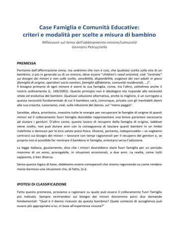 Case Famiglia e Comunità Educative: criteri e modalità per scelte a misura di bambino Riflessioni sul tema dell'abbinamento minore/comunità Gennaro Petruzziello PREMESSA Partiamo dall’affermazione ovvia, ma vedremo che non è così, che qualsiasi scelta sulla vita di un bambino, o più in generale su di un minore, deve essere “children’s need oriented, cioè “centrate” sui bisogni dei minori e non sulle scelte, sensibilità, disponibilità, esigenze dei vari adulti in gioco (famiglia di origine, operatori socio-sanitari, famiglie affidatarie, comunità residenziali, …)”. Il bisogno primario di ogni minore è avere la sua famiglia, come, tra l’altro, sottolinea anche il nostro ordinamento (L. 149/2001). Questo principio non è ideologico ma risponde alla necessità vitale ed evolutiva dei bambini. Qualsiasi soluzione alternativa, anche la migliore, è un surrogato a questa necessità fondamentale di cui il bambino sarà, comunque, privato con gli inevitabili danni alla sua crescita. Lavoriamo, cioè, sulla riduzione del danno, sul “meno peggio”. Sarebbe, allora, prioritario, investire tutte le energie per recuperare le famiglie di origine di questi minori ed il collocamento fuori famiglia dovrebbe rappresentare una breve parentesi necessaria ad aiutare i genitori. D’altro canto, questo lavoro di recupero della famiglia di origine, laddove viene svolto, non può durare anni con la conseguenza di lasciare questi bambini in un limbo indefinito e dannoso per la loro salute psico-fisica. Diviene, pertanto, indispensabile – se vogliamo centrarci sui bisogni dei minori – lavorare con tempi ragionevoli per il recupero del genitori e, se proprio non è possibile far rientrare il bambino in famiglia, orientarsi verso l’adozione. La legge italiana, giustamente, dice che i minori dovrebbero stare fuori famiglia per un periodo massimo di un anno, prorogabile, in situazioni eccezionali, a due anni. La realtà, come tutti sappiamo, è ben diversa. Senza questa logica di base, dobbiamo essere consapevoli che stiamo ragionando su come rendere meno dannosa una situazione che, di fatto, lo è. IPOTESI DI CLASSIFICAZIONE Fatta questa premessa, proviamo a ragionare su quale può essere il collocamento fuori famiglia più indicato. Sempre centrandoci sui bisogni dei minori dovremmo porci due domande fondamentali: “Qual è il danno ricevuto da questo bambino? Quale contesto di accoglienza può essere più appropriato a lui, in base all’esperienza vissuta?” Prima di fare questo, è opportuno, fare un’altra precisazione. Scrive Dante Ghezzi : “L’intervento di collocazione del minore in una struttura tutelare non ha come caratteristica basilare l’intento educativo […]: di importanza primaria è l’analisi delle ragioni della sua espulsione dal nucleo originario, e insieme la ricerca delle possibilità di un loro superamento. La collocazione di un minore in una struttura tutelare si pone quindi in un’ottica clinica per lui e per la sua famiglia. […] Pertanto la protezione del minore, prima che per la dimensione educativa, si qualifica per la dimensione di aiuto, di ascolto, di riparazione. Privilegiare a priori il taglio educativo significa decidere implicitamente che la famiglia non è più una risorsa per il minore”. Dovremmo, quindi, pensare ad una doppia classificazione: secondo le esigenze dell’utenza (bisogno del minore) e secondo il criterio di organizzazione interna della struttura che accoglie. Secondo il principio enunciato all’inizio, e teoricamente condiviso da tutti, dovremmo partire dai bisogni del minore che viene collocato in una struttura. Colpisce – ma non è un caso – che tutte le classificazioni reperibili riguardano le strutture e non i bisogni dei bambini. La più recente statistica del Ministero che fa riferimento alle cause di allontanamento risale al 2010. Si legge che “il 37% dei bambini è stato allontanato per inadeguatezza genitoriale, il 9% per problemi di dipendenza di uno o entrambi i genitori, l'8% per problemi di relazioni nella famiglia, il 7% per maltrattamenti e incuria e il 6%, infine, per problemi sanitari di uno o entrambi i genitori”. Come si vede il riferimento è alle problematiche dei genitori e non hai danni subiti dal bambino. Inoltre, parlare di “inadeguatezza genitoriale” è generico e non ci aiuta a capire cosa è successo al minore. Una precedente statistica, che risale al 2003, riporta come prevalente motivo di inserimento di un minore in struttura: nel 33% dei casi motivi economici della famiglia, nel 12% problemi di condotta dei genitori, nel 8,5% crisi delle relazioni familiari, nel 5,1% maltrattamenti o incuria, nel 4,7% problemi lavorativi dei genitori, nel 4,5% problemi giudiziari dei genitori, ecc. E’ ancora più evidente in questo caso il riferimento esclusivamente alle problematiche familiari. Permane, cioè, un’ottica adultocentrica che tende sempre a mettere in primo piano i problemi o i bisogni degli adulti e si dimentica sempre dei minori. D’altro canto, l’Italia è un paese dove tutti parlano dei diritti dei minori e di quello che è meglio per loro ma, spesso, ci si dimentica di ascoltare le loro esigenze. I MINORI ALLONTANATI Chi lavora con i minori sa bene che, specie negli ultimi anni, c’è una forte resistenza ad allontanare i minori dalla propria famiglia ed inserirli in struttura. I motivi di queste resistenze non sono certo legati all’attenzione per i bisogni dei bambini ma vanno ricercati nelle difficoltà economiche dei Comuni. Conseguenza di questa resistenza all’allontanamento è che i collocamenti nelle strutture riguardano sempre più minori con esperienze drammatiche alle spalle. Inoltre, la tendenza a posticipare gli allontanamenti ha come conseguenza che la maggior parte dei bambini arrivano in struttura quando hanno già subito danni significativi. I criteri che dovrebbero far decidere per un allontanamento sono: 1. che il minore sia il danneggiato; 2