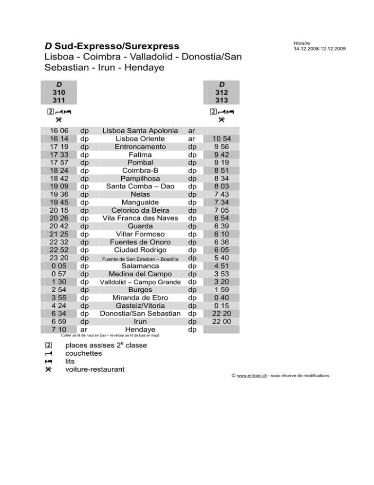 D Sud-Expresso/Surexpress Lisboa - Coimbra - Valladolid - Donostia/San Sebastian - Irun - Hendaye D 310 311 D 312 313 lzx q lzx q 16 06 16 14 17 19 17 33 17 57 18 24 18 42 19 09 19 36 19 45 20 15 20 26 20 42 21 25 22 32 22 52 23 20 0 05 0 57 1 30 2 54 3 55 4 24 6 34 6 59 7 10 dp dp dp dp dp dp dp dp dp dp dp dp dp dp dp dp dp dp dp dp dp dp dp dp dp ar Lisboa Santa Apolonia Lisboa Oriente Entroncamento Fatima Pombal Coimbra-B Pampilhosa Santa Comba – Dao Nelas Mangualde Celorico da Beira Vila Franca das Naves Guarda Villar Formoso Fuentes de Onoro Ciudad Rodrigo ar ar dp dp dp dp dp dp dp dp dp dp dp dp dp dp dp Fuente de San Esteban – Boadilla Salamanca dp Medina del Campo dp Valldolid – Campo Grande dp Burgos dp Miranda de Ebro dp Gasteiz/Vitoria dp Donostia/San Sebastian dp Irun dp Hendaye dp Horaire 14.12.2008-12.12.2009 10 54 9 56 9 42 9 19 8 51 8 34 8 03 7 43 7 34 7 05 6 54 6 39 6 10 6 36 6 05 5 40 4 51 3 53 3 20 1 59 0 40 0 15 22 20 22 00 L'aller se lit de haut en bas – le retour se lit de bas en haut l z x q places assises 2e classe couchettes lits voiture-restaurant T www.entrain.ch - sous réserve de modifications