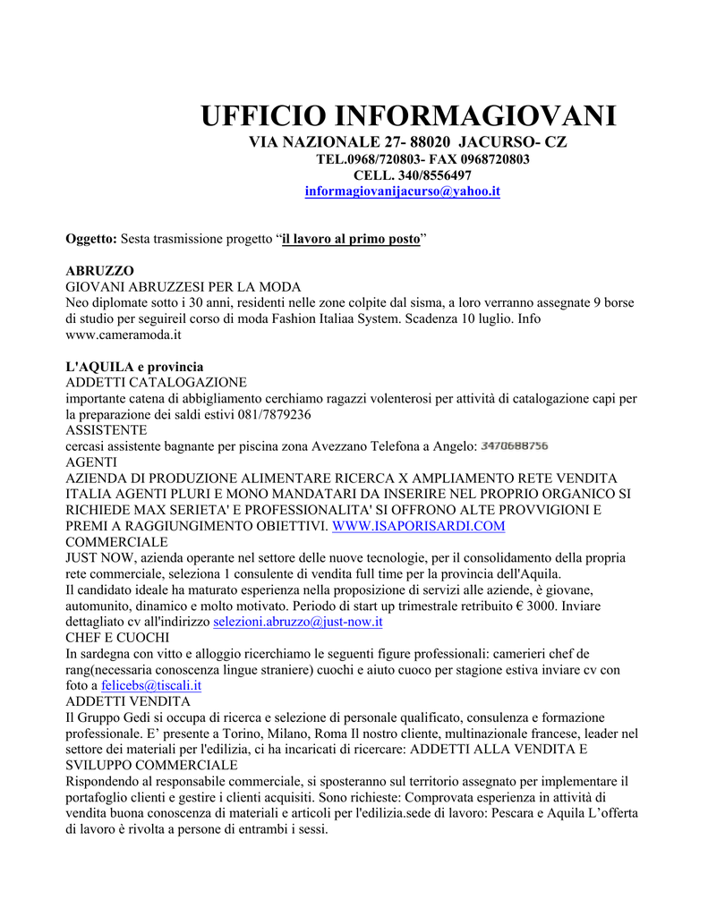 UFFICIO INFORMAGIOVANI VIA NAZIONALE 27- 88020 JACURSO- CZ TEL.0968/720803- FAX 0968720803 CELL. 340/8556497 [email protected] Oggetto: Sesta trasmissione progetto “il lavoro al primo posto” ABRUZZO GIOVANI ABRUZZESI PER LA MODA Neo diplomate sotto i 30 anni, residenti nelle zone colpite dal sisma, a loro verranno assegnate 9 borse di studio per seguireil corso di moda Fashion Italiaa System. Scadenza 10 luglio. Info www.cameramoda.it L'AQUILA e provincia ADDETTI CATALOGAZIONE importante catena di abbigliamento cerchiamo ragazzi volenterosi per attività di catalogazione capi per la preparazione dei saldi estivi 081/7879236 ASSISTENTE cercasi assistente bagnante per piscina zona Avezzano Telefona a Angelo: AGENTI AZIENDA DI PRODUZIONE ALIMENTARE RICERCA X AMPLIAMENTO RETE VENDITA ITALIA AGENTI PLURI E MONO MANDATARI DA INSERIRE NEL PROPRIO ORGANICO SI RICHIEDE MAX SERIETA' E PROFESSIONALITA' SI OFFRONO ALTE PROVVIGIONI E PREMI A RAGGIUNGIMENTO OBIETTIVI. WWW.ISAPORISARDI.COM COMMERCIALE JUST NOW, azienda operante nel settore delle nuove tecnologie, per il consolidamento della propria rete commerciale, seleziona 1 consulente di vendita full time per la provincia dell'Aquila. Il candidato ideale ha maturato esperienza nella proposizione di servizi alle aziende, è giovane, automunito, dinamico e molto motivato. Periodo di start up trimestrale retribuito € 3000. Inviare dettagliato cv all'indirizzo [email protected] CHEF E CUOCHI In sardegna con vitto e alloggio ricerchiamo le seguenti figure professionali: camerieri chef de rang(necessaria conoscenza lingue straniere) cuochi e aiuto cuoco per stagione estiva inviare cv con foto a [email protected] ADDETTI VENDITA Il Gruppo Gedi si occupa di ricerca e selezione di personale qualificato, consulenza e formazione professionale. E’ presente a Torino, Milano, Roma Il nostro cliente, multinazionale francese, leader nel settore dei materiali per l'edilizia, ci ha incaricati di ricercare: ADDETTI ALLA VENDITA E SVILUPPO COMMERCIALE Rispondendo al responsabile commerciale, si sposteranno sul territorio assegnato per implementare il portafoglio clienti e gestire i clienti acquisiti. Sono richieste: Comprovata esperienza in attività di vendita buona conoscenza di materiali e articoli per l'edilizia.sede di lavoro: Pescara e Aquila L’offerta di lavoro è rivolta a persone di entrambi i sessi. Se interessati inviare il proprio curriculum vitae, come formato word, a: [email protected] indicando MEDICI Adecco medical & science ricerca Medici generici. Le persone selezionate dovranno gestire la medicheria di una colonia estiva presso resort turistici. Disponibilità richiesta: 15 giorni dal 10 al 24 luglio 2010 Località: Lucoli (L'Aquila) E' previsto un contratto di collaborazione occasionale. Retribuzione offerta:1000€ lordi + vitto,alloggio e trasferimento da e per la località prescelta. Si valutano candidature anche alla prima esperienza lavorativa. I/le candidati/e interessati possono inoltrare la propria candidatura completa di curriculum vitae all'indirizzo email: [email protected] ADDETTI VENDITE TEMPORARY SPA AGENZIA PER IL LAVORO DI FROSINONE RICERCA PER AZIENDA CLIENTE ADDETTI ALLE VENDITE CON ESPERIENZA DI ALMENO 1 ANNO IN SUPERMERCATI, IPERMERCATI, DISCOUNT. ETA' MASSIMA 35ANNI. Telefona a Temporary s.p.a. agenzia per il lavoro: PERSONALE La Elios Club Vacanze società di gestione Alberghiera ricerca personale per prossima stagione Estiva. Possibilità di assunzione immediata. Personale ricercato ( Camerieri, Cuochi capo parita, commis di cucina, segretarie di ricevimento, manutentori, Cameriere ai piani ) si ricerca inoltre Equipe di animazione ( Responsabile animazione, animatori di contatto, addetta Miniclub, Balli di gruppo ) Telefona a Elios Club Vacanze: ADDETTI CATALOGAZIONE Per azienda cliente operante nel settore dell'abbigliamento cerchiamo giovani volenterosi per attività di catalogazione capi per la preparazione dei saldi estivi. Si richiede disponibilità a brevi contratti max 1 settimana, esperienza anche minima maturata in punti vendita, voglia di lavorare. Si offre: contratto a tempo determinato retribuito da ccnl commercio. Inviare curriculum dettagliato. info www.tiscali.it MURATORI 4 MURATORI SPECIALIZZATI EQUISITI RICHIESTI: ESPERIENZA PREGRESSA;- POSSESSO AUTO PROPRIA DISPONIBILITA' IMMEDIATA Telefona a obiettivo lavoro spa: AMBOSESSI MEDICAL CENTER SERVICE seleziona ambosessi come figure commerciali addetti alla vendita di servizi medico-sanitari. No perditempo. Inviare cv a: [email protected]. Si prega di indicare sul cv "richiesta colloqui per Avezzano". PERSONALE Telefona a selector impianti: BADANTE cercasi badante per signora non autosufficiente offresi vitto alloggio e fisso mensile-no perditempo- tel. 3470778033 COMMESSE URGENTE NUOVO OUTLET SULMONA ricerchiamo 9 COMMESSE con esperienza non inferiore ad 1 anno. Si richiede età massima 45 anni, esperienza nel campo dell'abbigliamento. Per candidarsi inviare CV alla Direzione con foto al seguente indirizzo di posta elettronica: [email protected] oppure un fax al seguente n. 0864 / 55815 (10h alle 22h) CHIETI e provincia DIRETTORE COMMERCIALE Ricerchiamo per importante azienda del settore metalmeccanico un DIRETTORE COMMERCIALE.Il candidato ideale ha maturato una consolidata esperienza nella mansione analoga, deve essere in grado di gestire e coordinare l'uuficio commerciale in tutti gli aspetti. Deve essere dotato di ottime capacità relazionali e di problem solving e deve essere responsabile e preciso.Si offre contratto in base alle esperienze maturate.Zona di lavoro VASTO (CH) 085/4217951 ADDETTO SICUREZZA AZIENDA DELLA PROVINCIA DI CHIETI CERCA UN ADDETTO ALLA SICUREZZA E PREVENZIONE SUI LUOGHI DI LAVORO.IL CANDIDATO DOVRA' COORDINARE LE ATTIVITA' DI SICUREZZA ALL'INTERNO DELL'AZIENDA PREOCCUPANDOSI DEL MANTENIMENTO DEI LIVELLI DI SICUREZZA STABILITI DALLA NORMATIVA. DOVRA' INOLTRE OCCUPARSI DELL'ORGANIZZAZIONE DI CORSI DI INFORMAZIONE E FORMAZIONE