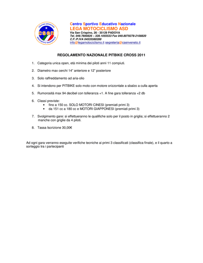 Centro Sportivo Educativo Nazionale LEGA MOTOCICLISMO ASD Via San Crispino, 26 - 35129 PADOVA Tel. 049.7800826 – 328.1055533 Fax 049.8079278-2108820 C.F./P.IVA 04535580288 [email protected] [email protected] REGOLAMENTO NAZIONALE PITBIKE CROSS 2011 1. Categoria unica open, età minima dei piloti anni 11 compiuti. 2. Diametro max cerchi 14” anteriore e 12” posteriore 3. Solo raffreddamento ad aria-olio 4. Si intendono per PITBIKE solo moto con motore orizzontale a sbalzo a culla aperta 5. Rumorosità max 94 decibel con tolleranza +1. A fine gara tolleranza +2 db 6. Classi previste: • fino a 150 cc. SOLO MOTORI CINESI (premiati primi 3) • da 151 cc a 180 cc e MOTORI GIAPPONESI (premiati primi 3) 7. Svolgimento gare: si effettueranno le qualifiche solo per il posto in griglia; si effettueranno 2 manche con griglie da 4 piloti. 8. Tassa Iscrizione 30,00€ Ad ogni gara verranno eseguite verifiche tecniche ai primi 3 classificati (classifica finale), e il quarto a sorteggio tra i partecipanti