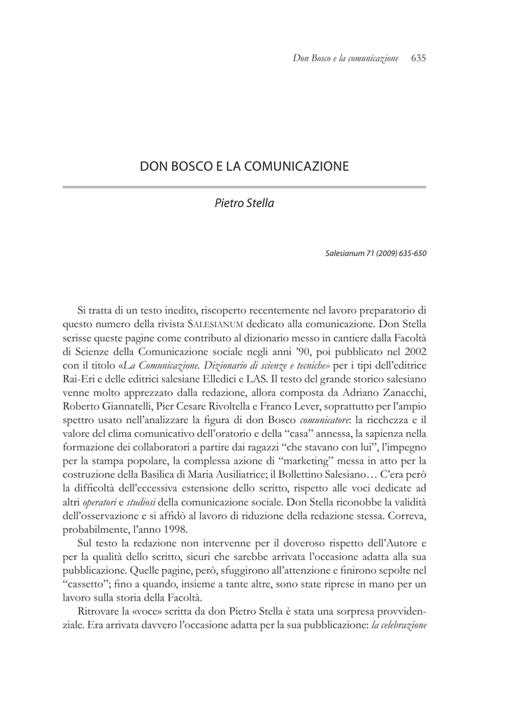 Don Bosco e la comunicazione 635 DON BOSCO E LA COMUNICAZIONE Pietro Stella Salesianum 71 (2009) 635-650 Si tratta di un testo inedito, riscoperto recentemente nel lavoro preparatorio di questo numero della rivista Salesianum dedicato alla comunicazione. Don Stella scrisse queste pagine come contributo al dizionario messo in cantiere dalla Facoltà di Scienze della Comunicazione sociale negli anni ’90, poi pubblicato nel 2002 con il titolo «La Comunicazione. Dizionario di scienze e tecniche» per i tipi dell’editrice Rai-Eri e delle editrici salesiane Elledici e LAS. Il testo del grande storico salesiano venne molto apprezzato dalla redazione, allora composta da Adriano Zanacchi, Roberto Giannatelli, Pier Cesare Rivoltella e Franco Lever, soprattutto per l’ampio spettro usato nell’analizzare la figura di don Bosco comunicatore: la ricchezza e il valore del clima comunicativo dell’oratorio e della “casa” annessa, la sapienza nella formazione dei collaboratori a partire dai ragazzi “che stavano con lui”, l’impegno per la stampa popolare, la complessa azione di “marketing” messa in atto per la costruzione della Basilica di Maria Ausiliatrice; il Bollettino Salesiano… C’era però la difficoltà dell’eccessiva estensione dello scritto, rispetto alle voci dedicate ad altri operatori e studiosi della comunicazione sociale. Don Stella riconobbe la validità dell’osservazione e si affidò al lavoro di riduzione della redazione stessa. Correva, probabilmente, l’anno 1998. Sul testo la redazione non intervenne per il doveroso rispetto dell’Autore e per la qualità dello scritto, sicuri che sarebbe arrivata l’occasione adatta alla sua pubblicazione. Quelle pagine, però, sfuggirono all’attenzione e finirono sepolte nel “cassetto”; fino a quando, insieme a tante altre, sono state riprese in mano per un lavoro sulla storia della Facoltà. Ritrovare la «voce» scritta da don Pietro Stella è stata una sorpresa provvidenziale. Era arrivata davvero l’occasione adatta per la sua pubblicazione: la celebrazione 636 Pietro Stella del ventennio della nostra Facoltà. Non possiamo non esprimere la nostra riconoscenza e il nostro grazie. (Franco Lever)1 Figlio di poveri contadini, Giovanni Bosco nacque il 16 agosto 1815 in una cascina della zona collinare di Morialdo, frazione del comune di Castelnuovo d’Asti (ora Castelnuovo Don Bosco) nel basso Monferrato a ridosso delle colline torinesi. Rimasto orfano di padre nel 1817, dopo varie traversie familiari poté intraprendere la carriera degli studi dapprima a Castelnuovo poi a Chieri, dove, finiti gli studi umanistici presso il collegio pubblico, entrò nel seminario chiericale. Compiuti i corsi di filosofia e teologia, fu ordinato sacerdote a Torino il 5 giugno 1841. Qui rimase inizialmente per proseguire la formazione pratica in una sorta di tirocinio pastorale al Convitto ecclesiastico torinese diretto dal teologo Giuseppe Guala e successivamente da don Giuseppe Cafasso. In questi anni Don Bosco maturò le motivazioni ideali più profonde e la sua vocazione educativa. Il motto scelto come sacerdote: «Signore, dammi le anime, prenditi tutto il resto (Da mihi animas caetera tolle)» si tradusse subito in ansia per la salvezza spirituale e sociale dei giovani ch‘egli cominciò ad avvicinare accompagnando don Cafasso nelle carceri torinesi e distinguendosi al Convitto come catechista che non si limitava al contatto dell‘ora di catechismo, ma s‘interessava dei singoli, del loro svago e delle altre loro attività. La scelta per i giovani Nel 1844 con il gruppo di giovani che gli si erano affezionati e che lo raggiungevano nei giorni festivi si trasferì in qualità di aiutante cappellano alla periferia nord della città presso opere assistenziali femminili fondate e sostenute economicamente dalla marchesa Giulia Colbert Falletti di Barolo. In quella sede alla sua attività diede il nome di Oratorio di S. Francesco di Sales, a somiglianza di quanto faceva già dal 1840 nell’Oratorio dell’Angelo Custode al quartiere di Vanchiglia un altro sacerdote quasi suo coetaneo, don Giovanni Cocchi. Nel 1846, posto dalla marchesa nell’alternativa: re1 I titoletti, inseriti nello scritto per aiutarne la lettura, non appartengono all’originale. Come si vedrà sono, però, sempre estrapolati dallo scritto stesso. Don Bosco e la comunicazione 637 stare cappellano a tempo pieno o traslocarsi altrove con i suoi giovani, don Bosco preferì trasferirsi. Dopo qualche tappa provvisoria si stabilì definitivamente in estrema periferia nord ovest della città sui prati di Valdocco in una casa che prese dapprima in affitto e poi in proprietà grazie al sostegno finanziario di don Cafasso e di altri. A Valdocco don Bosco potenziò ed esplicitò il proprio programma religioso ed educativo: salvezza dell’anima, ma per ciò stesso l’inserimento o il ricupero e la maturazione dei giovani, soprattutto quelli marginalizzati dei quartieri più poveri e i migranti stagionali che, in epoca ormai di preludi capitalistici e di inurbamento, dal territorio venivano in città per lavoro o per studio. L’ambiente comunicativo dell’oratorio L’oratorio di don Bosco (così come quello di don Cocchi) si distingueva da precedenti forme di socialità perché non poggiava sul controllo sociale e la costrizione, ma sulla spontaneità dell’assembramento giovanile. Per ciò stesso era nella necessità di elaborare mezzi idonei e convergenti per raggiungere lo scopo: far conoscere ai giovani l’oratorio, indurli a frequentare e affezionarli; e inoltre, far conoscere l’opera educativa a tutti i livelli sociali e religiosi, pubblici e privati allo scopo di avere consenso e sostegno. Nell’oratorio giovanile di Valdocco, fin dai primordi, il centro e il cuore erano costituiti dalla cameretta di don Bosco e dalla cappella; entrambi gli ambienti potevano considerarsi come depositari di una serie di messaggi che don Bosco rivolgeva ai suoi inte