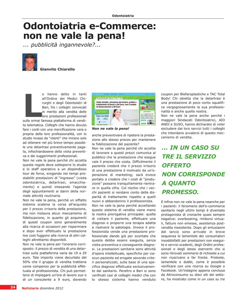 Odontoiatria Odontoiatria e-Commerce: non ne vale la pena! ... pubblicità ingannevole?... Gianvito Chiarello L o hanno detto in tanti all’Ordine dei Medici Chirurghi e degli Odontoiatri di Bari, fra i colleghi convocati in merito alla vendita delle loro prestazioni professionali sulla ormai famosa piattaforma di vendita telematica. Colleghi che hanno dovuto fare i conti con una mercificazione vera e propria della loro professionalità, con lo studio invaso da “clienti” che mirano solo ad ottenere nel più breve tempo possibile una detartrasi preventivamente pagata, infischiandosene della visita preventiva e dei suggerimenti professionali. Non ne vale la pena perché chi accetta queste regole deve sottoporre lo studio e lo staff operativo a un dispendioso tour de force, erogando nei tempi prestabiliti prestazioni di “ingresso” (visita odontoiatrica, detartrasi, smacchiamento) e quindi intasando l’agenda degli appuntamenti ai danni della normale attività routinaria. Non ne vale la pena, perché un siffatto sistema scatena la corsa all’acquisto per il prezzo irrisorio della prestazione, ma non instaura alcun meccanismo di fidelizzazione, in quanto gli acquirenti di questi coupon sono generalmente alla ricerca di occasioni per risparmiare e dopo aver effettuato la prestazione low cost fuggono alla ricerca di altri colleghi altrettanto disponibili. Non ne vale la pena per l’onorario corrisposto: il prezzo di vendita di una detartrasi sulla piattaforma varia da 19 a 29 euro. Tale importo viene decurtato del 50% che il gruppo di vendita trattiene come compenso per la pubblicità effettuata al professionista. Chi può permettersi di impiegare un’ora di lavoro suo o di un consulente a 9 euro, dovendo 24 Notiziario dicembre 2012 non ne vale la pena! anche preventivare di ripetere la prestazione allo stesso prezzo per mantenere la fidelizzazione del paziente? Non ne vale la pena perché chi accetta di lavorare a questi prezzi comunica al pubblico che la prestazione che esegue vale il prezzo che costa. Difficilmente il paziente crederà che il prezzo irrisorio di una prestazione è motivato da un’operazione di marketing; sarà invece portato a credere che i costi di “produzione” possano tranquillamente rientrare in quella cifra. Col rischio che i vecchi pazienti si rendano conto della disparità di trattamento rispetto a quelli nuovi e abbandonino il professionista. Non ne vale la pena perché accettando questo sistema di vendita viene meno la nostra prerogativa principale: quella di visitare il paziente, effettuare una diagnosi e proporre una terapia adatta a risolvere la patologia. Invece il professionista vende una prestazione professionale dando già per scontato che questa debba essere eseguita, senza visita preventiva e conseguente diagnosi. Le prestazioni sanitarie sono attività d’opera intellettuale, specifiche per ciascun paziente ed erogate secondo criteri personalizzati, sulla base di una specifica diagnosi effettuata esclusivamente dal sanitario. Peraltro a Bari si sono verificati casi di colleghi medici che con lo stesso sistema hanno venduto coupon per Blefaroplastiche e TAC Total Body! Chi obietta che la detartrasi è una prestazione di poco conto squalifica vergognosamente la sua professionalità e anche quella nostra. Non ne vale la pena anche perché i maggiori Sindacati Odontoiatrici, AIO ANDI e SUSO, hanno dichiarato di voler escludere dai loro servizi tutti i colleghi che intendano avvalersi di questo meccanismo di vendita. ... in un caso su tre il servizio offerto non corrisponde a quanto promesso. E infine non ne vale la pena neanche per i pazienti: il fenomeno dell’e-commerce sanitario negli ultimi tempi è diventato protagonista di cronache quasi sempre negative: overbooking, rimborsi virtuali, fatture non emesse, assistenza postvendita inesistente. Dopo gli entusiasmi del lancio sono arrivate in breve sequenza le lamentele dei consumatori insoddisfatti per prestazioni non eseguite e servizi scadenti, degli Ordini professionali e degli stessi esercenti che si sono ritrovati sommersi di richieste a cui non riuscivano a far fronte. Proteste, lamentele e dubbi, come è possibile verificare con una ricerca su Google o Facebook. Un’indagine appena conclusa da Altroconsumo su dieci siti del settore, ha mostrato come in un caso su tre Odontoiatria il servizio offerto non corrisponda a quanto promesso. La Federazione Nazionale dei Medici Chirurghi e degli Odontoiatri ha deciso di denunciare il sito al Garante per la Concorrenza ed ai Carabinieri per la tutela della Salute, per pratica commerciale scorretta e rischi per la salute, dovuti alle sue offerte secondo logiche da supermercato. Non sono sostenibili offerte a costo inferiore agli stessi fattori di produzione, ma soprattutto non è pensabile di vendere prestazioni sanitarie senza diagnosi preventiva. Peraltro il meccanismo di vendita configura una forma di pubblicità non “palese” poiché, sebbene venga fatturata dal sito commerciale all’Odontoiatra come “pubblicità”, non è immediatamente riconoscibile come tale. La pubblicità, a qualsiasi settore si riferisca, deve essere palese (cioè riconoscibile come pubblicità), veritiera e corretta (Decreti legislativi n.74/92 e n.145/2007). Non è ammessa la pubblicità ingannevole che, nella normativa vigente, è definita come “qualsiasi pubblicità che in qualunque modo, compresa la sua presentazione, induca in errore o possa indurre in errore le persone fisiche o giuridiche alle quali è rivolta o che esso raggiunge e che, a causa del suo carattere ingannevole, possa pregiudicare il loro comportamento economico ovvero che, per questo motivo, leda o possa ledere un concorrente”. L’irregolarità del messaggio pubblicitario è sottoposta alle sanzioni disciplinari previste dalla Legge 175/92 e valide a tutt’oggi (censura o sospensione dall’esercizio professionale). Per tutti questi motivi la Commissione Odontoiatrica dell’Ordin
