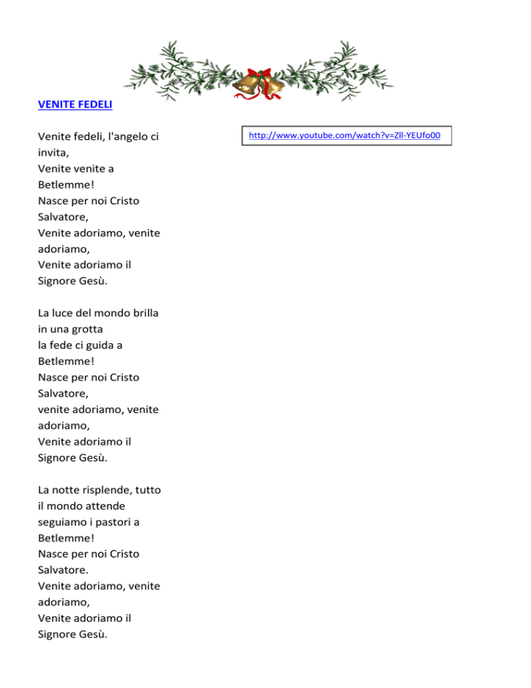 VENITE FEDELI Venite fedeli, l'angelo ci invita, Venite venite a Betlemme! Nasce per noi Cristo Salvatore, Venite adoriamo, venite adoriamo, Venite adoriamo il Signore Gesù. La luce del mondo brilla in una grotta la fede ci guida a Betlemme! Nasce per noi Cristo Salvatore, venite adoriamo, venite adoriamo, Venite adoriamo il Signore Gesù. La notte risplende, tutto il mondo attende seguiamo i pastori a Betlemme! Nasce per noi Cristo Salvatore. Venite adoriamo, venite adoriamo, Venite adoriamo il Signore Gesù. http://www.youtube.com/watch?v=Zll-YEUfo00