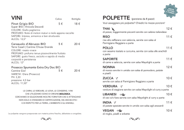 VINI Calice Pinot Grigio BIO Bottiglia 5€ Super BIO | Vinicola Decordi COLORE: Giallo paglierino PROFUMO: Note di meloni maturi e mele appena raccolte SAPORE: Intenso, armonico e ben strutturato ALCOL: 13,5° Cerasuolo d’Abruzzo BIO 5€ Terre Casali | Cantine Chiusa Grande COLORE: rosato vivace PROFUMO: profumo tenue piacevolmente fruttato SAPORE: gusto fresco, asciutto e sapido di media corposità e persistenza ALCOL: 12° Prosecco Spumante Extra Dry Doc BIO Cantine Giol 5€ 18 € POLPETTE (porzione da 8 pezzi) Vuoi assaggiare più polpette? Chiedici le mezze porzioni! THAI 12 € di pesce, leggermente piccanti servite con salsina tailandese RISO 20 € 11 € riso allo zafferano con salsiccia, servite con salsa al Parmigiano Reggiano a parte POLLO 11 € con sesamo tostato e curcuma, servite con salsa alle arachidi a parte SAPORITE 11 € di carne e salsiccia, servite con salsa Mayolight a parte NONNA 20 € VARIETA’: Glera (Prosecco) PH: 3,30 pressione: 4,5 bar ALCOL: 11,50° LE CARNI, LE VERDURE, LE UOVA, LE CONSERVE, I VINI CHE UTILIZZIAMO SONO DI ORIGINE BIOLOGICA. CERCHIAMO DI SELEZIONARE INOLTRE FORNITORI CHE SI ATTENGANO NON SOLO A STANDARD DI CERTIFICAZIONE, MA ANCHE ETICI E DI RISPETTO PER LA TERRA, L’AMBIENTE E GLI ANIMALI. ZUCCA 10 € servite con salsa al Parmigiano Reggiano a parte VERDURA 10 € verdure di stagione servite con salsa Mayolight al curry a parte LIBANESI 10 € di ceci e/o fave servite con salsa Mayolight al curry a parte INDIA 11 € di patate speziate servite in umido con salsa agli anacardi VEGAN Le polpette vengono prepararate con materie prime fresche, abbattute e congelate. 12 € di manzo servite in umido con salsa di pomodoro, patate e piselli di miglio, piselli e erbette 10 € CONTORNI VINI Patate fritte a spicchi con buccia 3,5 € Insalata mista di stagione 3,5 € Dadolata di verdure 3,5 € Polenta 3€ Pure’ 3€ DRINK Cola, Aranciata, Ginger BIO 3,5 € Birretta alla spina (200 cl) 2€ Birra BIO Birrificio San Giminiano 33 cl 5€ Birra BIO Birrificio San Giminiano 75 cl 10 € Birra BIO tedesca 33 cl 4,5 € Te freddo BIO Amatè 3,5 € DOLCI Delizia nera 4,5 € Delizia bianca 4,5 € Caffè 1,5 € Ammazzacaffè 3,5 € Calice Bottiglia Montepulciano d’Abruzzo BIO 5€ 20 € Nero d‘Avola Syrah BIO 5€ 18 € Merlot | Cantine Giol BIO 5€ 20 € Terre Casali | Cantine Chiusa Grande COLORE: Rosso rubino PROFUMO: Il profumo è intenso e fruttato con lievi sentori di floreali SAPORE: Vino di gusto gradevole, morbido, di media corposità e persistenza ALCOL: 12,5° Super BIO | Vinicola Decordi COLORE: Rosso rubino carico con riflessi porpora PROFUMO: Note di frutta matura, note speziate e di liquerizia SAPORE: Molto intenso e persistente, strutturato e rotondo ALCOL: 13,5° COLORE: Rosso rubino non carico PROFUMO: Note floreali molto delicate che si armonizzano con frutta fresca rossa, ciliegia selvatica SAPORE: Armonico, equilibrato, leggermente tanninico ALCOL: 12° Trebbiano d’Abruzzo BIO 5€ 20 € Terre Casali | Cantine Chiusa Grande COLORE: Giallo paglierino PROFUMO: Fresco come i sentori dei petali appena sbocciati SAPORE: Armonico, come il canto poplare di antichi fattori ALCOL: 11,5°