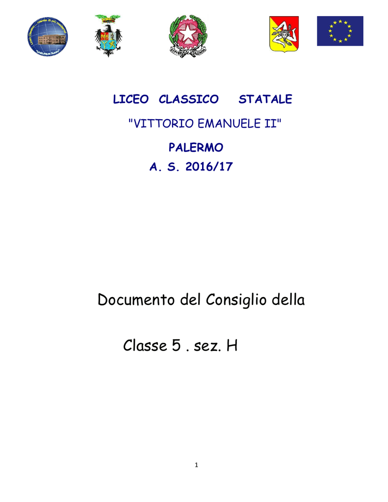 LICEO CLASSICO STATALE "VITTORIO EMANUELE II" PALERMO A. S. 2016/17 Documento del Consiglio della Classe 5 . sez. H 1 INDICE Area pluridisciplinare 1) Presentazione della classe 1.a Composizione_________________________________________pag.3 1.b Continuità didattica____________________________________pag.4 1.c Percorso formativo realizzato_____________________________pag.5 1.d Attività integrative_____________________________________pag.6-7 2) Obiettivi trasversali raggiunti________________________________pag.8 3) Metodi e Strumenti________________________________________pag.9 4) Verifica e valutazione______________________________________pag.10 4.a Tipologia di verifica____________________________________pag.10 4.b Griglie di valutazione___________________________________pag.11-13 5)Attività di recupero e sostegno_______________________________pag.14 6)Terze prove effettuate______________________________________pag.14 6.a Griglie di valutazione___________________________________pag.15-16 Area disciplinare 1) 2) 3) 4) 5) 6) 7) 8) 9) 10) 11) 12) 13) Italiano___________________________________________pag.17-18 Latino____________________________________________pag.19-25 Greco____________________________________________ pag.26-29 Filosofia__________________________________________pag.30-31 Storia____________________________________________ pag.32-33 Matematica e Fisica_________________________________pag.34-36 Lingua e letteratura inglese ___________________________pag.37-39 Scienze___________________________________________pag.40-43 Storia dell’arte _____________________________________pag.44-45 Sostegno__________________________________________pag.46-50 Educazione fisica___________________________________pag.51-52 Religione_________________________________________ pag.53 Firme consiglio di classe_____________________________ pag.54 Allegati 1) Terze prove somministrate. 2) Programmi delle singole discipline. 3) Relazioni finali dei singoli docenti. 4) Griglia di valutazione. 2 Area Pluridisciplinare 1 Presentazione della Classe. 1.a Composizione Aquilino Alice 2. Balletta Martina 3. Castello Simona 4. Catalano Chiara 5. Catania Chiara 6. Ciancio Alida 7. Di Liberto Letizia 8. Di Quarto Barbara 9. La Mattina Sarah 10. Leale Anna Maria 11. Marrali Maria 12. Mercadante Federica 13. Negri Anna 14. Pitarresi Erika 15. Tumminia Chiara 16. Versaci Andrea 17. Villarà Giuseppe 1. 3 1.b Continuità didattica. Schema del Consiglio di Classe nel corso del triennio 2013-2014 / 2014- 2015 / 2015-2016: ANNO DISCIPLINA 2013-2014 2014-2015 2015-20156 Docente Docente Docente ITALIANO D’Attardi Annalisa D’Attardi Annalisa D’Attardi Annalisa LATINO Guarcello Giovanna Guarcello Giovanna Surano Giovanna Zurlo Giorgio CannizzaroFrancesca GRECO Guarcello Giovanna Guarcello Giovanna Surano Giovanna Zurlo Giorgio CannizzaroFrancesca STORIA Bivona Rosa Maria Bivona Rosa Maria Bivona Rosa Maria FILOSOFIA Bivona Rosa Maria Bivona Rosa Maria Bivona Rosa Maria INGLESE Tirrito Rosaria Tirrito Rosaria Tirrito Rosaria SCIENZE Totaro Serena Totaro Serena Totaro Serena MATEMATICA Enea Caterina Enea Caterina Enea Caterina FISICA Enea Caterina Enea Caterina Enea Caterina RELIGIONE Machì Francesco Machì Francesco Machì Francesco EDUC.FISICA Albanese Anna AlbaneseAnna/Farruggia Burgio Pietro Albanese Anna STORIA DELL’ARTE Montesanto Nunzia Montesanto Nunzia Montesanto Nunzia SOSTEGNO Giammanco Giuseppe Marrone Giovanna Di Liberto Federica Giacalone Nicoletta DOCENTE COORDINATRICE: Prof.ssa BIVONA ROSA MARIA 4 1.c Percorso formativo realizzato La classe risulta formata da 17 alunni ( 2 maschi e 15 femmine), tutti provenienti dalla quarta classe dello stesso corso H. Dal primo biennio è stato inserito un alunno portatore di handicap. L’alunno è stato sempre seguito per 18 ore settimanali da docenti di sostegno, nell’anno in corso hanno svolto le attività di sostegno due docenti (9 ore +9 ore). Le stesse hanno operato e operano in sinergia con il cdc.Gli alunni nel corso del triennio, si sono impegnati nella costruzione di un proficuo dialogo educativo, infatti hanno sempre mantenuto un comportamento, dal punto di vista disciplinare, responsabile. La fisionomia socio-culturale della classe, all’inizio del triennio risultava complessivamente omogenea anche se si evidenziavano prerequisiti e livelli cognitivi differenti. Nel corso del triennio la classe ha mantenuto saldo il nucleo centrale degli elementi salvo qualche inserimento nel primo e secondo anno di alunne provenienti da altra scuola o altre sezioni della nostra scuola. All’inizio dell’anno scolastico l’analisi della situazione di partenza ha evidenziato, nel complesso delle discipline, un più che sufficiente possesso del patrimonio cognitivo e dei pre-requisiti fondamentali, coniugato a discrete competenze espressive e una discreta padronanza nell’operare interazioni fra le varie discipline.In tal modo la programmazione del consiglio di classe si è proposta il consolidamento di tali abilità. La classe ha usufruito nel corso del triennio di una buona continuità didattica tranne in latino e greco, discipline nelle quali all’inizio dell’anno scolastico, è subentrata una docente diversa dal secondo biennio. Nel corso del primo trimestre si sono avvicendati ben quattro docenti, e solo all’inizio del pentamestre la classe ha avuto una docente stabile. Nel corso dell’anno un gruppo di alunni, ha partecipato attivamente al dialogo educativo, mostrando di possedere una buona padronanza dei contenuti e del lessico specifico, operando collegamenti pluridisciplinari e rielaborando in modo critico e personale i contenuti con una forma corretta e articolata; gli stessi si sono adoperati attivamente in attività extrascolastiche con approfondimenti e contributi critici e personali, altri, hanno partecipato in maniera soddisfacente al dialogo educativo, mostrando un impegno nello studio costante ma non sempre mirato, ed evidenziando di posseder