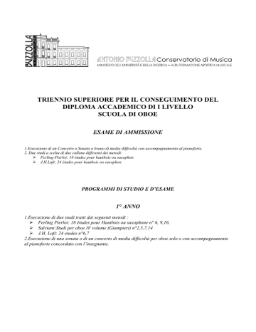 TRIENNIO SUPERIORE PER IL CONSEGUIMENTO DEL DIPLOMA ACCADEMICO DI I LIVELLO SCUOLA DI OBOE ESAME DI AMMISSIONE 1.Esecuzione di un Concerto o Sonata o brano di media difficoltà con accompagnamento al pianoforte. 2. Due studi a scelta di due collane differenti dei metodi: Ferling-Pierlot: 18 ètudes pour hautbois ou saxophon J.H.Luft: 24 études pour hautbois ou saxophon PROGRAMMI DI STUDIO E D’ESAME 1° ANNO 1.Esecuzione di due studi tratti dai seguenti metodi : Ferling Pierlot: 18 ètudes pour Hautbois ou saxophone n° 6, 9,16, Salviani:Studi per oboe IV volume (Giampieri) n°2,5,7,14 J.H. Luft: 24 etudes n°6,7 2.Esecuzione di una sonata o di un concerto di media difficoltà per oboe solo o con accompagnamento al pianoforte concordato con l’insegnante. 2° ANNO 1. Esecuzione di due studi fra i seguenti : J.Luft 24 ètudes per 2 oboi- Ed Bote eBock, Berlino n°12,13,16 F.Richter 10 Studi n°2,5 G.Prestini 12 Studi su difficoltà ritmiche di autori moderni- Ed. Bongiovanni n°4,12 A.Pasculli !5 Studi- Ed Ricordi n°1,3,7 2.Esecuzione di una Sonata o Concerto con accompagnamento al pianoforte o un brano per oboe solo concordato con l’insegnante. 3° ANNO 1. Esecuzione di due studi fra i seguenti: A.Pasculli 15 Studi- Ed Ricordi n°1,3,7 A.Cassinelli 6 Studi- Ed Ricordi n°2, 4 S.Singer ( 27 studi op12 n°5 Varsavia) n°14,22 G.Prestini –Ed. Fantuzzi, Milano n°2,4 2. Esecuzione di una Sonata o Concerto con accompagnamento al pianoforte od un brano per oboe solo concordato con l’insegnante. ESAME FINALE Tesi multidisciplinare, con discussione, comprendente l’esecuzione di un brano originale per oboe e pianoforte non eseguito nei precedenti esami di prassi esecutiva. Repertorio oboistico di riferimento (per triennio e biennio) A. Vivaldi Concerti e Sonate T. Albinoni Concerti A. Marcello Concerto J.M. Leclerc Concerto J.S. Bach Concert e Sonate oboe- oboe d’amore C.Ph E. Bach Concerto in Mi bemolle maggiore e Si bemolle G.F. Haendel Concerti e Sonate J.B. Loeillet Sonate G.P. Telemann Concerti e Sonate D.Cimarosa Concerto in Do minore A. Pedrollo Concertino G.Sammartini Concerto n°1 in Fa maggiore W.R. Molique Concertino W.A. Mozart Concerto K314 e Quartetto in Fa maggiore – Adagio J.Haydn Concerto in Do maggiore J. Reicha Concerto in Fa maggiore F. Krommer Concerto in Fa maggiore K.D.Von Dittersdorf Concerto in Sol Maggiore L.A. Lebrun Concerto n°1 in Re maggiore J.W. Kallivoda Concertino, Morceau de Salon J.N Hummel Adagio e Variazioni R. Schumann Tre Romanze, Adagio ed Allegro V. Bellini Concerto E.W. Ferrari Concertino A. Ponchielli Capriccio R. Strauss Concerto R.Vaughan Wiliams Concerto B. Martinu Concerto F. Poulenc Sonata P. Hindemith Sonata B. Britten Sei Metamorfosi da Ovidio