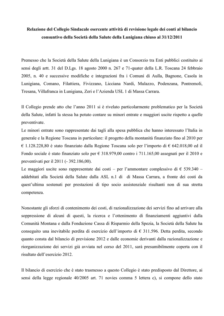 Relazione del Collegio Sindacale esercente attività di revisione legale dei conti al bilancio consuntivo della Società della Salute della Lunigiana chiuso al 31/12/2011 Premesso che la Società della Salute della Lunigiana è un Consorzio tra Enti pubblici costituito ai sensi degli artt. 31 del D.Lgs. 18 agosto 2000 n. 267 e 71-quater della L.R. Toscana 24 febbraio 2005, n. 40 e successive modifiche e integrazioni fra i Comuni di Aulla, Bagnone, Casola in Lunigiana, Comano, Filattiera, Fivizzano, Licciana Nardi, Mulazzo, Podenzana, Pontremoli, Tresana, Villafranca in Lunigiana, Zeri e l’Azienda USL 1 di Massa Carrara. Il Collegio prende atto che l’anno 2011 si è rivelato particolarmente problematico per la Società della Salute, infatti la stessa ha potuto contare su minori entrate e maggiori uscite rispetto a quelle preventivate. Le minori entrate sono rappresentate dai tagli alla spesa pubblica che hanno interessato l’Italia in generale e la Regione Toscana in particolare: il progetto della montanità finanziato fino al 2010 per € 1.128.228,80 è stato finanziato dalla Regione Toscana solo per l’importo di € 642.018,00 ed il Fondo sociale è stato finanziato solo per € 318.979,00 contro i 711.165,00 assegnati per il 2010 e preventivati per il 2011 (- 392.186,00). Le maggiori uscite sono rappresentate dai costi – per l’ammontare complessivo di € 539.340 – addebitati alla Società della Salute dalla ASL n.1 di di Massa Carrara, a fronte dei costi da quest’ultima sostenuti per prestazioni di tipo socio assistenziale risultanti non di sua stretta competenza. Nonostante gli sforzi di contenimento dei costi, di razionalizzazione dei servizi fino ad arrivare alla soppressione di alcuni di questi, la ricerca e l’ottenimento di finanziamenti aggiuntivi dalla Comunità Montana e dalla Fondazione Cassa di Risparmio della Spezia, la Società della Salute ha conseguito una inevitabile perdita di esercizio dell’importo di € 311.596. Detta perdita, secondo quanto consta dal bilancio di previsione 2012 e dalle economie derivanti dalla razionalizzazione e riorganizzazione dei servizi già avviata nel corso del 2011, sarà presumibilmente coperta con il risultato dell’esercizio 2012. Il bilancio di esercizio che è stato trasmesso a questo Collegio è stato predisposto dal Direttore, ai sensi della legge regionale 40/2005 art. 71 novies comma 5 lettera c), si compone dello stato patrimoniale, del conto economico e della nota integrativa, ed è accompagnato da una Relazione sull’attività svolta nel corso dell’esercizio. Premesso che a norma dell’art. 2403 del Codice Civile è attribuita al Collegio Sindacale sia l’attività di vigilanza amministrativa sia la funzione di revisione legale dei conti, i Sindaci danno conto del proprio operato per l’esercizio chiuso il 31/12/2011. Parte prima Relazione ai sensi dell’art. 14, primo comma, lettera a) del D.Lgs n. 39/2010 a) Abbiamo svolto la revisione legale dei conti del bilancio d'esercizio della Società della Salute della Lunigiana chiuso il 31/12/2011. La responsabilità della redazione del bilancio d'esercizio in conformità alle norme che ne disciplinano i criteri di redazione compete all’organo amministrativo della Società della Salute della Lunigiana. E' nostra la responsabilità del giudizio professionale espresso sul bilancio d'esercizio e basato sulla revisione legale dei conti. b) Il nostro esame è stato condotto secondo gli statuiti principi di revisione legale dei conti. In conformità ai predetti principi, la revisione legale dei conti è stata pianificata e svolta al fine di acquisire ogni elemento necessario per accertare se il bilancio d'esercizio sia viziato da errori significativi e se risulti, nel suo complesso, attendibile. Il procedimento di revisione legale dei conti è stato svolto in modo coerente con la dimensione del consorzio e con il suo assetto organizzativo. Esso comprende l'esame, sulla base di verifiche a campione, degli elementi probativi a supporto dei saldi e delle informazioni contenute nel bilancio, nonché la valutazione dell'adeguatezza e della correttezza dei criteri contabili utilizzati e della ragionevolezza delle stime effettuate dall’ Organo amministrativo. Riteniamo che il lavoro svolto fornisca una ragionevole base per l'espressione del nostro giudizio professionale. c) Il Collegio sindacale, in conseguenza alla revisione legale svolta, con riguardo all’aspetto contabile, rileva che il Bilancio consuntivo dell’esercizio 2011 è conforme alle disposizioni statuarie e alle disposizioni in materia di contabilità delle Società della Salute approvate dalla Giunta Regionale Toscana con delibera n. 1265 del 28/12/2009: - in relazione ai crediti iscritti in bilancio occorre rappresentare che nella voce “Crediti verso altri”, ove risultano iscritti i crediti maturati verso i clienti persone fisiche compartecipanti alla spesa sanitaria, sono presenti crediti verso persone fisiche sorti sin dall’anno 2009, i quali risultano connotati da un basso grado di esigibilità; il Collegio prende atto sia dell’implementazione nel corso dell’anno 2011 di una procedura di recupero crediti finalizzata a ridurre al minimo il rischio d’inesigibilità sia dell’iscrizione di un fondo svalutazione crediti dell’importo di € 39.464 che riduce il valore nominale dei crediti iscritti al loro valore di presumibile realizzazione; d) A nostro giudizio, il sopramenzionato bilancio nel suo complesso è conforme alle norme che ne disciplinano i criteri di redazione; esso pertanto è stato redatto con chiarezza e rappresenta in modo veritiero e corretto la situazione patrimoniale e finanziaria e il risultato economico del Consorzio Società della Salute della Lunigiana per l’esercizio chiuso al 31/12/2011. e) La responsabilità della redazione della Relazione sulla gestione in conformità a quanto previsto dalle norme di legge compete al Direttore della Società della Salut