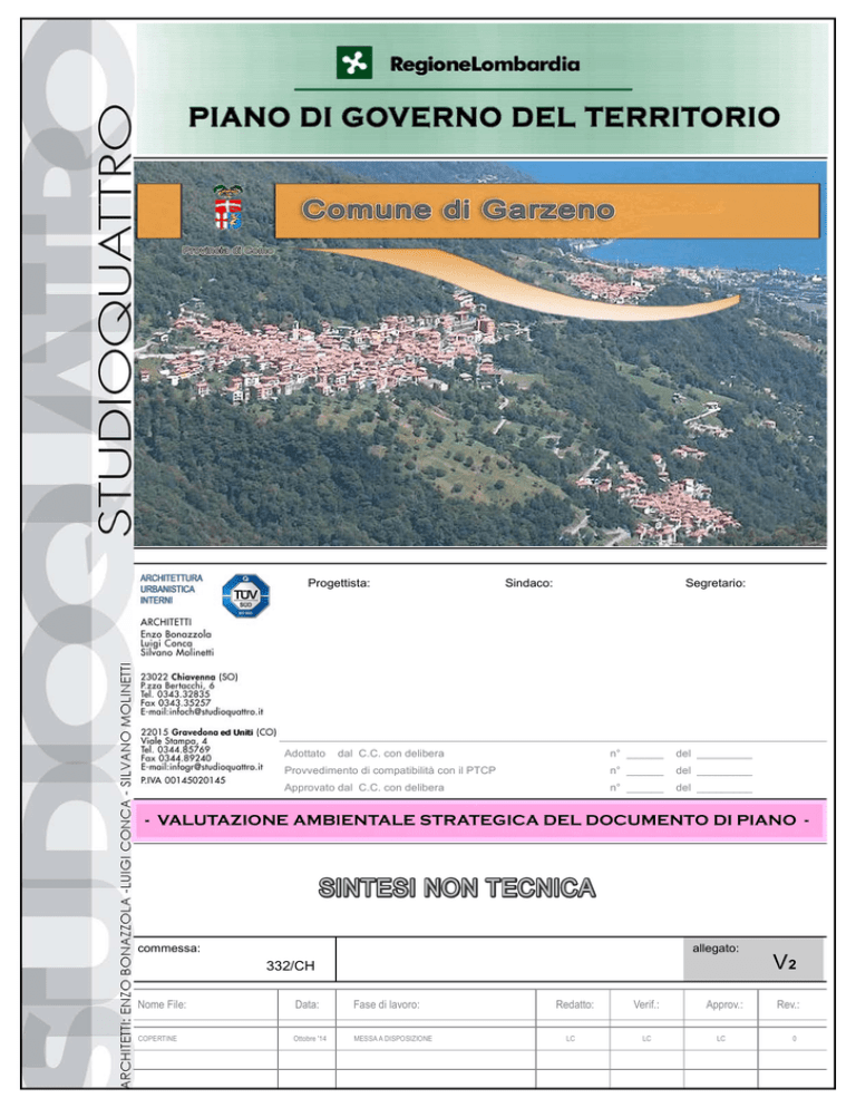 Progettista: Adottato Sindaco: Segretario: dal C.C. con delibera n° ______ del _________ Approvato dal C.C. con delibera n° ______ del _________ Provvedimento di compatibilità con il PTCP n° ______ del _________ - VALUTAZIONE AMBIENTALE STRATEGICA DEL DOCUMENTO DI PIANO - SINTESI NON TECNICA commessa: allegato: 332/CH Nome File: Data: Fase di lavoro: COPERTINE Ottobre '14 MESSA A DISPOSIZIONE Redatto: LC Verif.: LC Approv.: LC V2 Rev.: 0 PGT – COMUNE DI GARZENO - Valutazione ambientale strategica del documento di piano - VALUTAZIONE AMBIENTALE STRATEGICA DEL PGT DI GARZENO (COMO) - SINTESI NON TECNICA - 1. INQUADRAMENTO GENERALE Il territorio del Comune di Garzeno è situato in provincia di Como, nella Comunità Montana Valli del Lario e del Ceresio, il territorio comunale è interamente montano, collocato ad un’altitudine che va dai 500 mt. slm della frazione Catasco, fino ai 2.245 mt. slm del Pizzo di Gino , e ai 2.100 mt. slm del Monte Bregagno, le cui cime fanno da corona alla parte alta del territorio comunale. La valle Albano è percorsa dall’asse dell’omonimo torrente e si colloca tra il Lago di Como e lo spartiacque con la Val Morobbia, il suo territorio confina con le valli del Liro e la Val Cavargna . In questa vallata sono dislocati tre piccoli comuni, abitati complessivamente da circa 1.800 residenti. I paesi si snodano lungo la strada che da Dongo giunge a Garzeno : Stazzona (500 m. slm. circa ), Germasino (570 m s.l.m. circa ), e Garzeno (650 m s.l.m. circa ); attorniati da splendide montagne che conferiscono al paesaggio un aspetto aspro e austero. Il nucleo di Garzeno sorge a mezza costa a 600 m. d'altitudine sul versante sud della valle Albano, appena più a valle del capoluogo, a 500 m. d'altitudine sorge la frazione di Catasco, unita al capoluogo con una tortuosa strada a tornanti. I nuclei di Catasco e Garzeno sono le sole località del comune abitate tutto l’anno. Garzeno conta al 31/12/2010, 862 abitanti ed una superficie territoriale di 29,08 Kmq per una densità abitativa di 29,64 abitanti per chilometro quadrato. L’entità della popolazione dal 2005 al 2010 è in calo lento ma costante , passando da 947 a 862 abitanti. In Fig.1.1 è riportata la distribuzione percentuale per fasce d’età nel comune di Garzeno. Popolazione residente totale per classe di età. Totali al 1.1. 2011 Istat 0-5 6-10 13106 37 22 CLASSI DI ETA' 11-14 15-19 20-24 25-29 14 33 49 34 30-59 359 60-64 65 e + Totale 68 246 862 Fig.1.1 – Distribuzione per fasce di età della popolazione STUDIOQUATTRO - Gravedona Sintesi non tecnica Rev 0 Pag. 1 di 11 PGT – COMUNE DI GARZENO - Valutazione ambientale strategica del documento di piano - Al gennaio 2011 la popolazione di oltre 60 anni rappresenta oltre 1/3del totale, confermando un dato simile a tutti i comuni del territorio della Valle. Anche il numero delle famiglie anagrafiche è in costante calo passando dalle 434 del 2001 alle 390 del 2010, con numero medio di componenti da 2,37 a 2,21 . Dal 2001 al 2010 la popolazione è diminuita del 16,31%. La parte più elecata del territorio del comune di Garzeno, confina con Parco Locale di Interesse Sovracomunale (PLIS) della valle Albano che icade in territorio di Germasino. STUDIOQUATTRO - Gravedona Sintesi non tecnica Rev 0 Pag. 2 di 11 PGT – COMUNE DI GARZENO - Valutazione ambientale strategica del documento di piano - 2. QUADRO AMBIENTALE ATTUALE È stato innanzi tutto descritto il sistema ambientale nelle sue condizioni attuali, evidenziando i livelli di qualità delle sue componenti più rilevanti e individuandone eventuali criticità. L’obiettivo primario della pianificazione deve essere, come esplicitato dalle Direttive europee e dalla normativa nazionale e regionale, quello dello sviluppo sostenibile e, quindi, quello di un miglioramento della qualità della vita e dei servizi nel rispetto della qualità ambientale, per la quale si deve mirare, ove possibile, ad un miglioramento, senza accettare, in nessun caso, un peggioramento. In generale, nel territorio di Garzeno non sono presenti rilevanti fonti di emissioni inquinanti in atmosfera e le concentrazioni di inquinanti rilevate nella stazione ARPA più prossima al comune (Colico) sono per lo più compatibili con gli standard di legge (D.Lgs. 155/2010). Le emissioni provenienti dagli autoveicoli che transitano sulla strada provinciale e dagli usi domestici degli edifici civili sono da considerare elementi secondari di inquinamento. Inoltre, l’ambiente montano con la rilevante presenza di patrimonio naturalistico e la circolazione delle masse d’aria influenzata dalla morfologia del territorio, contribuiscono a mantenere una buona qualità complessiva dell’aria. Nel territorio comunale scorre il torrente l’Albano con diversi piccoli affluenti laterali. Come per la maggior parte dei corsi d’acqua della porzione settentrionale della provincia di Como, nell’Albano la qualità delle acque non sembra presentare particolari problemi, mentre si rilevano alterazioni della morfologia degli alvei e significative interruzioni della continuità ecologica fluviale. Per il torrente Albano il Piano ittico provinciale riscontra alterazioni della morfologia degli alvei e significative interruzioni della continuità ecologica fluviale. Le acque di pregio ittico come classificate dal Piano ittico provinciale sono : corso principale dalle sorgenti alla diga della Reggea, Lami Rosso dalle sorgenti alla presa Edison, Lami di Marnotto dalle sorgenti alla presa Edison, Lami di Moredina, Valle Bedolina, Valle di Lumia, Valle del Dosso, Valle di Brenzeglio, Valle di Gromo, Valle di Gino o Lami delPozzo, Valle dei Dosseli Il tratti classificati come “Acque di pregio ittico potenziale” sono: Torrente Albano, dalla diga della Reggea alla foce in lago Valle di Marnotto, dalla presa Edison alla confluenza nell’Albano Per tale categoria di acque le alterazioni morfologiche comportano impatti significativi sulla qualità degli habitat 