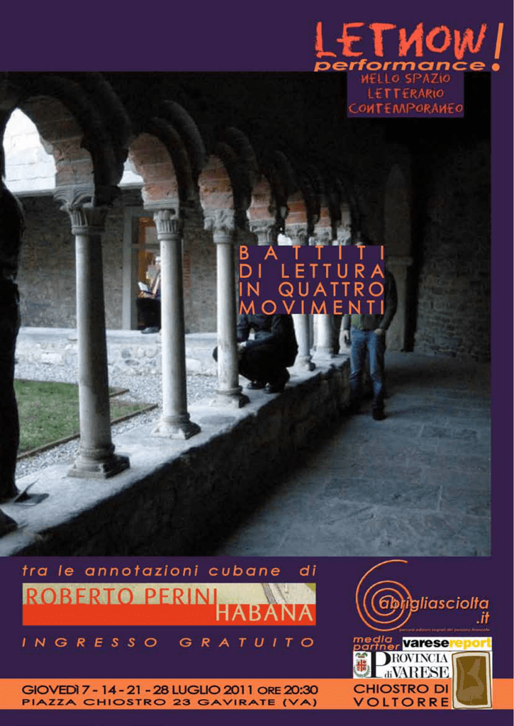 letnow! performance nello spazio letterario contemporaneo scrittura, performazione e lettura ai tempi del new media nella fresca cornice del Chiostro di Voltorre e l’esposizione “Habana” di Roberto Perini. letnow! è una rassegna artistico-letteraria dedicata alla letteratura contemporanea: pillole di letteratura direttamente dalla scena contemporanea per ri-imparare a scandire i battiti della lettura in spazi pubblici e storicamente riconducibili al fiorire della cultura “itinerante”. Per l’estate 2011 si presenta presso il chiostro di Voltorre, monumento benedettino del XII secolo, che ricorda lo spirito dei clerici vagantes, quegli studenti girovaghi che, nel basso medioevo, sino al XIII secolo, solevano spostarsi in tutta Europa per poter seguire le lezioni che ritenevano più opportune. Il chiostro di Voltorre è un prezioso tesoro architettonico della Provincia di Varese che per tutto il mese di luglio aprirà i suoi portici alle 20:30 del giovedì sera, consentendo la visita della mostra Habana di Roberto Perini (http://www.varesereport.it/2011/06/10/robertoperini-al-chiostro-e-tempo-di-rifare-il-male/), prima di immergersi nelle pillole di letteratura direttamente dalla scena contemporanea per ri-imparare a scandire i battiti della lettura. letnow! soddisfa la fame di pensiero in azione delle nostre menti. Nata nell’ottobre del 2007, per volere di Ombretta Diaferia, direttore artistico ed editoriale abrigliasciolta e della giovane scrittrice Valeria Brignani, si è presentata per la prima volta in un luogo deputato all’aggregazione giovanile, dove si sono succedute le performance di emergenti come Marco Valsecchi, Placido Di Stefano, Thomas Maria Croce, e, nella sezione “letnow! woman” Chiara Zocchi, Silvia Monti e Francesca Genti. Per tre anni la rassegna ha itinerato, proponendo progetti come “banda a mano libera”, “banda diversi”, “poesia da versi diversi”, “pari e diversi”, nonché il progetto “carovana dei versi”, produzioni con cui abrigliasciolta promuove gli emergenti del panorama nazionale. Il calendario dell’estate 2011 si propone di aprirsi ed offrire incontri volti a scoprire scrittura, performazione e lettura ai tempi del new media, cioé forme di espressioni non tipicamente lineari nella composizione né individuali e passive nella fruizione. Gli autori, editori, organizzatori invitati presenteranno progetti che non si limitano alla lineare scrittura su carta, ma impiegano diversi mezzi di comunicazione per la necessità di esprimersi secondo tutte le forme, di cui gli autori per primi sono oggetto, perché deputati alla conoscenza e diffusione. letnow! 2011 scandisce battiti di lettura in quattro movimenti. trenta giugno duemilaundici segnali percorsi ediz ioni del pensiero itinerante [email protected] +39.0332.320167 - +39.334.8683364 www.abrigliasciolt.it letnow! performance nello spazio letterario contemporaneo scrittura, performazione e lettura ai tempi del new media nella fresca cornice del Chiostro di Voltorre e l’esposizione “Habana” di Roberto Perini. battiti di lettura in quattro movimenti 1. azione del testo: autore libro+dvd (7 luglio) come un progetto artistico si trasforma in comunicazione performativa, teatrale, musicale, dialettale, sociale. e si racchiude tutto in un libro con DVD 2. edizione del testo: casa editrice con autori (14 luglio) come si propongono autori di racconti e raccolte di poesia che hanno affidato la propria opera nelle mani dello stesso editore 3. lettura del testo: editor sui mestieri del libro (21 luglio) come l’autore raggiunge il lettore attraverso un esercito di persone che “trasporta” il volume in libreria. scrivere e leggere sono attività solitarie. pubblicare è impresa collettiva. 4. performazione del testo: performer (28 luglio) come tre autori si incontrano e danno forma ai loro libri in azione. Il Chiostro di Voltorre aprirà al pubblico alle 20:30 per consentire la visita della mostra “Habana” di Roberto Perini. I quattro movimenti saranno accolti da “carovana dei versi - poesia in azione”, il collettivo che da sette anni itinera diffondendo poesia nella quotidianità dell’uomo. trenta giugno duemilaundici segnali percorsi ediz ioni del pensiero itinerante [email protected] +39.0332.320167 - +39.334.8683364 www.abrigliasciolt.it letnow! performance nello spazio letterario contemporaneo scrittura, performazione e lettura ai tempi del new media nella fresca cornice del Chiostro di Voltorre e l’esposizione “Habana” di Roberto Perini. battiti di lettura in quattro movimenti 1. azioni del testo: autore libro+dvd (7 luglio) Dome Bulfaro MILANO ICTUS con la partecipazione straordinaria di Francesco Marelli, Massimiliano Varotto e i Danno Compound La rassegna si aprirà alla scoperta di una delle novità letterarie che intesse la scrittura con l’arte della musica e della drammaturgia. L’appuntamento è stato affidato a Dome Bulfaro che ha recentemente realizzato un progetto editoriale-performativo-musicale: “Milano Ictus” è spettacolo poetico di e con Dome Bulfaro, regia di Enrico Roveris che unisce la cultura giudaico-cristiana occidentale col canto armonico di Lorenzo Pierobon, la musica cross-over di Massimiliano Varotto e del suo ensemble Danno Compound (10 batterie) e quella popolare dello straordinario cantastorie milanese Francesco Marelli, presenti con Dome Bulfaro alla serata del 7 luglio. 2. edizione del testo: casa editrice con autori (14 luglio) Silvio Mignano LA NOSTRA RIVELLE BUONA EDUCAZIONE (poesia Manni) Giuseppe Villa MEMORIALE SCRITTO SU CARTA CHIMICA (romanzo Manni) Fabio Contestabile SPAZI E TEMPI (poesia Manni) Il secondo appuntamento sarà affidato ad una delle case editrici più attive, che sta dimostrando anche nella successione generazionale, l’apertura a nuove forme ed intessiture: Manni presenterà le proprie scelte editoriali attraverso le nuove uscite di poesia e narrativa. Silvio Mignano, Giuseppe Villa e Fabio Co