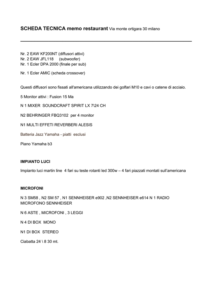 SCHEDA TECNICA memo restaurant Via monte ortigara 30 milano _____________________________________________________________ Nr. 2 EAW KF200NT (diffusori attivi) Nr. 2 EAW JFL118 (subwoofer) Nr. 1 Ecler DPA 2000 (finale per sub) Nr. 1 Ecler AMIC (scheda crossover) Questi diffusori sono fissati all'americana utilizzando dei golfari M10 e cavi o catene di acciaio. 5 Monitor attivi : Fusion 15 Ma N 1 MIXER SOUNDCRAFT SPIRIT LX 7\24 CH N2 BEHRINGER FBQ3102 per 4 monitor N1 MULTI EFFETI REVERBERI ALESIS Batteria Jazz Yamaha - piatti esclusi Piano Yamaha b3 IMPIANTO LUCI Impianto luci martin line 4 fari su teste rotanti led 300w – 4 fari piazzati montati sull’americana MICROFONI N 3 SM58 , N2 SM 57 , N1 SENNHEISER e902 ,N2 SENNHEISER e614 N 1 RADIO MICROFONO SENNHEISER N 6 ASTE , MICROFONI , 3 LEGGI N 4 DI BOX MONO N1 DI BOX STEREO Ciabatta 24 \ 8 30 mt.