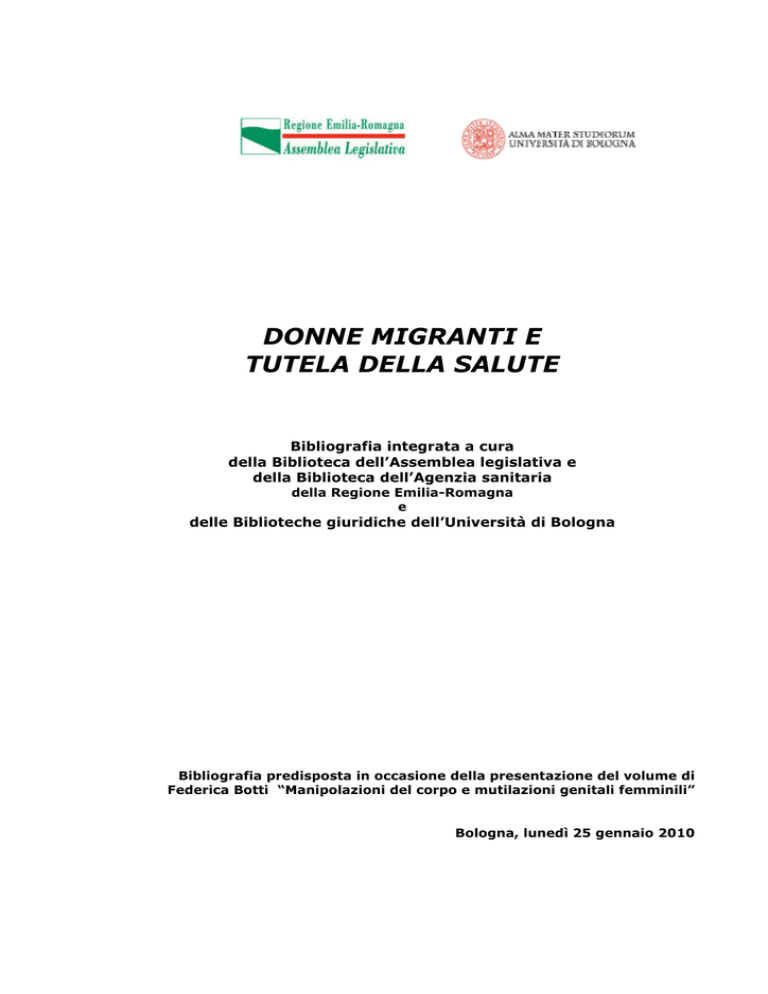 DONNE MIGRANTI E TUTELA DELLA SALUTE Bibliografia integrata a cura della Biblioteca dell’Assemblea legislativa e della Biblioteca dell’Agenzia sanitaria della Regione Emilia-Romagna e delle Biblioteche giuridiche dell’Università di Bologna Bibliografia predisposta in occasione della presentazione del volume di Federica Botti “Manipolazioni del corpo e mutilazioni genitali femminili” Bologna, lunedì 25 gennaio 2010 Biblioteca dell’Assemblea legislativa della Regione Emilia-Romagna Area di specializzazione: diritto pubblico, scienza dell’amministrazione pubblica Viale Aldo Moro, 32 - 40127 Bologna Tel.: 051 527 5047 - Fax 051 515 288 [email protected] http://assemblealegislativa.regione.emilia-romagna.it/biblioteca/ Biblioteca dell’Agenzia sanitaria e sociale della Regione Emilia-Romagna Area di specializzazione: politiche di salute, organizzazione dei servizi sanitari, prevenzione e politiche sociali Viale Aldo Moro, 21 – 40127 Bologna Tel.: 051 527 7178 – Fax 051 527 7053 [email protected] http://asr.regione.emilia-romagna.it/wcm/asr/biblioteca/biblioteca.htm Biblioteca del Dipartimento di Scienze Giuridiche “A. Cicu” Area di specializzazione: tutte le aree di interesse delle discipline giuridiche Via Zamboni, 27/29 - 40126 Bologna Tel.: 051 209 9686 - Fax: 051 209 9624 [email protected] http://www.giuridico.unibo.it Biblioteca della SPISA - Scuola di Specializzazione in Studi sull’Amministrazione Pubblica Area di specializzazione: discipline giuridiche pubblicistiche Via Belmeloro, 10 - 40126 Bologna Tel.: 051 209 4064 - Fax: 051 209 4060 [email protected] http://www.spisa.unibo.it/SPISA/Biblioteca/presentazione/ Biblioteca del CIRSFID - Centro Interdipartimentale di Ricerca in Storia del Diritto, Filosofia e Sociologia del Diritto e Informatica Giuridica Area di specializzazione: informatica giuridica e diritto dell’informatica Via Galliera, 3 - 40121 Bologna Tel.: 051 277 220 - Fax: 051 277 247 [email protected] http://www.cirsfid.unibo.it/CIRSFID/Servizi/Biblioteca/ Biblioteca del Dipartimento di Discipline Giuridiche dell’Economia e dell’Azienda Area di specializzazione: Discipline giuridiche nell’ambito dell’economia Via S. Giacomo, 3 - 40126 Bologna Tel.: 051 209 9970 / 9971 - Fax: 051 209 9977 [email protected] http://www.diritto.unibo.it/DisciplineGiuridiche/Biblioteca/ 2 DONNE MIGRANTI E TUTELA DELLA SALUTE MONOGRAFIE *Manipolazioni del corpo e mutilazioni genitali femminili / Federica Botti ; introduzione di Francesco Onida. - Bologna : Bononia university press, 2009. - 263 p. ; 24 cm. * Aspetti culturali e giuridici delle MGF (mutilazioni genitali femminili) * Profili storici, antropologici, culturali e giuridici delle MGF in Africa * Legislazione italiana e degli Stati nazionali africani sulle MGF * Ampia bibliografia * Biblioteca dell’Assemblea Legislativa A A1 PG 09MAN La*salute della popolazione immigrata : metodologia di analisi : Progetto Promozione della salute della popolazione immigrata in Italia, accordo Ministero della salute /CCM - Regione Marche (Direzione generale prevenzione sanitaria, Ufficio I, n.DG/PREV/I 3488/P/F 3 ad, 2007 / Agenzia nazionale per i servizi sanitari regionale (Age.na.s.)....et al. - [s.l. : s.n.], 2009. - 198 p. : tab. ; 30 cm. Biblioteca dell’Agenzia sanitaria regionale A WA 300 SALDPI *Donne in cammino : salute e percorsi di cura di donne immigrate / Monica Dotti, Simona Luci. - Milano : F. Angeli, [2008!. - 201 p. ; 23 cm. Biblioteca dell’Agenzia sanitaria regionale A HQ 1101 DOTTM *Diritto europeo dell'immigrazione e principio delle pari opportunità : lo status delle donne immigrate nell'Unione Europea : tesi in Diritto delle Comunità Europee / tesi di laurea di Chiara Pirazzini ; relatore Marco Gestri. - [S.l. : s.n.], 2007. 207 p. ; 31 cm. Biblioteca dell’Assemblea Legislativa B S 2. 8 07DIR *A caro prezzo : le diseguaglianze nella salute : 2. rapporto dell'Osservatorio italiano sulla salute globale. - Pisa : ETS, [2006]. - 344 p. ; 21 cm. Biblioteca dell’Agenzia sanitaria regionale A WA 30 ACPLDN *Con voce di donna : migranti dall'Est, straniere di casa / Novita Amadei. - Parma : Provincia di Parma, Assessorato pari opportunità ; Torino : Gruppo Abele, [2005]. - 88 p. ; 21 cm. Suppl. di: Animazione sociale, n. 5/2005 Biblioteca dell’Assemblea Legislativa A A1 PG 05CON *Donne migranti : le difficili scelte di maternità : ricerca sull'interruzione di gravidanza nella provincia di Reggio Emilia / Maria Merelli, Maria Grazia Ruggerini. Roma : Carocci, 2005. - 141 p. ; 22 cm. Biblioteca dell’Assemblea Legislativa A S 2. 3 05DON *Quando emigrano le donne : percorsi e reti femminili della mobilità transnazionale / Francesca Decimo. - Bologna : il Mulino, [2005]. - 236 p. ; 22 cm. Biblioteca dell’Assemblea Legislativa A A1 PG 05QUA Biblioteca del Dipartimento di Scienze Giuridiche “A. Cicu” XVI D 0276 *Società, culture e differenze di genere : percorsi migratori e stati di salute / Lia Lombardi. - Milano : Angeli, [2005]. - 193 p. ; 23 cm. Biblioteca dell’Assemblea Legislativa A A1 PG 05SOC 3 *Tra donne: vecchi legami e nuovi spazi : pratiche tradizionali e transnazionali nel lavoro delle immigrate / Emma Corigliano, Lidia Greco. - Milano : Franco Angeli, [2005]. - 128 p. ; 23 cm. Biblioteca dell’Assemblea Legislativa A S 2. 8 05TRA *Researching violence against women : a practical guide for researchers and activists / Mary Ellsberg , Lori Heise. - Geneva : WHO, c2005. - 257 p. : ill. ; 28 cm. Biblioteca dell’Agenzia sanitaria regionale A HV 6556 RESVAW *Schiavitù emergenti : la tratta e lo sfruttamento delle donne nigeriane sul litorale Domitio / a cura di Adriana Bernardotti, Francesco Carchedi e Benedetta Ferone ; prefazione di Adriana Buffardi. - Roma : Ediesse [2005]. - 222 p. ; 22 cm Biblioteca dell’Agenzia sanitaria regionale A HQ 101 SCHE La*famiglia nell'immigrazione: condizioni di vita e culture a confronto / CNEL, Consiglio nazionale dell'economia e del lavor