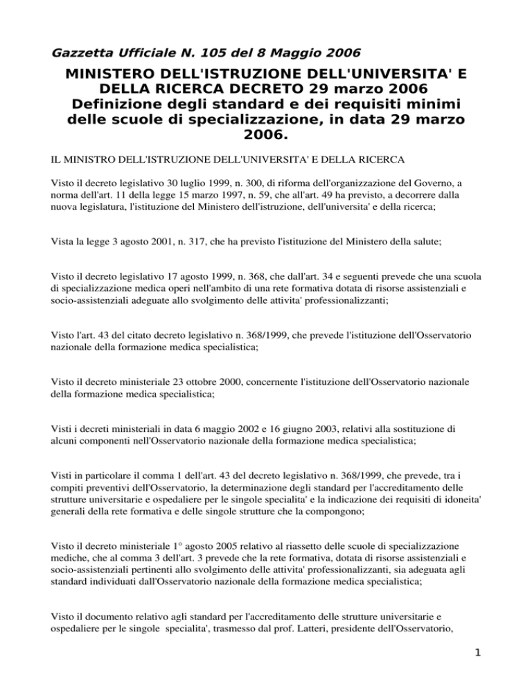 Gazzetta Ufficiale N. 105 del 8 Maggio 2006 MINISTERO DELL'ISTRUZIONE DELL'UNIVERSITA' E DELLA RICERCA DECRETO 29 marzo 2006 Definizione degli standard e dei requisiti minimi delle scuole di specializzazione, in data 29 marzo 2006. IL MINISTRO DELL'ISTRUZIONE DELL'UNIVERSITA' E DELLA RICERCA Visto il decreto legislativo 30 luglio 1999, n. 300, di riforma dell'organizzazione del Governo, a norma dell'art. 11 della legge 15 marzo 1997, n. 59, che all'art. 49 ha previsto, a decorrere dalla nuova legislatura, l'istituzione del Ministero dell'istruzione, dell'universita' e della ricerca; Vista la legge 3 agosto 2001, n. 317, che ha previsto l'istituzione del Ministero della salute; Visto il decreto legislativo 17 agosto 1999, n. 368, che dall'art. 34 e seguenti prevede che una scuola di specializzazione medica operi nell'ambito di una rete formativa dotata di risorse assistenziali e socioassistenziali adeguate allo svolgimento delle attivita' professionalizzanti; Visto l'art. 43 del citato decreto legislativo n. 368/1999, che prevede l'istituzione dell'Osservatorio nazionale della formazione medica specialistica; Visto il decreto ministeriale 23 ottobre 2000, concernente l'istituzione dell'Osservatorio nazionale della formazione medica specialistica; Visti i decreti ministeriali in data 6 maggio 2002 e 16 giugno 2003, relativi alla sostituzione di alcuni componenti nell'Osservatorio nazionale della formazione medica specialistica; Visti in particolare il comma 1 dell'art. 43 del decreto legislativo n. 368/1999, che prevede, tra i compiti preventivi dell'Osservatorio, la determinazione degli standard per l'accreditamento delle strutture universitarie e ospedaliere per le singole specialita' e la indicazione dei requisiti di idoneita' generali della rete formativa e delle singole strutture che la compongono; Visto il decreto ministeriale 1° agosto 2005 relativo al riassetto delle scuole di specializzazione mediche, che al comma 3 dell'art. 3 prevede che la rete formativa, dotata di risorse assistenziali e socioassistenziali pertinenti allo svolgimento delle attivita' professionalizzanti, sia adeguata agli standard individuati dall'Osservatorio nazionale della formazione medica specialistica; Visto il documento relativo agli standard per l'accreditamento delle strutture universitarie e ospedaliere per le singole specialita', trasmesso dal prof. Latteri, presidente dell'Osservatorio, 1 allegato alla nota n. 62 del 9 febbraio 2005; Vista la nota del presidente dell'Osservatorio n. 69 del 20 gennaio 2006, con cui e' stato trasmesso il documento relativo ai requisiti di idoneita' generali della rete formativa e i requisiti specifici in rapporto alle singole specialita'; Acquisito il parere del Consiglio universitario nazionale; Acquisita l'intesa del Ministro della salute; Decreta: Art. 1. Il presente decreto definisce gli standard generali, che devono essere posseduti dalle strutture di tutte le specialita' e gli standard specifici relativi alle singole specialita', di cui all'allegato n. 1, facente parte integrante del presente provvedimento, conformemente a quanto disposto nell'art. 43 del decreto legislativo n. 368/1999, determinati da parte dell'Osservatorio nazionale della formazione medica specialistica. Art. 2. Il presente decreto definisce inoltre i requisiti di idoneita' generali della rete formativa e i requisiti specifici delle singole specialita', di cui all'allegato n. 2 del presente provvedimento, cosi' come previsto dall'art. 43 del decreto legislativo n. 368/1999, determinati da parte dell'Osservatorio nazionale della formazione medica specialistica. Roma, 29 marzo 2006 Il Ministro: Moratti ALLEGATI Per gli allegati fare riferimento al supporto cartaceo 2 ALLEGATI 3 1.1 Premesse L’Osservatorio Nazionale della Formazione Medica Specialistica, ai sensi dell’art. 43 del D.L.vo 368/99, ha determinato gli standard delle strutture universitarie e ospedaliere per le singole specialità, ai fini dell’accreditamento. 1.2 Finalità Il presente atto definisce: 1) i presupposti e le condizioni per l’istituzione della Scuola di Specializzazione; 2) gli standard, le modalità e i termini per l’accreditamento delle strutture delle Scuole di specializzazione; 3) i requisiti di idoneità, le modalità e i termini della rete formativa delle Scuole di Specializzazione. 1.3 Presupposti Per l’istituzione della Scuola di Specializzazione, le Università devono presentare i seguenti presupposti: a)perseguimento, tra i propri fini statutari, della finalità della formazione specialistica; b)copertura economico – finanziaria. 1.4 Assunzione di impegni da parte dell’Università responsabile della scuola di specializzazione Le Università, unitamente alla dimostrazione del possesso dei presupposti di cui al comma precedente, devono assumere i 4 seguenti impegni formali: a)accettazione dei controlli dell’Osservatorio Nazionale; b)comunicazione all’Osservatorio Nazionale di tutte le variazioni che intervengono sui presupposti, le condizioni e gli standard che hanno costituito la base dell’accreditamento. 5 PRESUPPOSTI Le Università devono presentare tutti i seguenti presupposti: Presupposti Documenti da produrre a) Perseguimento, tra i propri fini statutari, della finalità della formazione professionale • Copia dello statuto dell’Università ed eventuali atti successivi modificativi o altro documento avente medesima valenza probatoria ai fini della formazione professionale b) Copertura economico – finanziaria dell’Università • Copia dell’ultimo Bilancio, relativamente al capitolo di spesa per le Scuole di Specializzazione c) Assunzioni di impegno dell’Università • accettazione dei controlli dell’Osservatorio Nazionale; • comunicazione all’Osservatorio Nazionale di tutte le variazioni che intervengono nei presupposti, nelle condizioni e negli standard che hanno costituito la base dell’accreditamento • Lettera di intenti con gli organismi che hanno la disponibi