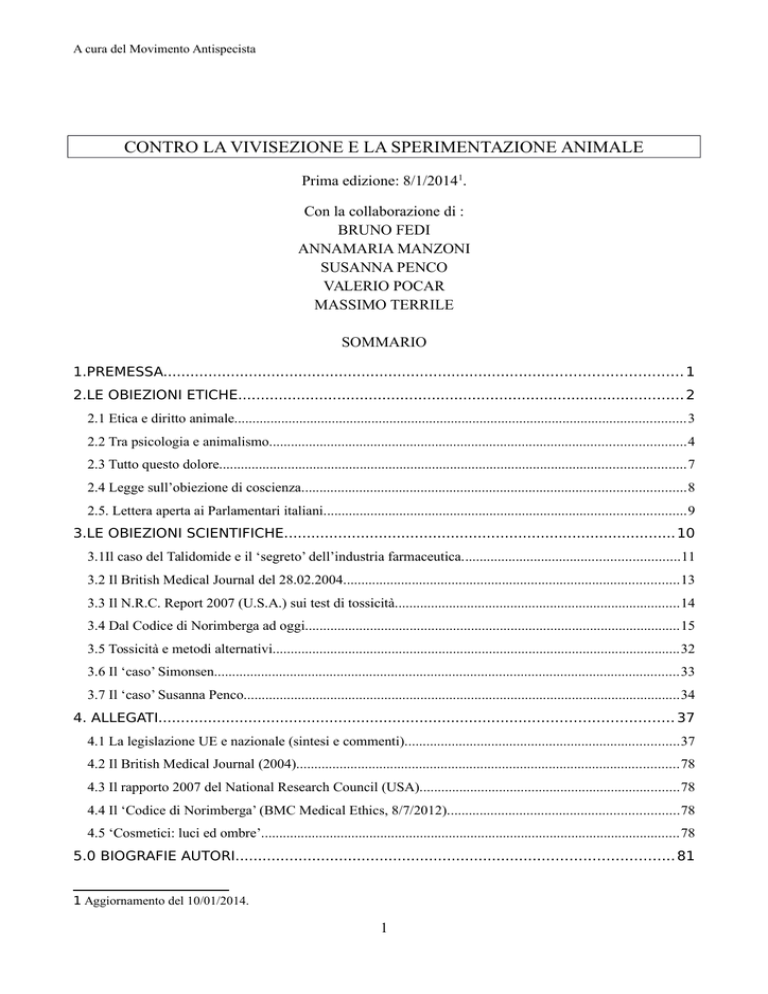 A cura del Movimento Antispecista CONTRO LA VIVISEZIONE E LA SPERIMENTAZIONE ANIMALE Prima edizione: 8/1/20141. Con la collaborazione di : BRUNO FEDI ANNAMARIA MANZONI SUSANNA PENCO VALERIO POCAR MASSIMO TERRILE SOMMARIO 1.PREMESSA................................................................................................................... 1 2.LE OBIEZIONI ETICHE................................................................................................... 2 2.1 Etica e diritto animale.............................................................................................................................3 2.2 Tra psicologia e animalismo...................................................................................................................4 2.3 Tutto questo dolore.................................................................................................................................7 2.4 Legge sull’obiezione di coscienza..........................................................................................................8 2.5. Lettera aperta ai Parlamentari italiani....................................................................................................9 3.LE OBIEZIONI SCIENTIFICHE....................................................................................... 10 3.1Il caso del Talidomide e il ‘segreto’ dell’industria farmaceutica............................................................11 3.2 Il British Medical Journal del 28.02.2004.............................................................................................13 3.3 Il N.R.C. Report 2007 (U.S.A.) sui test di tossicità...............................................................................14 3.4 Dal Codice di Norimberga ad oggi........................................................................................................15 3.5 Tossicità e metodi alternativi.................................................................................................................32 3.6 Il ‘caso’ Simonsen.................................................................................................................................33 3.7 Il ‘caso’ Susanna Penco.........................................................................................................................34 4. ALLEGATI.................................................................................................................. 37 4.1 La legislazione UE e nazionale (sintesi e commenti)............................................................................37 4.2 Il British Medical Journal (2004)..........................................................................................................78 4.3 Il rapporto 2007 del National Research Council (USA)........................................................................78 4.4 Il ‘Codice di Norimberga’ (BMC Medical Ethics, 8/7/2012)................................................................78 4.5 ‘Cosmetici: luci ed ombre’....................................................................................................................78 5.0 BIOGRAFIE AUTORI................................................................................................. 81 1 Aggiornamento del 10/01/2014. 1 A cura del Movimento Antispecista 1. PREMESSA. La lotta contro la vivisezione2 e la sperimentazione animale è entrata ormai a far parte di una scelta di civiltà grazie al progresso nelle conoscenze relative agli animali non umani (e umani) che negli ultimi decenni ha pressoché rivoluzionato intere branche della scienza quali l’etologia, la psicologia, la biologia, la medicina, e il cui riflesso ha notevolmente influenzato le scienze umanistiche, ribaltando alcuni principi filosofici della civiltà così detta ‘occidentale’ consolidati da millenni. Alcune di queste conoscenze non consentono più di considerare gli esseri non umani irrazionali e insensibili. Anzi. Il riconoscimento delle loro capacità emotive, cognitive, e della loro sensibilità ha abbattuto il muro posto dall’antropocentrismo a difesa dei privilegi dell’umanità e minato alla base le pretese di una superiorità ontologica della nostra specie sulle altre. Le intuizioni del grande Charles Darwin, contenute nella semplice ammissione di “differenze di grado ma non di specie”3 tra la mente umana e quella degli animali ‘inferiori’, e dimostrate nella sua successiva opera realtiva alla comparazione dell’espressione delle emozioni tra gli umani e i non umani 4 sono infatti oggi più che mai confermate. Altre conoscenze hanno permesso di riconoscere – considerato che anche ogni essere umano può reagire a livello biologico assai diversamente da un altro – che la differenza biologica tra umani e non umani, in particolare a maturità del relativo sviluppo, è talmente grande da non consentire di assumere gli uni come ‘modello’ degli altri, tanto meno cercando di avvicinare i secondi ai primi attraverso interventi genetici, che non è noto a priori a cosa conducano. E’ peraltro ovvio che la rinuncia all’utilizzo degli animali per i test di farmaci o sostanze chimiche, o altri agenti, a fini salutistici, tossicologici o terapeutici per gli umani (con la sola esclusione di alcuni dei test più superficiali, come nel caso delle sostanze ad uso cosmetico) per quanto si possa oggi prevedere, conduce in massima parte, ad eccezione dei test già validati, alla ricerca di metodi sostitutivi ed alla sperimentazione diretta sugli esseri umani. Come del resto già avviene (a loro insaputa) per quanto riguarda le sostanze chimiche immesse nel mercato (v. regolamento REACH, dove i test clinici non sono obbligatori). Ovvero senza alcun ‘consenso informato’ per i nuovi farmaci nella fase IV prevista dal protocollo, ossia la libera vendita; il 2 Non tutta la sperimentazione sugli animali è effettuata tramite interventi chirurgici p