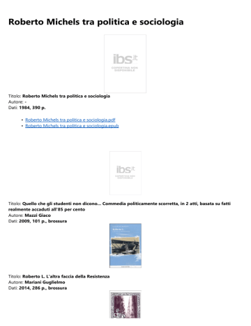 Roberto Michels tra politica e sociologia Titolo: Roberto Michels tra politica e sociologia Autore: Dati: 1984, 390 p. • Roberto Michels tra politica e sociologia.pdf • Roberto Michels tra politica e sociologia.epub Titolo: Quello che gli studenti non dicono... Commedia politicamente scorretta, in 2 atti, basata su fatti realmente accaduti all'85 per cento Autore: Mazzi Giaco Dati: 2009, 101 p., brossura Titolo: Roberto L. L'altra faccia della Resistenza Autore: Mariani Guglielmo Dati: 2014, 286 p., brossura Titolo: Il cunto de li cunti. Riscrittura di Roberto De Simone Autore: Basile Giambattista Dati: 2002, 2 voll., XLIII-949 p., ill., rilegato Titolo: Cola Ierofoni. Amori e politica nel secolo breve Autore: Tripodi Giuseppe Dati: 2014, 450 p., brossura Titolo: Utile solo ad andare oltre. Riflessioni politicamente scorrette di un giovane misantropo Autore: Casciotti Gianluca Dati: 2012, 112 p., brossura Titolo: Roberto Assagioli Autore: Giovetti Paola Dati: 1995, 144 p., ill. Titolo: Consiglio regionale e strumenti dell'integrazione politica Autore: De Martino Francesco R. Dati: 2008 Titolo: Rappresentanza politica e legge elettorale Autore: Dati: 2007, 380 p., brossura Titolo: La religione dell'antitrust. Riti e pratiche della politica della concorrenza Autore: Rockefeller Edwin S. Dati: 2011, 188 p., brossura Titolo: Dalla grande riforma alla politica delle istituzioni 2007 Autore: Atripaldi Vincenzo, Fichera Franco Dati: 2007, 201 p. Titolo: Il soggetto autore del reato. Aspetti criminologici, dogmatici e di politica criminale. Atti della Giornata di Studi... in ricordo di Alessandro Alberto Calvi Autore: Dati: 2013, 154 p., brossura