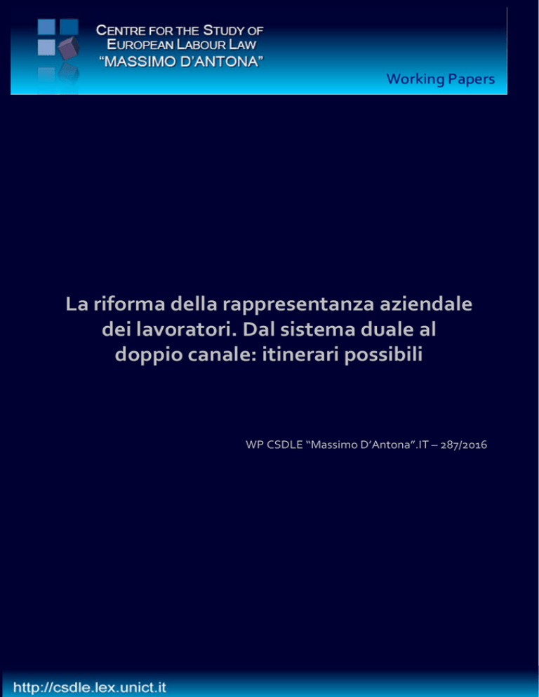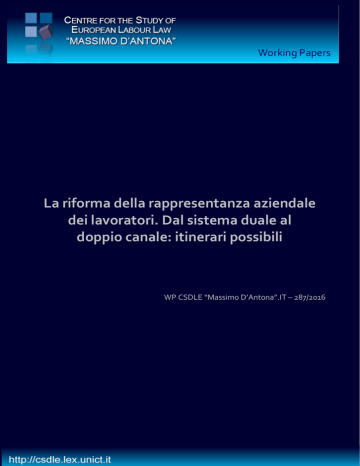 La riforma della rappresentanza aziendale dei lavoratori. Dal sistema duale al doppio canale: itinerari possibili WP CSDLE “Massimo D’Antona”.IT – 287/2016 Anna Alaimo 2016 Dipartimento di Giurisprudenza – Università di Catania [email protected] WP CSDLE MASSIMO D’ANTONA.IT - ISSN 1594-817X Centre for the Study of European Labour Law "MASSIMO D'ANTONA" , University of Catania On line journal, registered at Tribunale di Catania n. 1/2012 – 12.1.2012 Via Gallo, 25 – 95124 Catania (Italy) Tel: +39 095230855 – Fax: +39 0952507020 [email protected] http://csdle.lex.unict.it/workingpapers.aspx 1 La riforma della rappresentanza aziendale dei lavoratori. Dal sistema duale al doppio canale: itinerari possibili α αα Anna Alaimo Università di Catania 1. Il sistema duale della rappresentanza aziendale in Italia: tra passato, presente… ................................................................ 2 2. …e futuro. Ha ancora un senso sostenere la rappresentanza sindacale? Progetti di regolazione legale. ................................... 6 3. RSA e RSU: l’anomalia della dualità rispetto ai sistemi a “doppio canale”. Un primo fattore di anomalia: la comune matrice sindacale. .............................................................................. 8 4. Un secondo fattore: l’indistinzione funzionale fra RSA e RSU. . 13 5. Itinerari possibili per una rifondazione del sistema di rappresentanza aziendale: dal possibile riconoscimento legale di organismi di rappresentanza extra-sindacali alla necessaria articolazione funzionale del sistema. ....................................... 16 α Il presente scritto è destinato agli Studi in onore di Raffaele De Luca Tamajo. αα Mentre il lavoro era già in fase di pubblicazione le Confederazioni sindacali dei lavoratori hanno approvato il documento unitario “Un moderno sistema di relazioni industriali. Per un modello di sviluppo fondato sull’innovazione e la qualità del lavoro” (Cgil, Cisl e Uil, 14 gennaio 2016). Il documento avvalora una delle idee centrali di questo scritto, proponendo una riconversione del sistema di relazioni industriali e delle regole che ne governano il funzionamento basata sul coordinamento dei temi della rappresentanza, della contrattazione di secondo livello, della partecipazione dei lavoratori nelle imprese. WP C.S.D.L.E. "Massimo D'Antona" .IT - 287/2016 2 ANNA ALAIMO 1. Il sistema duale della rappresentanza aziendale in Italia: tra passato, presente… A distanza di due anni dalla sentenza della Corte costituzionale sull’art. 19 dello Statuto dei Lavoratori (SL) 1, le proposte di “legge sindacale” presentate all’inizio della XVII legislatura per disciplinare anche la rappresentanza aziendale dei lavoratori, sembrano avere ritmi di avanzamento lenti ed esiti incerti 2. Appare così accantonato il monito rivolto al legislatore dai giudici costituzionali nel fuggevole passaggio finale della sentenza n. 231/2013 3 in cui si suggerivano soluzioni regolative idonee a conformare a Costituzione la disposizione censurata. Ad eccezione di qualche recente e significativo rilancio 4, la questione della regolazione legale della rappresentanza aziendale – persino se ridotta all’esigenza di un aggiornamento normativo dell’art. 19 SL - sembra aver perso appeal negli ultimi due anni. Le ragioni di ciò sono di agevole lettura. 1 Corte cost. 23 luglio 2013, n. 231. Per un’analisi delle precedenti decisioni sull’art. 19 SL, v. CARINCI F., Il buio oltre la siepe: Corte costituzionale 23 luglio 2013, n. 231, DRI, 2013, 899; PERSIANI, Illegittimità costituzionale sopravvenuta dell’art. 19 della legge n. 300/1970, Giur.it., 2012, 1037; Id., Ancora sulla sopravvenuta illegittimità costituzionale dell’art. 19 della legge n. 300 del 1970, ADL, 2012, 1093; GARGIULO, Tensioni e distorsioni nella crisi del modello «statutario di rappresentanza sindacale in azienda», RIDL, 2013, 171. 2 Dall’inizio della XVII legislatura risultano presentate alla Camera le proposte C.5 (di iniziativa popolare) C.519 (Damiano ed altri), C. 709 (Airaudo ed altri), C. 1376 (Polverini), C.1549 (Tinagli ed altri); al Senato i d.d.l. 993 (Ichino ed altri), 986; 184 e 654. Per un quadro completo dei progetti v. anche le due proposte di legge sindacale formulate in ambito accademico: la proposta della rivista Diritti lavori mercati (Disciplina delle relazioni sindacali, della contrattazione collettiva e della partecipazione dei lavoratori), in DLM, 2014, 155, e la proposta di legge sindacale del gruppo di giuslavoristi denominato “Frecciarossa” (Caruso, De Luca Tamajo, Del Punta, Marazza, Maresca, Perulli, Romei, Scarpelli, Speziale) corredata dalle Linee guida di una disciplina legislativa di rappresentanza, rappresentatività sindacale ed efficacia dei contratti collettivi aziendali (di prossima pubblicazione in RIDL, 2015, 4, III). Per riferimenti ai vari d.d.l. attualmente all’esame delle due Camere v. ZOPPOLI L., Impresa e relazioni industriali dopo la guerra dei tre anni: verso una nuova legge sindacale? Considerazioni a valle di Corte Cost. 231/2013, DLM, 2013; MAGNANI, Le rappresentanze sindacali in azienda tra contrattazione collettiva e giustizia costituzionale. Prime riflessioni a partire da Corte costituzionale n. 231/2013, Working Paper ADAPT, 25 settembre 2013, n. 135. 3 ZOPPOLI L., Impresa e relazioni industriali dopo la guerra, cit. 4 Cfr. la proposta del gruppo di giuslavoristi denominato “Frecciarossa”, di più recente formulazione rispetto ai d.d.l. presentati all’inizio della corrente legislatura e alla proposta dei giuristi napoletani facenti capo alla rivista Diritti lavori mercati. Sulle generali condizioni di contesto favorevoli ad un intervento eteronomo sulla rappresentanza, v. CARUSO, Per un intervento eteronomo sulla rappresentanza sindacale: se non ora quando?, in ZOPPOLI L., ZOPPOLI A., DELFINO (a cura di), Una nuova Costituzione per il sistema di relazioni sindacali? Ed. 