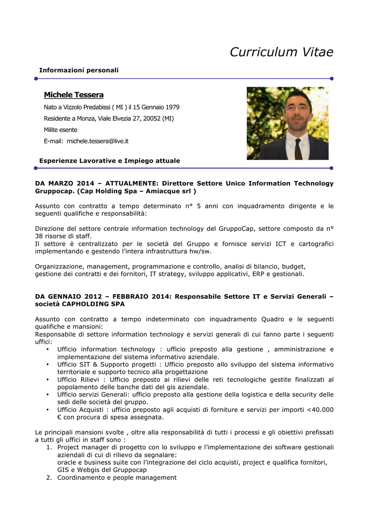 Curriculum Vitae Informazioni personali Michele Tessera Nato a Vizzolo Predabissi ( MI ) il 15 Gennaio 1979 Residente a Monza, Viale Elvezia 27, 20052 (MI) Milite esente E-mail: [email protected] Esperienze Lavorative e Impiego attuale DA MARZO 2014 – ATTUALMENTE: Direttore Settore Unico Information Technology Gruppocap. (Cap Holding Spa – Amiacque srl ) Assunto con contratto a tempo determinato n° 5 anni con inquadramento dirigente e le seguenti qualifiche e responsabilità: Direzione del settore centrale information technology del GruppoCap, settore composto da n° 38 risorse di staff. Il settore è centralizzato per le società del Gruppo e fornisce servizi ICT e cartografici implementando e gestendo l’intera infrastruttura hw/sw. Organizzazione, management, programmazione e controllo, analisi di bilancio, budget, gestione dei contratti e dei fornitori, IT strategy, sviluppo applicativi, ERP e gestionali. DA GENNAIO 2012 – FEBBRAIO 2014: Responsabile Settore IT e Servizi Generali – società CAPHOLDING SPA Assunto con contratto a tempo indeterminato con inquadramento Quadro e le seguenti qualifiche e mansioni: Responsabile di settore information technology e servizi generali di cui fanno parte i seguenti uffici: • Ufficio information technology : ufficio preposto alla gestione , amministrazione e implementazione del sistema informativo aziendale. • Ufficio SIT & Supporto progetti : Ufficio preposto allo sviluppo del sistema informativo territoriale e supporto tecnico alla progettazione • Ufficio Rilievi : Ufficio preposto ai rilievi delle reti tecnologiche gestite finalizzati al popolamento delle banche dati del gis aziendale. • Ufficio servizi Generali: ufficio preposto alla gestione della logistica e della security delle sedi delle società del gruppo. • Ufficio Acquisti : ufficio preposto agli acquisti di forniture e servizi per importi <40.000 € con procura di spesa assegnata. Le principali mansioni svolte , oltre alla responsabilità di tutti i processi e gli obiettivi prefissati a tutti gli uffici in staff sono : 1. Project manager di progetto con lo sviluppo e l’implementazione dei software gestionali aziendali di cui di rilievo da segnalare: oracle e business suite con l’integrazione del ciclo acquisti, project e qualifica fornitori, GIS e Webgis del Gruppocap 2. Coordinamento e people management 3. Gestione del ciclo acquisti con responsabilità di firma per importi < 40.000 € 4. Sviluppo capitolati speciali d’appalto di tutte le gare di forniture e servizi in gestione dal settore di cui sono responsabile 5. Assunzione ruolo di RUP per tutte le gare di cui al punto 4. 6. Ruolo di amministratore di sistema 7. Sviluppo modello organizzativo privacy aziendale. DA GENNAIO 2006 – DICEMBRE 2011 : Socio di capitali (50 %) e Direttore Tecnico di società a responsabilità limitata operante nell’ICT – RB SISTEMI SRL La società, che fornisce servizi informatici a 360 gradi, ha principalmente 3 unità operative: Assistenza Tecnica (direzione di sistemi informativi complessi), Sviluppo e manutenzione software, sviluppo e restailing siti web. La posizione ricoperta era di coordinamento, sviluppo e direzione di tutte le Business Unit con la responsabilità su ogni progetto o contratto e coordinamento e direzione dei tecnici e sistemisti dipendenti dell’azienda.(Project Manager di tutti i progetti di sviluppo applicativi, siti web e implementazioni datacenter). Gestiti circa 300 clienti , aziende private o enti pubblici, con la fornitura di consulenza informatica e mappatura dei processi aziendali per un corretto e metodologico sviluppo del sistema informativo. In amministrazione e in responsabilità circa 110 macchine virtuali, 7 datacenter e 570 client. Principali Progetti gestiti: • Azienda operante nel settore idrico (33 sedi sul terrotorio) Direzione progetto di creazione e messa in opera dei sistemi informativi dal 1 Gennaio 2011 al 1 Giugno 2011, con l’analisi e la gestione delle criticità, la preparazione e la gestione di tutti i fabbisogni compreso la fornitura di n° 90 postazioni utente, n° 1 centralino telefonico con relativi terminali, e del materiale necessario per l’implementazione del nuovo datacenter, l’implementazione del datacenter stesso e il porting della struttura pregressa in housing presso terzi. • Azienda operante nel settore idrico: (8 sedi sul territorio) Amministratore di sistema e responsabile dei sistemi informativi per un contratto di manutenzione ed amministrazione del sistema informativo composto da 18 SERVER e circa 200 client. Coordinamento fornitori di servizi afferenti i sistemi informativi. Sviluppo Applicativi per la gestione degli allacciamenti fognari e per la rendicontazione dei consumi elettrici su tutti i manufatti della rete fognaria ed acquedottistica Sviluppo e mantenimento sito internet del gruppo • S.p.a. operante nel mondo dell’ office automation: Amministratore di sistema e responsabile dei sistemi informativi per un Contratto di manutenzione ordinaria e straordinaria del sistema informativo composto da 6 server e 77 client. Mantenimento e coordinamento degli sviluppatori del programma gestionale aziendale “METODO”. • Associazione di categoria – Confindustria MB - Assolombarda Contratto di manutenzione triennale con responsabilità dei sistemi informativi, implementazione nuovo datacenter con tecnologia di virtualizzazione e manutenzione ordinaria e straordinaria. Da Ottobre 2005 a gennaio 2006 occupato presso società a responsabilità limitata operante nel settore ICT con qualifica di amministratore di sistemi con le seguenti mansioni. • Amministrazione ordinaria e straordinaria dei server microsoft e LINUX presenti nelle varie aziende clienti. • Proposte commerciali alle aziende clienti sull’ampliamento la manutenzione e la struttura delle reti. Vendita server/software/applicativi. • Installazione e configurazione di nuovi server microsoft (PDC, exchange server, web s