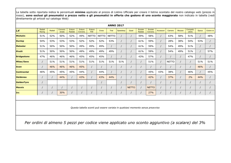La tabella sotto riportata indica le percentuali minime applicate al prezzo di Listino Ufficiale per creare il listino scontato del nostro catalogo web (prezzo in rosso), sono esclusi gli pneumatici a prezzo netto e gli pneumatici in offerta che godono di uno sconto maggiorato non indicato in tabella (vedi direttamente gli articoli sul catalogo Web) ANNO 2017 L4 Radiali Racing Radiali Convenz. strada Enduro Radiale Enduro Convenz. Enduro FIM Cross Trial Speedway Quad Scooter Radiale Scooter Convenz. Accessori Camere Mousse Competiz. (slick) Epoca Ciclom.re Michelin 51% 52% 50% 52% 49% NETTO NETTO NETTO / / 59% 58% / 63% 58% 51% / 48% Dunlop 54% 53% 53% 53% 52% 52% 52% 53% / / 61% 59% / 28% 38% 54% 53% / Metzeler 51% 50% 50% 50% 49% 49% 49% / / / 61% 59% / 54% 49% 51% / / Pirelli 51% 50% 50% 50% 49% 49% 49% 49% / / 61% 59% / 54% 49% 51% / 57% Bridgestone 47% 46% 46% 46% 45% 45% 45% / / / 43% 57% / / / 47% / / Mitas/Sava / 51% 51% 51% 51% 51% 51% 51% 51% / / 51% / NETTO / / 51% 51% Avon / 46% 46% 46% 45% / / / / / / / / / / / 46% / 46% 45% 45% 45% 44% / 44% / / / / 45% 43% 38% / 46% / 45% Heidenau / / 44% / 43% / 43% 44% / / / 42% / 37% / 2% 44% / GoldenTyre / / / / / / / / / / / Maxxis / / / / / / / / / NETTO / NETTO / / / / / / Irc / / 30% / / / / / / / / 27% / / / / / / Continental / Questa tabella sconti può essere variata in qualsiasi momento senza preavviso Per ordini di almeno 5 pezzi per codice viene applicato uno sconto aggiuntivo (a scalare) del 3%