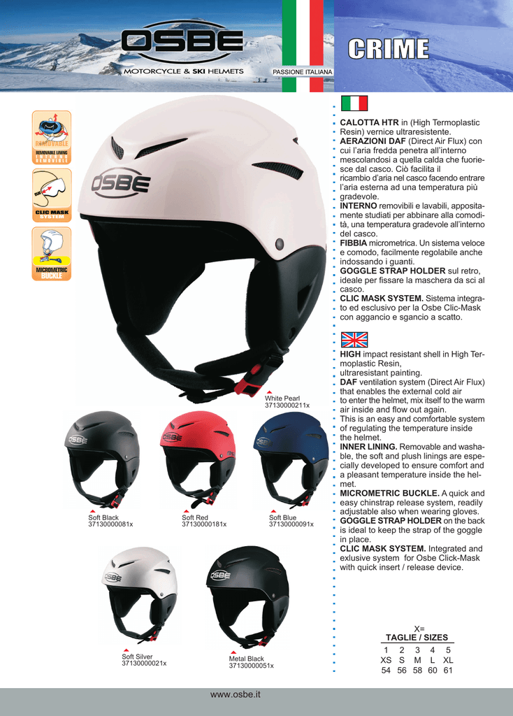 CRIME CALOTTA HTR in (High Termoplastic Resin) vernice ultraresistente. AERAZIONI DAF (Direct Air Flux) con cui l’aria fredda penetra all’interno mescolandosi a quella calda che fuoriesce dal casco. Ciò facilita il ricambio d’aria nel casco facendo entrare l’aria esterna ad una temperatura più gradevole. INTERNO removibili e lavabili, appositamente studiati per abbinare alla comodità, una temperatura gradevole all’interno del casco. FIBBIA micrometrica. Un sistema veloce e comodo, facilmente regolabile anche indossando i guanti. GOGGLE STRAP HOLDER sul retro, ideale per fissare la maschera da sci al casco. CLIC MASK SYSTEM. Sistema integrato ed esclusivo per la Osbe Clic-Mask con aggancio e sgancio a scatto. White Pearl 37130000211x Soft Black 37130000081x Soft Silver 37130000021x Soft Red 37130000181x Soft Blue 37130000091x Metal Black 37130000051x www.osbe.it HIGH impact resistant shell in High Termoplastic Resin, ultraresistant painting. DAF ventilation system (Direct Air Flux) that enables the external cold air to enter the helmet, mix itself to the warm air inside and flow out again. This is an easy and comfortable system of regulating the temperature inside the helmet. INNER LINING. Removable and washable, the soft and plush linings are especially developed to ensure comfort and a pleasant temperature inside the helmet. MICROMETRIC BUCKLE. A quick and easy chinstrap release system, readily adjustable also when wearing gloves. GOGGLE STRAP HOLDER on the back is ideal to keep the strap of the goggle in place. CLIC MASK SYSTEM. Integrated and exlusive system for Osbe Click-Mask with quick insert / release device. X= TAGLIE / SIZES 1 2 3 4 5 XS S M L XL 54 56 58 60 61 RICAMBI ACCESSORIES CRIME CRIME 54: Cod. 2727100011 56: Cod. 2727100012 58: Cod. 2727100013 60: Cod. 2727100014 61: Cod. 2727100015 CLIC MASK CLIC MARK DARK CLIC MASK ORANGE www.osbe.it CLIC MASK MIRROR