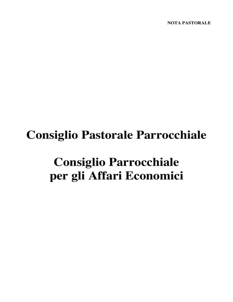 NOTA PASTORALE Consiglio Pastorale Parrocchiale Consiglio Parrocchiale per gli Affari Economici Presentazione Negli orientamenti per l’anno pastorale 2001-2002 avevo chiesto che in questi mesi tutte le parrocchie provvedessero a costituire il Consiglio Pastorale Parrocchiale. Si tratta, infatti, di uno strumento di comunione e di corresponsabilità che non deve mancare neppure nelle parrocchie più piccole. A sostegno di questo impegno e per contribuire ad un migliore funzionamento dei Consigli Pastorali Parrocchiali già costituiti, è parso bene al Consiglio Pastorale Diocesano – tenendo conto dell’esperienza maturata negli anni scorsi – di procedere ad una revisione dello Statuto, dal quale i Consigli traggano l’orientamento sicuro per la loro attività. Nel presentare e nell’approvare questo nuovo Statuto e nel ripresentare anche quello del Consiglio per gli Affari Economici, mi permetto di ricordare quanto papa Giovanni Paolo II ha scritto nella Esortazione apostolica Christifideles laici a proposito dell’impegno apostolico dei laici nella parrocchia: «Si abituino i laici a lavorare nella parrocchia intimamente uniti ai loro sacerdoti…». Questa corresponsabilità «deve trovare il suo adeguato e strutturato sviluppo nella valorizzazione più convinta, ampia e decisa dei Consigli Pastorali Parrocchiali» (n. 27). Come pure desidero sottolineare quanto il Papa afferma sulla “spiritualità di comunione”, senza la quale questi organismi “diventerebbero apparati senz’anima”: «La teologia e la spiritualità della comunione ispirano un reciproco ed efficace ascolto tra Pastori e fedeli, tenendoli da un lato, uniti a priori in tutto ciò che è essenziale, e spingendoli, dall’altro, a convergere normalmente anche nell’opinabile verso scelte ponderate e condivise.» (Novo Millennio Ineunte, 43.45). Sappiamo bene che i Consigli Pastorali e i Consigli per gli Affari Economici non sono assimilabili ad alcun organismo di partecipazione civile: essi sono nati in funzione di una partecipazione da trasformare in corresponsabilità pastorale. Questa richiede una rinnovata coscienza di Chiesa, del suo mistero e della sua missione. Intendo precisare che questo Statuto-tipo del Consiglio Pastorale Parrocchiale è normativo per tutte le parrocchie. Richiede, però, di essere adattato, nelle norme del regolamento, alle caratteristiche ed esigenze proprie delle singole comunità. Stabilisco inoltre che si provveda, nei prossimi anni, a far coincidere il rinnovo dei Consigli parrocchiali con il rinnovo del Consiglio Pastorale Diocesano. Con questa decisione vorrei anche dare stabilità e continuità di presenza ai delegati parrocchiali nelle Assemblee foraneali. Mentre ringrazio il Consiglio Pastorale Diocesano per il suo impegno, mi auguro che questi statuti possano assicurare ai Consigli parrocchiali una chiara impostazione e norme di funzionamento tali da rendere sempre più significativa ed efficace la loro esperienza. Pordenone, 8 febbraio 2002 + Ovidio Poletto, vescovo 2 STATUTO-TIPO del CONSIGLIO PASTORALE PARROCCHIALE Premessa Siamo consapevoli che la Chiesa è il popolo di Dio, radunato nel vincolo di comunione della Trinità e chiamato a continuare la missione di salvezza di Gesù Cristo nella storia. Gli organismi ecclesiali, dunque, vanno intesi come una forma storica di partecipazione e di corresponsabilità. Il loro autentico significato è comprensibile solo in una rinnovata coscienza di Chiesa. Nella struttura della comunità cristiana la ricchezza dello Spirito si rende visibile in compiti diversificati e stabili, a partire da quello del pastore che guida la comunità. La diversità non elimina l’uguale dignità, fondata sul Battesimo. Tutti i battezzati sono chiamati alla santità e a portare il proprio contributo all’opera della salvezza. Per vivere in maniera coerente e rinnovare il dono della comunione, ogni domenica la Chiesa celebra l’Eucaristia. In essa ogni comunità cristiana accoglie la Parola di Dio e il Pane della Vita, manifesta la sua identità e rafforza l’impegno per una coraggiosa missione evangelizzatrice. Gli organismi di partecipazione sono chiamati ad esprimere, sostenere e promuovere questo dinamismo di comunione. A tal fine è importante che il Consiglio Pastorale Parrocchiale rifletta, approfondisca e preghi per crescere nell’ascolto della Parola di Dio e delle parole degli uomini. Uno sforzo continuo di conversione, nella mentalità e negli atteggiamenti, da parte di tutti i suoi membri, qualifica l’attività consultiva del Consiglio. Non è semplice arrivare ad indicazioni unitarie quando c’è pluralità di modi di vedere. Il consenso andrà dunque cercato senza fretta, attraverso il confronto rispettoso e paziente, e ricordando che la preghiera consente una comunione più profonda. Art. 1 Costituzione Nella Parrocchia di ………………………… è costituito il Consiglio Pastorale Parrocchiale, come organismo di comunione e di corresponsabilità, a servizio della comunità parrocchiale, per la crescita della Chiesa e la sua missione nel mondo. È formato da cristiani che si impegnano a vivere l’adesione di fede a Gesù Cristo, ad ispirare le loro scelte al Vangelo e a partecipare alla vita ecclesiale. Art. 2 Funzione Il Consiglio Pastorale Parrocchiale ha funzione consultiva. Le sue proposte devono essere frutto di un discernimento compiuto insieme, sotto la guida dello Spirito. E pertanto, specialmente se espresse a larga maggioranza, sono pastoralmente impegnative. Art. 3 Compiti I compiti del Consiglio Pastorale Parrocchiale sono: a) conoscere e analizzare la realtà della Parrocchia e del territorio; b) promuovere, sostenere, coordinare e verificare tutta l’azione pastorale della Parrocchia, in armonia con il piano pastorale diocesano e le indicazioni della Forania, tenendo conto dell’Unità Pastorale di appartenenza; c) favorire la comunione di associazioni, movimenti e gruppi parrocchiali tra loro 
