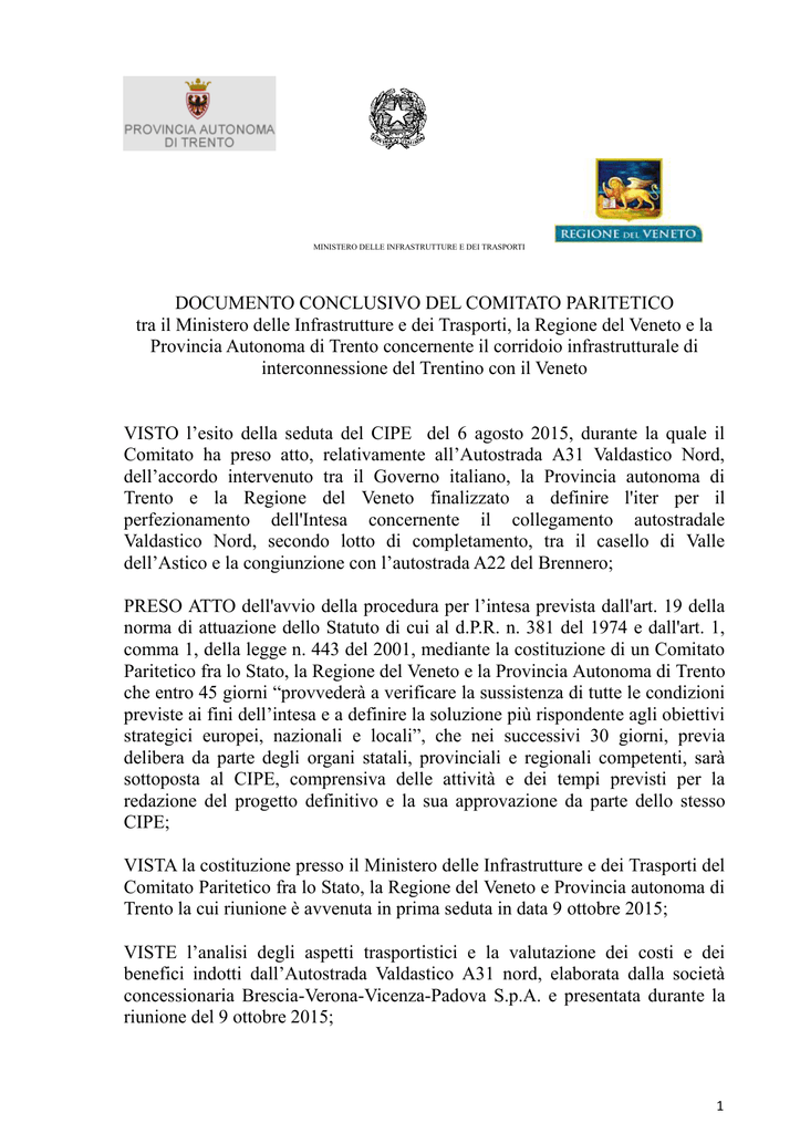MINISTERO DELLE INFRASTRUTTURE E DEI TRASPORTI DOCUMENTO CONCLUSIVO DEL COMITATO PARITETICO tra il Ministero delle Infrastrutture e dei Trasporti, la Regione del Veneto e la Provincia Autonoma di Trento concernente il corridoio infrastrutturale di interconnessione del Trentino con il Veneto VISTO l’esito della seduta del CIPE del 6 agosto 2015, durante la quale il Comitato ha preso atto, relativamente all’Autostrada A31 Valdastico Nord, dell’accordo intervenuto tra il Governo italiano, la Provincia autonoma di Trento e la Regione del Veneto finalizzato a definire l'iter per il perfezionamento dell'Intesa concernente il collegamento autostradale Valdastico Nord, secondo lotto di completamento, tra il casello di Valle dell’Astico e la congiunzione con l’autostrada A22 del Brennero; PRESO ATTO dell'avvio della procedura per l’intesa prevista dall'art. 19 della norma di attuazione dello Statuto di cui al d.P.R. n. 381 del 1974 e dall'art. 1, comma 1, della legge n. 443 del 2001, mediante la costituzione di un Comitato Paritetico fra lo Stato, la Regione del Veneto e la Provincia Autonoma di Trento che entro 45 giorni “provvederà a verificare la sussistenza di tutte le condizioni previste ai fini dell’intesa e a definire la soluzione più rispondente agli obiettivi strategici europei, nazionali e locali”, che nei successivi 30 giorni, previa delibera da parte degli organi statali, provinciali e regionali competenti, sarà sottoposta al CIPE, comprensiva delle attività e dei tempi previsti per la redazione del progetto definitivo e la sua approvazione da parte dello stesso CIPE; VISTA la costituzione presso il Ministero delle Infrastrutture e dei Trasporti del Comitato Paritetico fra lo Stato, la Regione del Veneto e Provincia autonoma di Trento la cui riunione è avvenuta in prima seduta in data 9 ottobre 2015; VISTE l’analisi degli aspetti trasportistici e la valutazione dei costi e dei benefici indotti dall’Autostrada Valdastico A31 nord, elaborata dalla società concessionaria Brescia-Verona-Vicenza-Padova S.p.A. e presentata durante la riunione del 9 ottobre 2015; 1 CONSIDERATO che nella seduta del Comitato Paritetico del 9 ottobre 2015, la Provincia autonoma di Trento ha rappresentato il permanere della contrarietà della Provincia stessa alla realizzazione dell’opera, in considerazione principalmente della priorità che la Provincia, in ossequio alla Convenzione delle Alpi, assegna al trasporto merci via ferrovia. È stato, pertanto, richiesto un quadro di analisi più ampio, volto a descrivere su scala europea, nazionale e locale gli scenari di evoluzione della mobilità e dei modelli trasportistici, sia stradali che ferroviari, e che tenga conto delle previsioni di traffico: - stradale e ferroviario, merci e passeggeri, bassa, media e lunga percorrenza; - su tutto l’arco alpino e non solo al valico del Brennero; - senza e con le infrastrutture ferroviarie e viarie in costruzione o in progettazione; - senza e con le misure volte a potenziare l’intermodalità e la sostenibilità del trasporto merci attraverso le Alpi. L’analisi dovrebbe inoltre comprendere previsioni aggiornate in merito ai costi e ai tempi di attuazione della Galleria di base del Brennero e delle aste di accesso nonché dei principali terminali merci di interscambio. La Provincia ha altresì evidenziato la necessità di acquisire dati più aggiornati e dettagliati in merito ai flussi di traffico merci e passeggeri tra il Veneto e il Trentino; CONSIDERATO che la Regione del Veneto ha condiviso l’esigenza di disporre delle informazioni di dettaglio richieste dalla Provincia autonoma di Trento, segnalando al contempo che la Regione del Veneto si è impegnata a razionalizzare la rete stradale e autostradale di adduzione al Trentino, anche attraverso la revisione di alcune opere in project financing. La Regione del Veneto ha altresì evidenziato che la situazione attuale delle rete stradale non può essere considerata una opzione accettabile, in considerazione dei fenomeni di congestione che interessano la zona pedemontana veneta; CONSIDERATO che, alla luce delle richieste della Provincia autonoma di Trento e della Regione del Veneto, il Ministero delle Infrastrutture e dei Trasporti ha elaborato gli approfondimenti richiesti, in termini di scenario, anche al fine di garantire la terzietà dei dati e dei risultati; VISTA la documentazione elaborata dal Ministero delle Infrastrutture e dei Trasporti e trasmessa alla Regione del Veneto ed alla Provincia autonoma di Trento in data 10 novembre 2015; CONSIDERATO che, nella seconda riunione del Comitato Paritetico del 26 novembre 2015, la Provincia autonoma di Trento e la Regione del Veneto hanno chiesto ulteriori approfondimenti allo studio elaborato dal Ministero delle Infrastrutture e dei Trasporti; 2 VISTA la documentazione integrativa trasmessa dal Ministero delle Infrastrutture e dei Trasporti in data 21 gennaio 2016, contenente gli ulteriori approfondimenti richiesti; CONSIDERATO che, in linea con le politiche di trasporto europee e nazionali, il rafforzamento dell’opzione ferroviaria con il tunnel di base del Brennero e l’accesso allo stesso valico costituiscono elemento prioritario e si realizzano attraverso le misure volte ad assicurare un concreto avanzamento nella progettazione e realizzazione delle opere ferroviarie della tratta a sud del Brennero, in particolare della circonvallazione di Trento; CONSIDERATE le ipotesi di scenario alternative, di interconnessione del Trentino con il Veneto, emergenti dalla documentazione esaminata dal Comitato paritetico; CONSIDERATO che il Comitato Paritetico ha individuato uno scenario di comune interesse che riguarda i collegamenti trasportistici tra la Provincia Autonoma di Trento e l’area del Veneto Centrale; CONSIDERATO che tale scenario si articola, in sostanza, su: - un corridoio di collegamento viario tra la Valle dell’Astico, Valsugana e Valle dell’Adige; - un’ottimizzazione dei